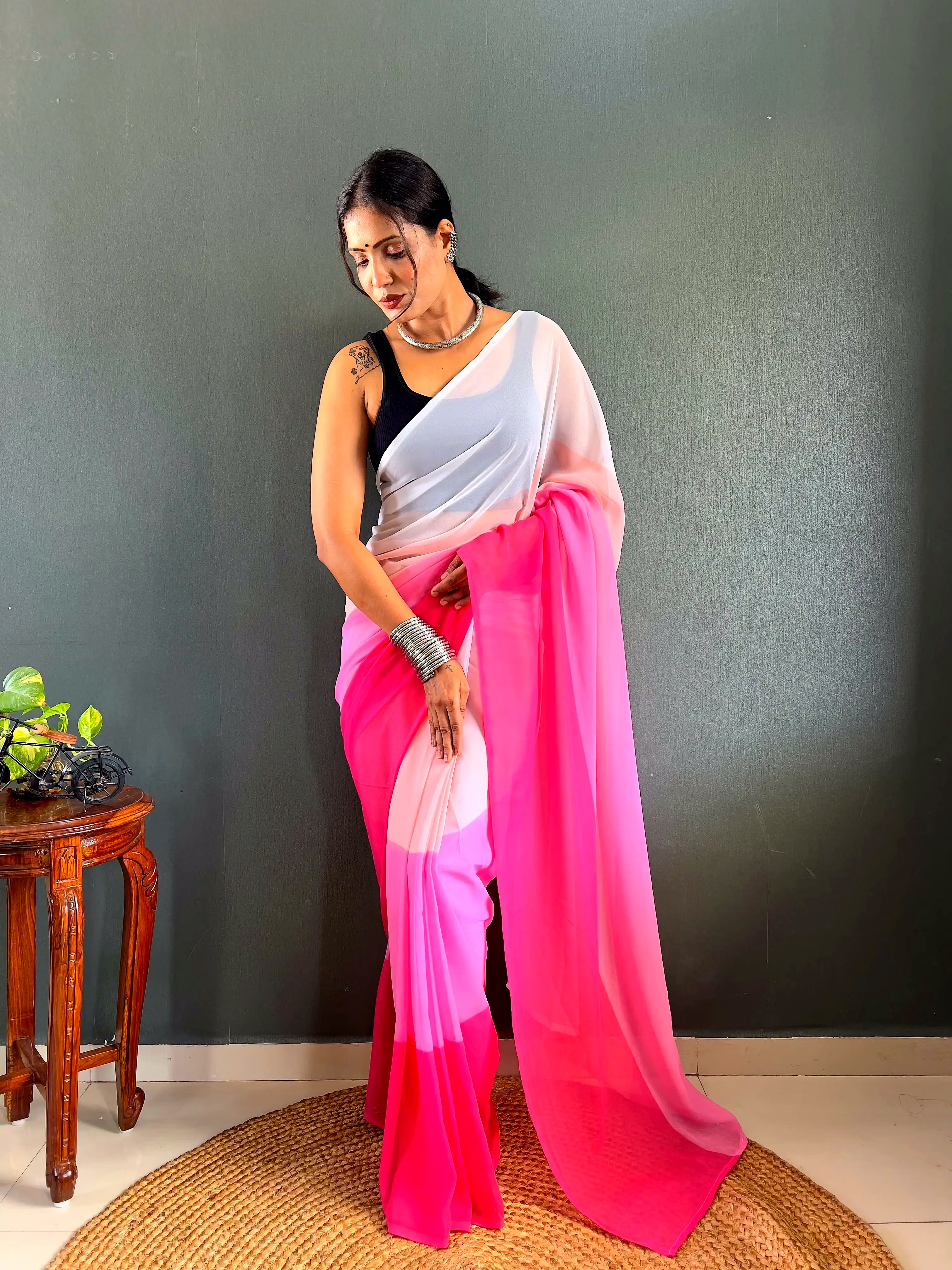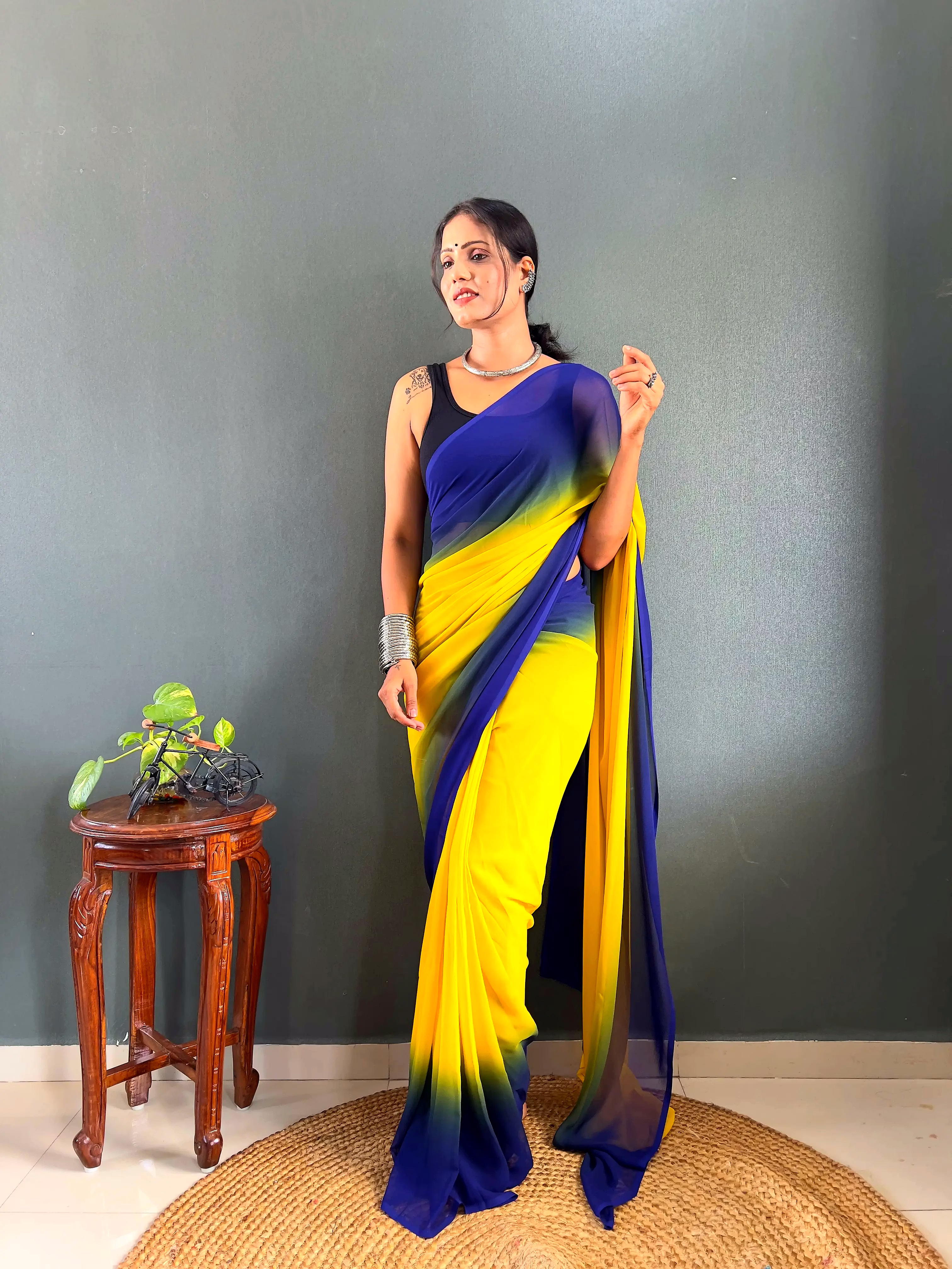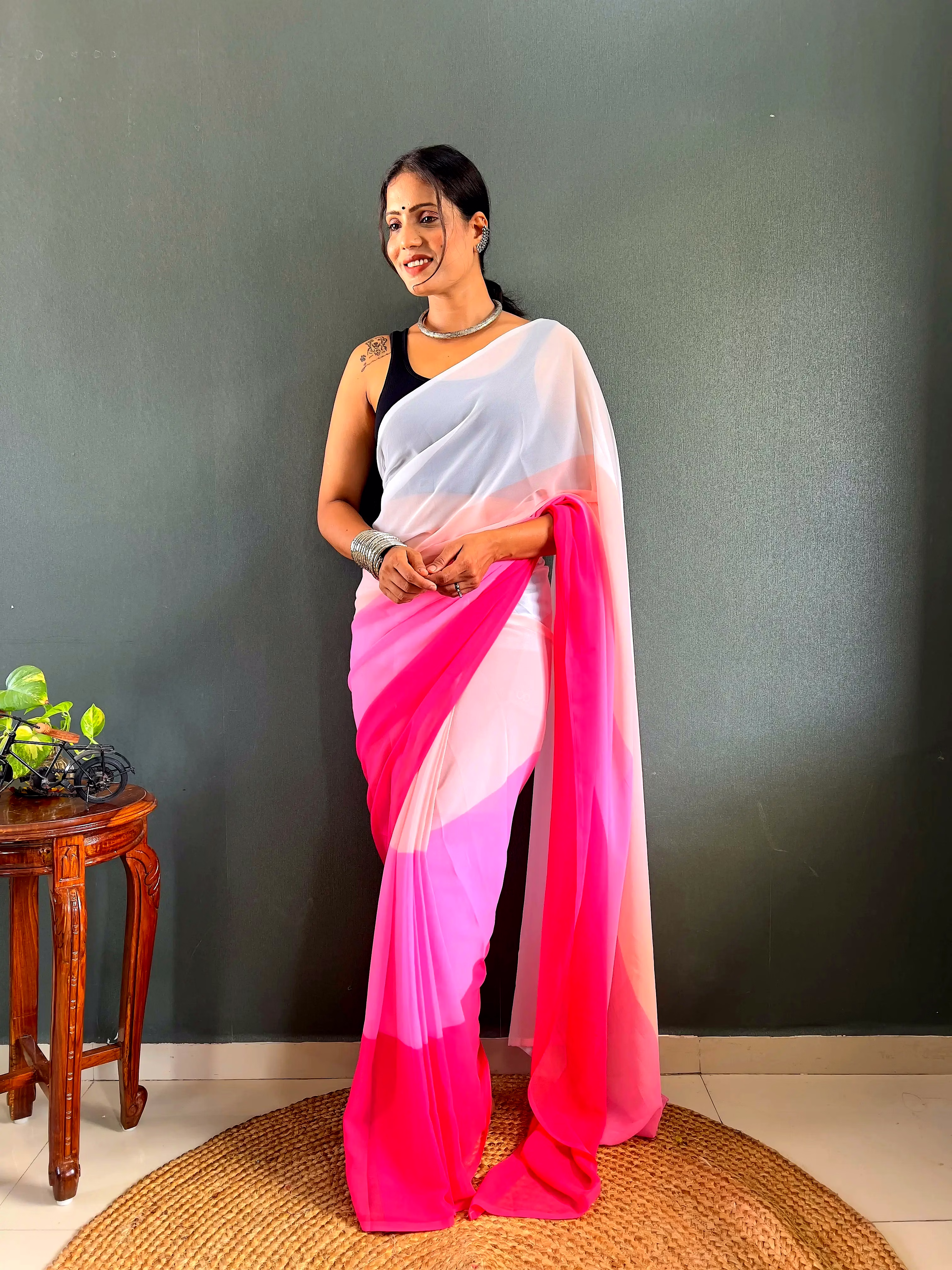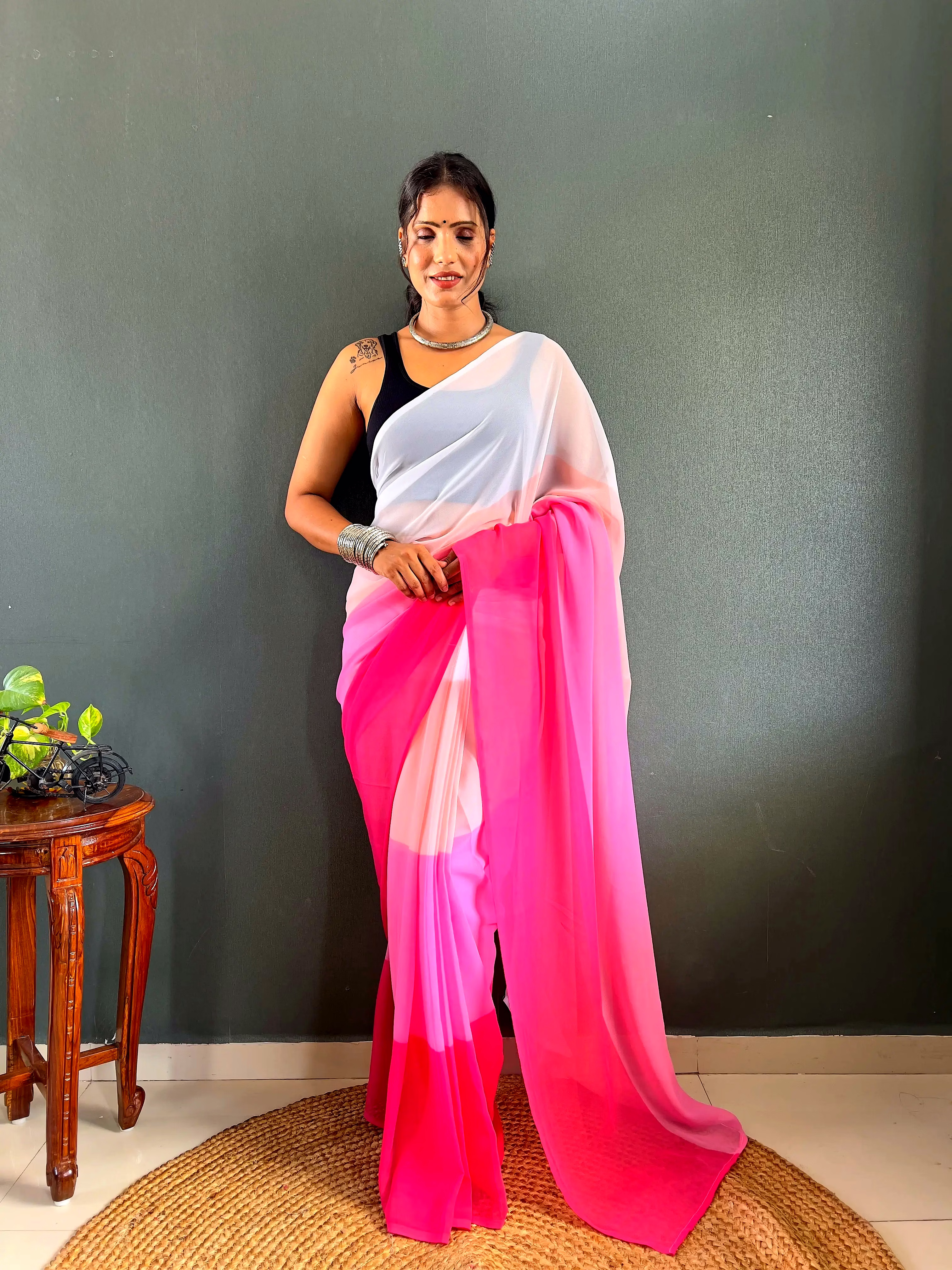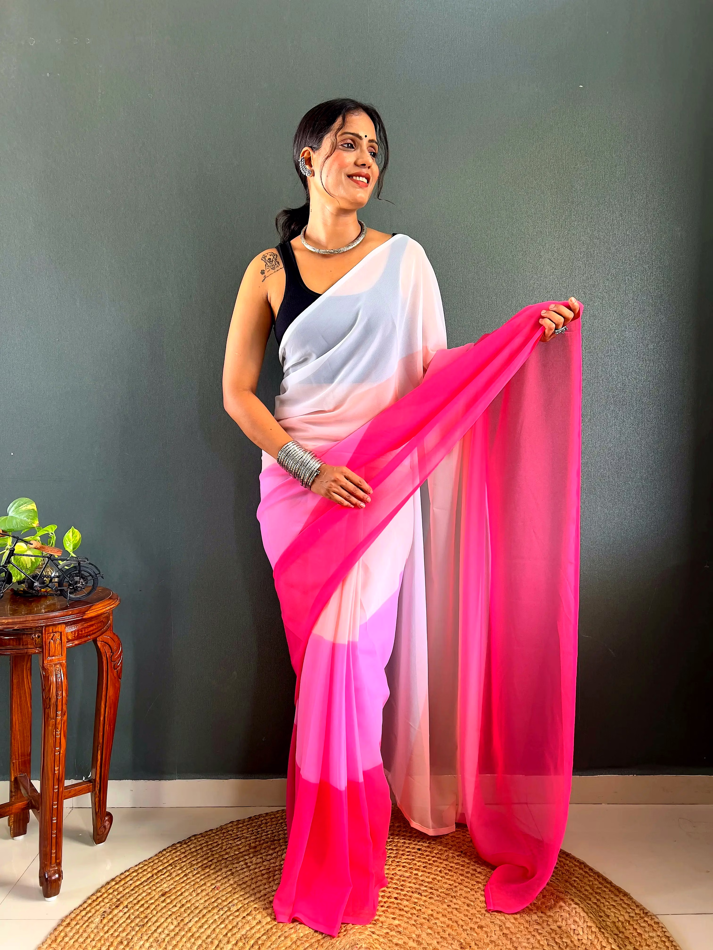 Elevate your style effortlessly with our Dual Tone Georgette Ready to Wear Saree. Embrace convenience and elegance in one stunning piece.