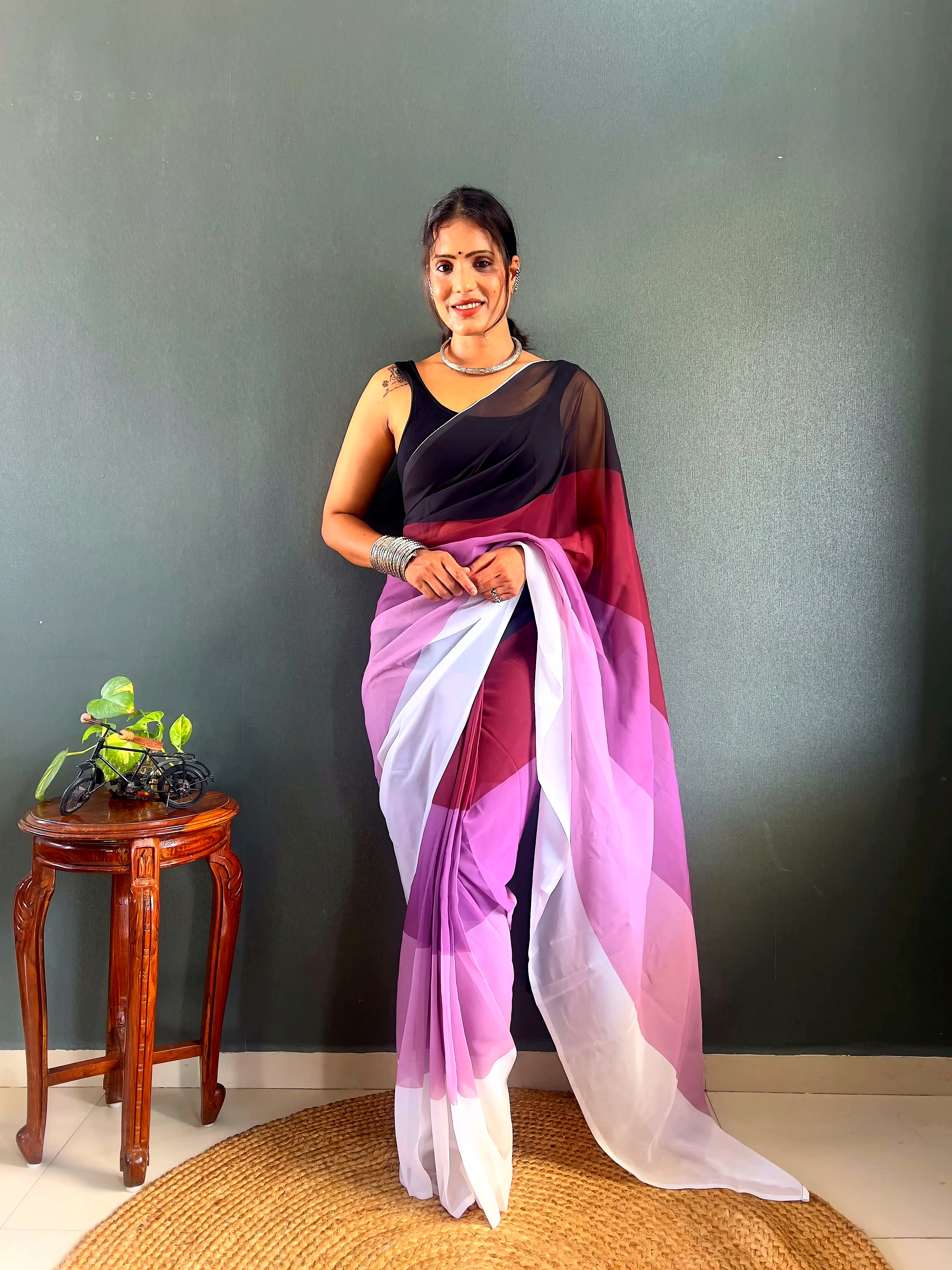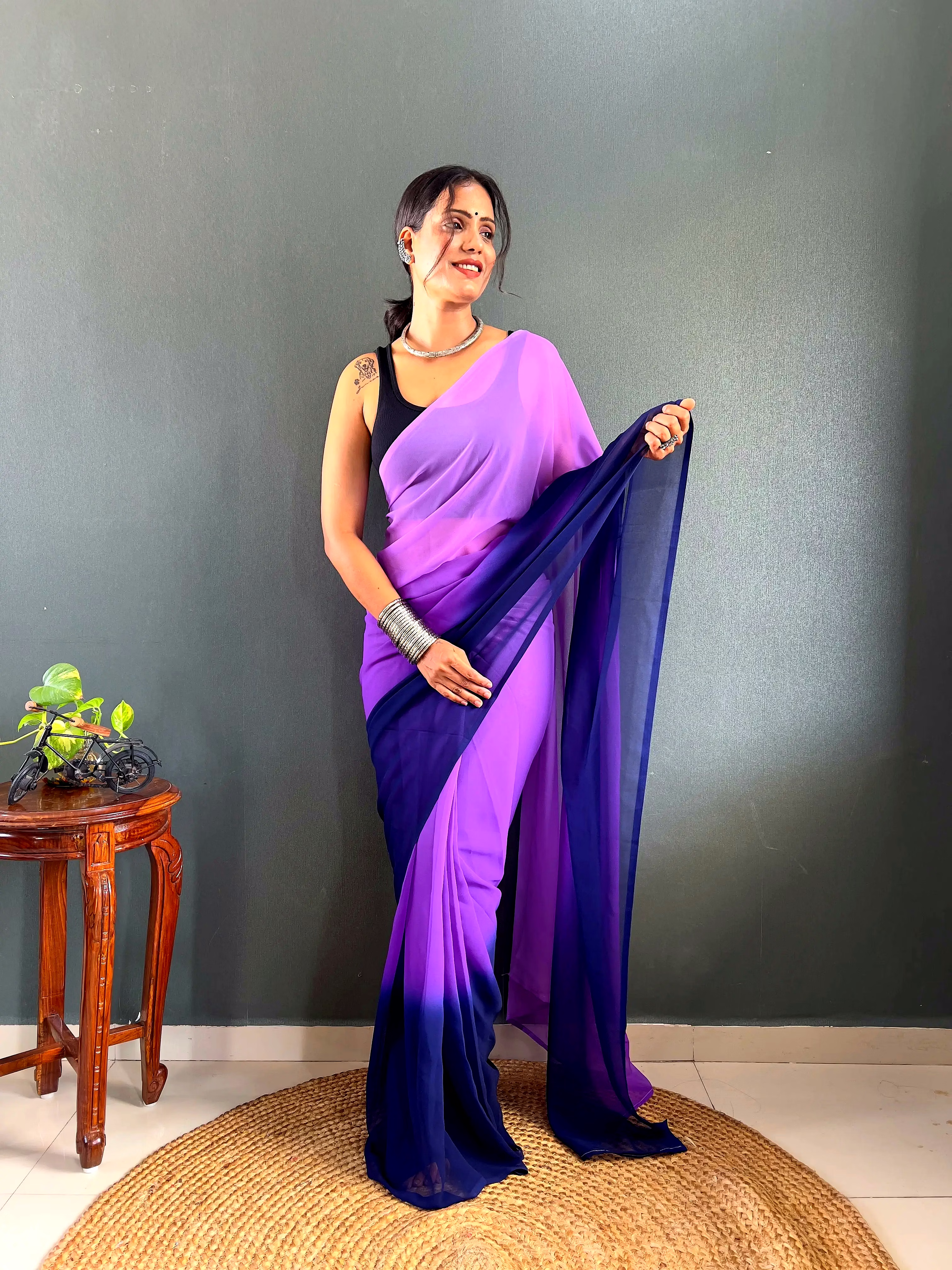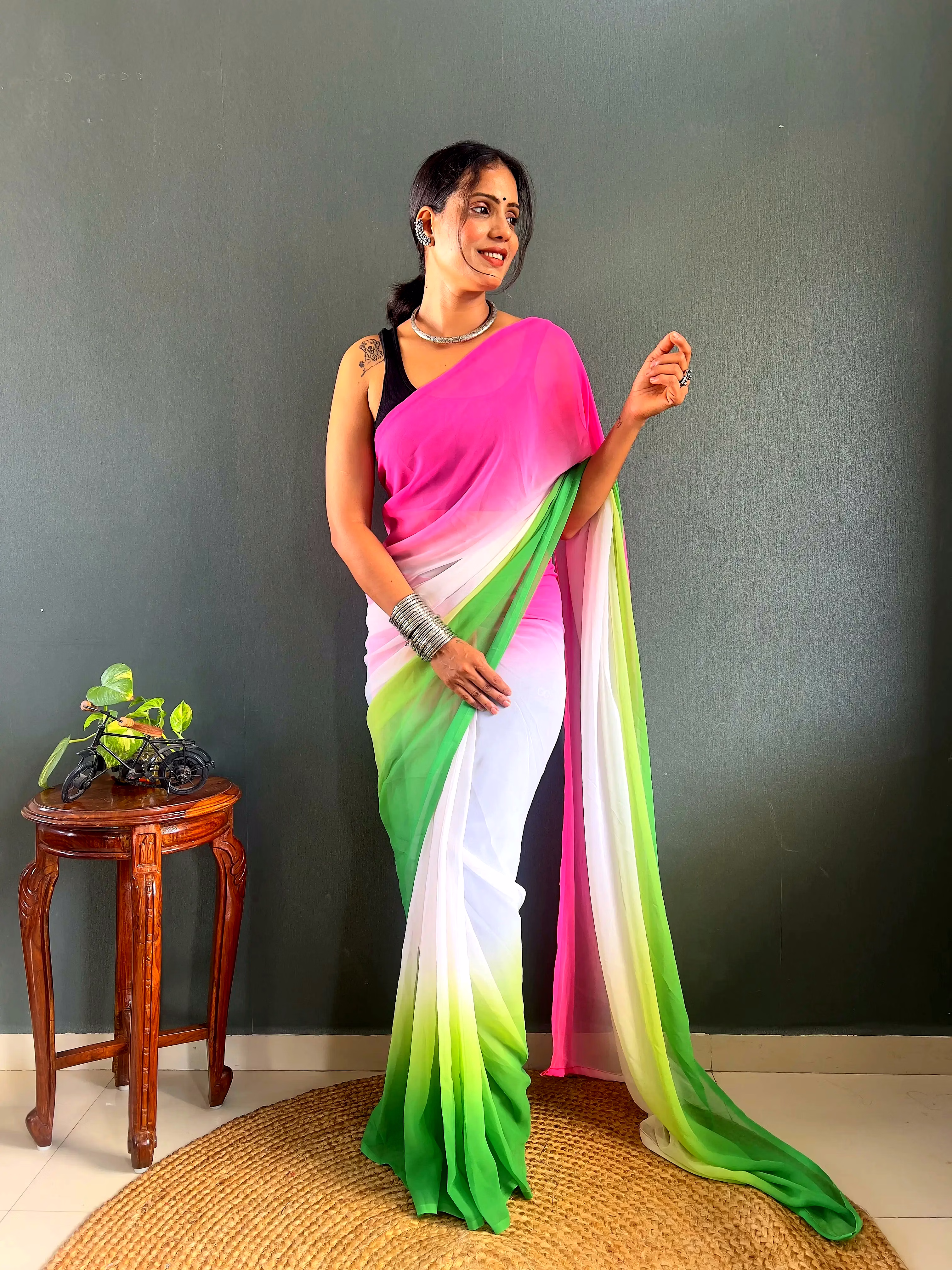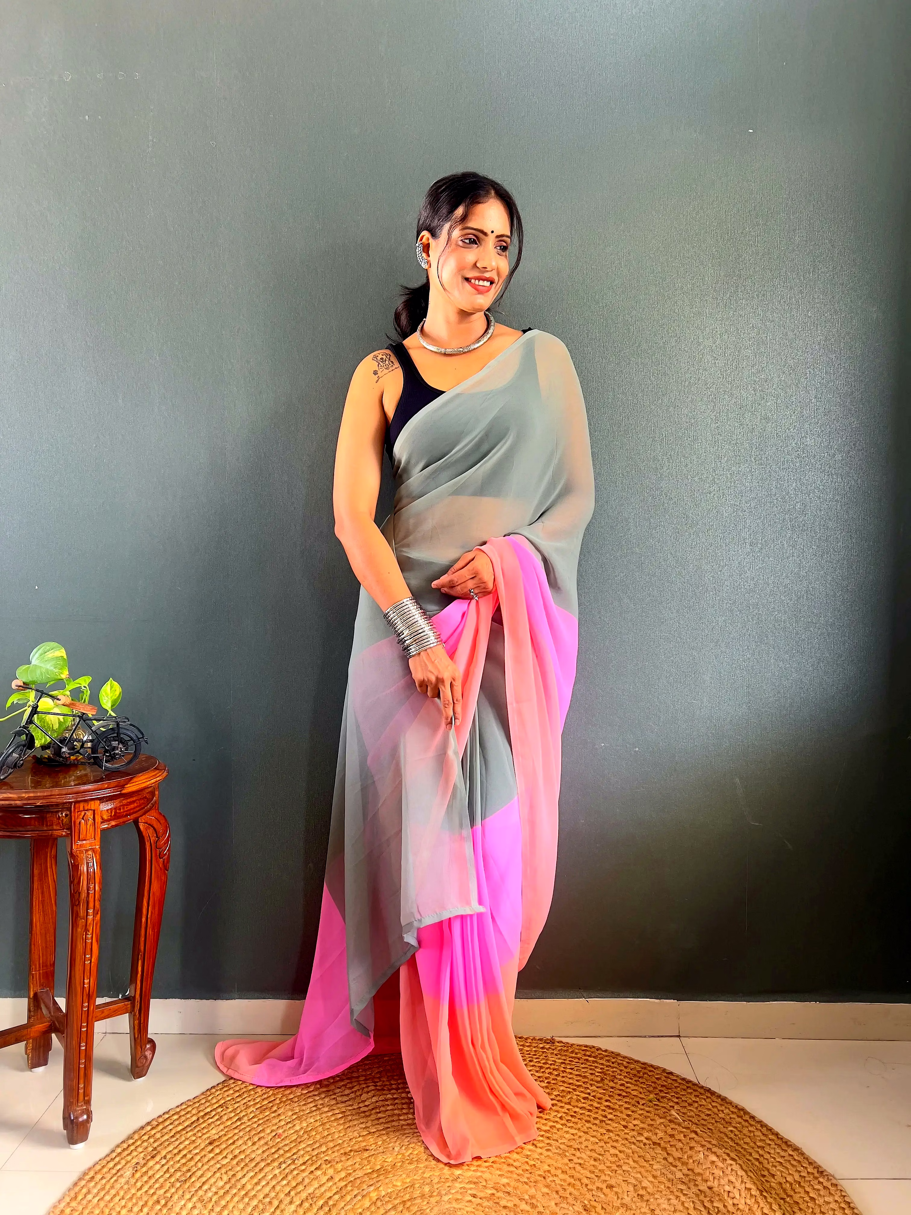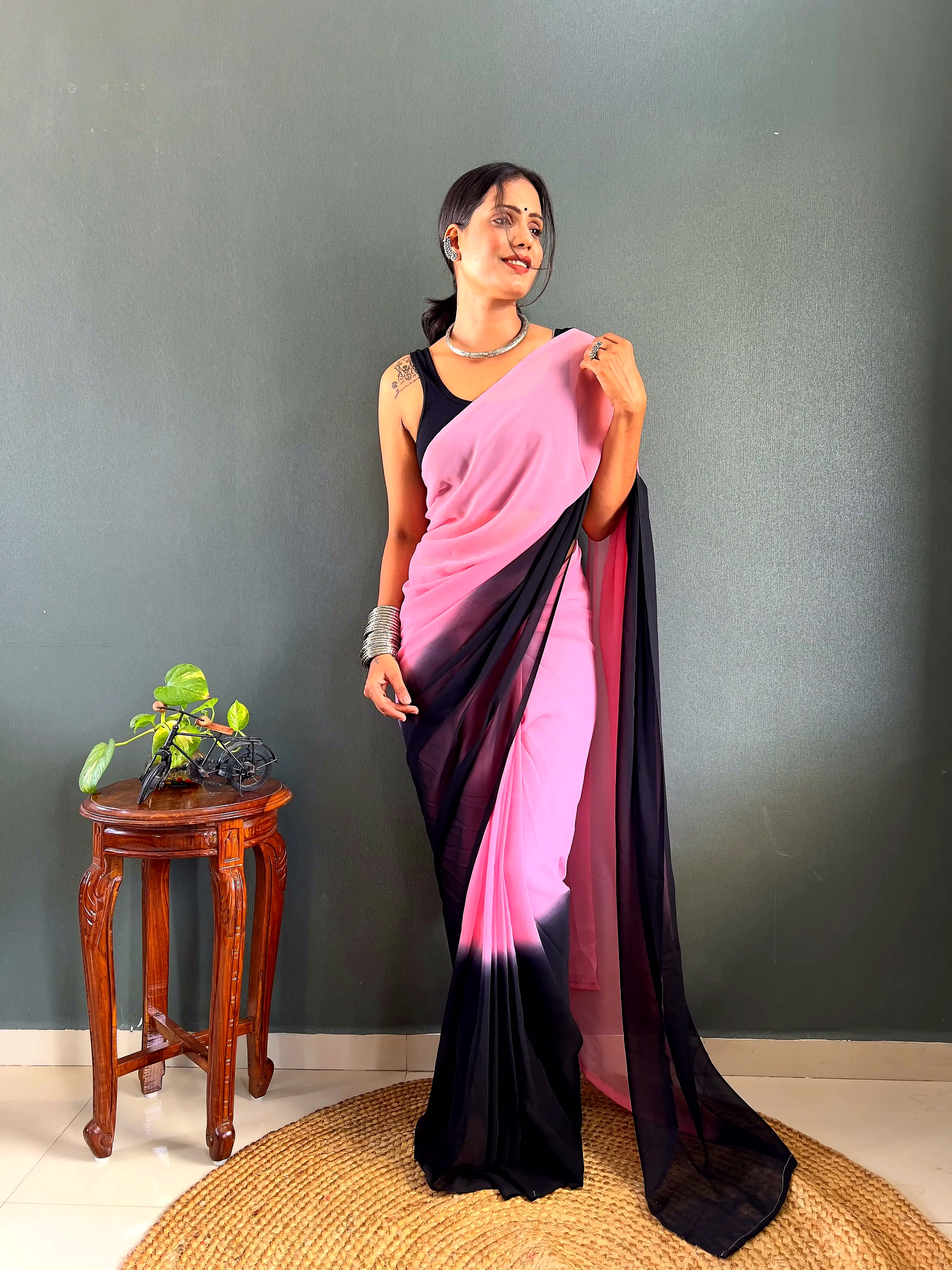 Elevate your style effortlessly with our Dual Tone Georgette Ready to Wear Saree. Embrace convenience and elegance in one stunning piece.