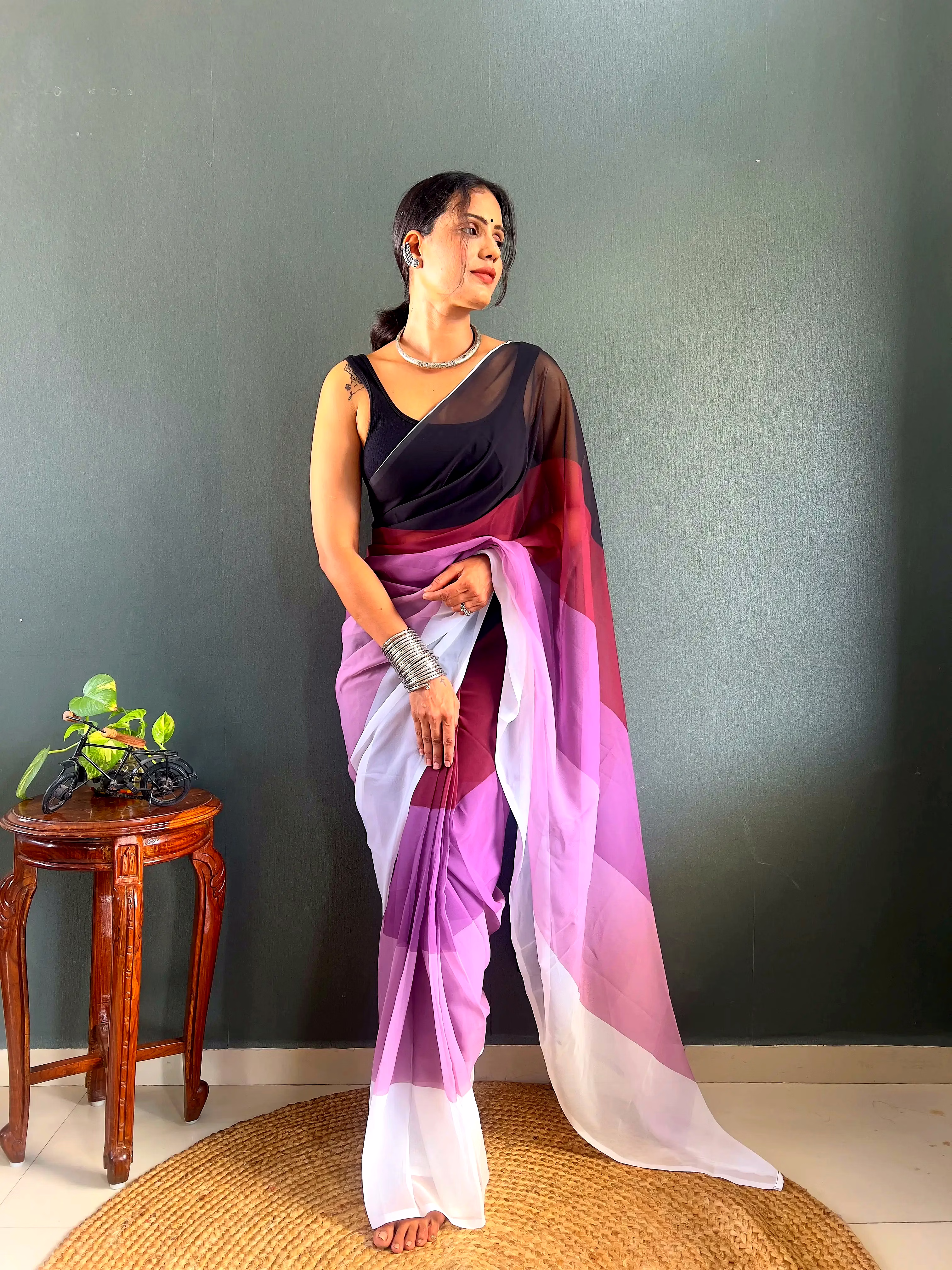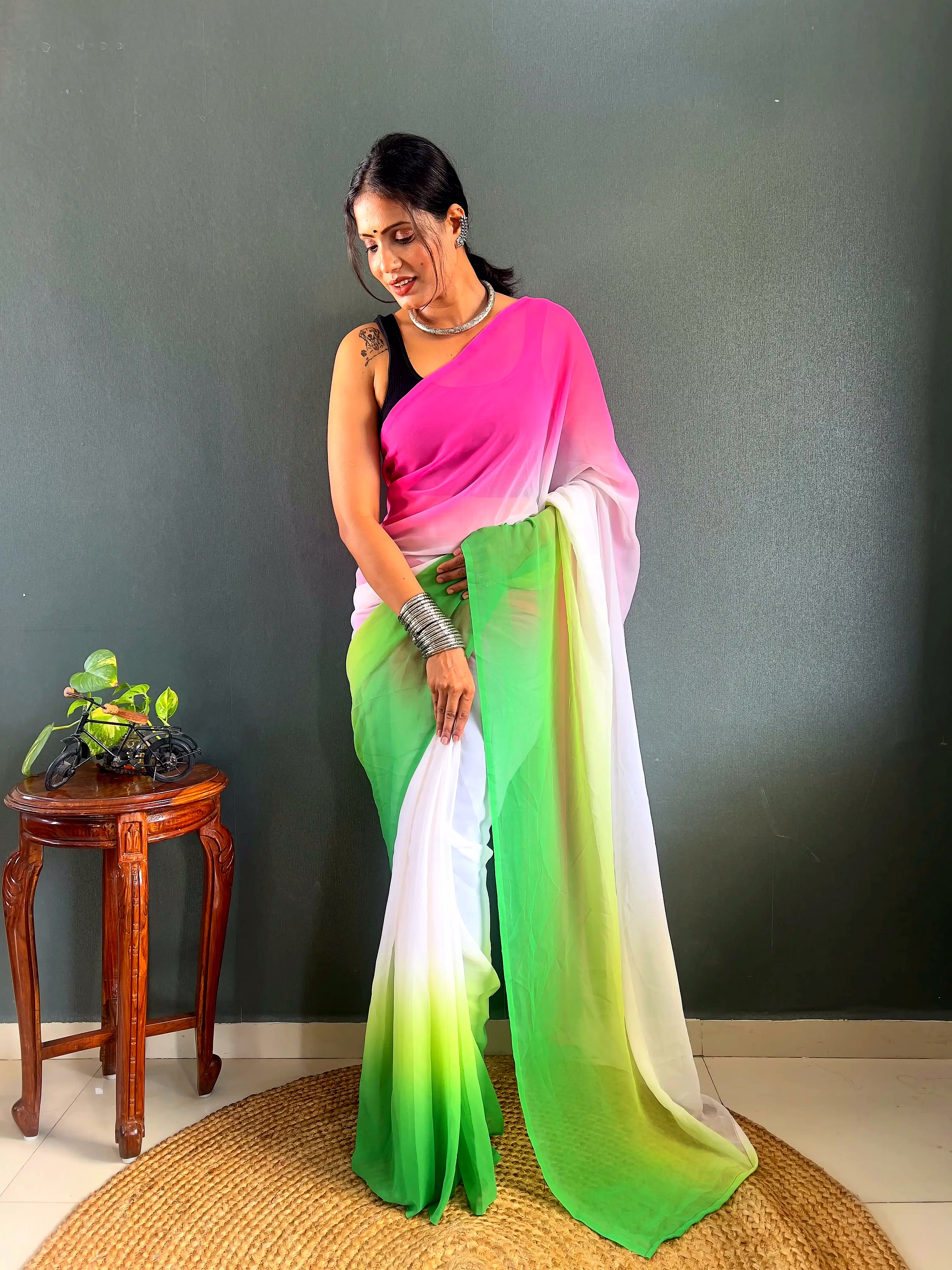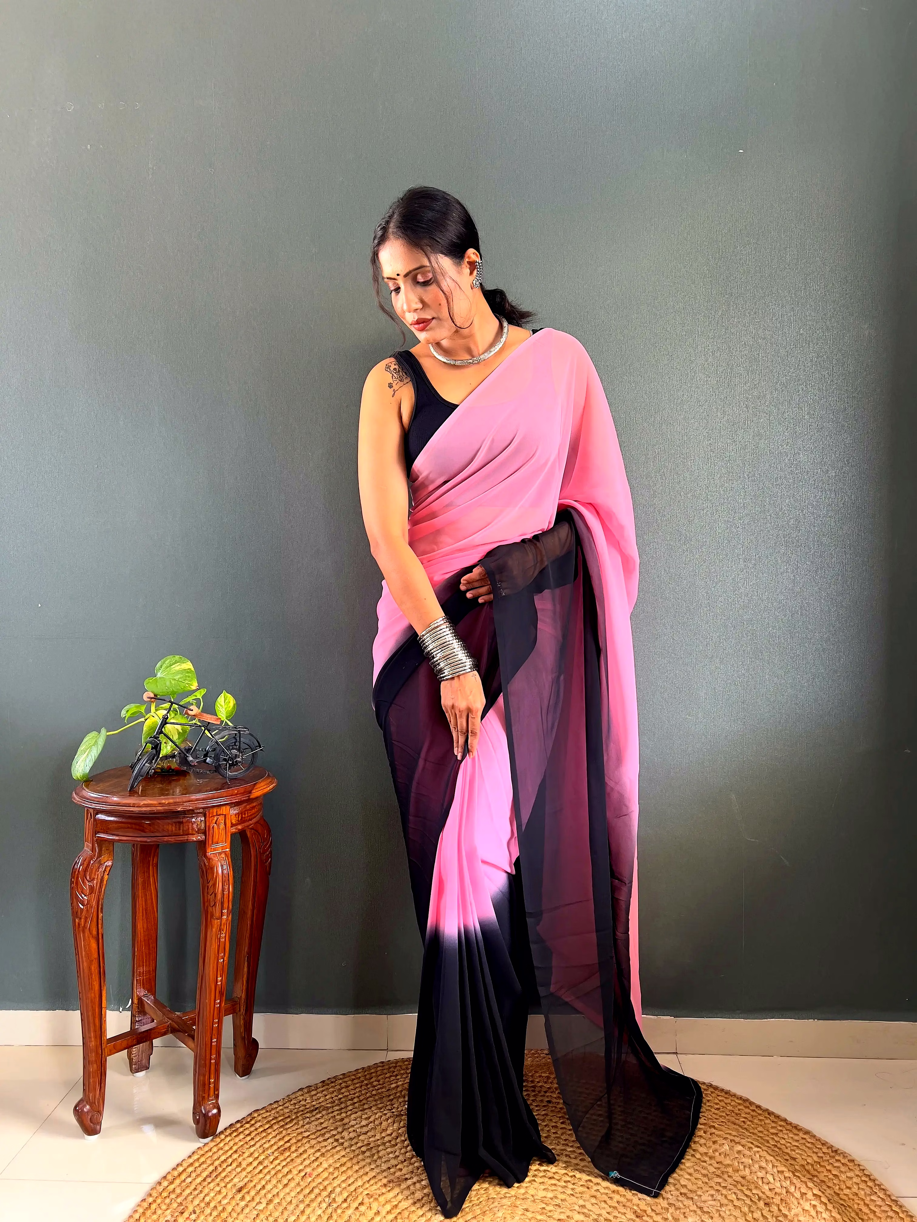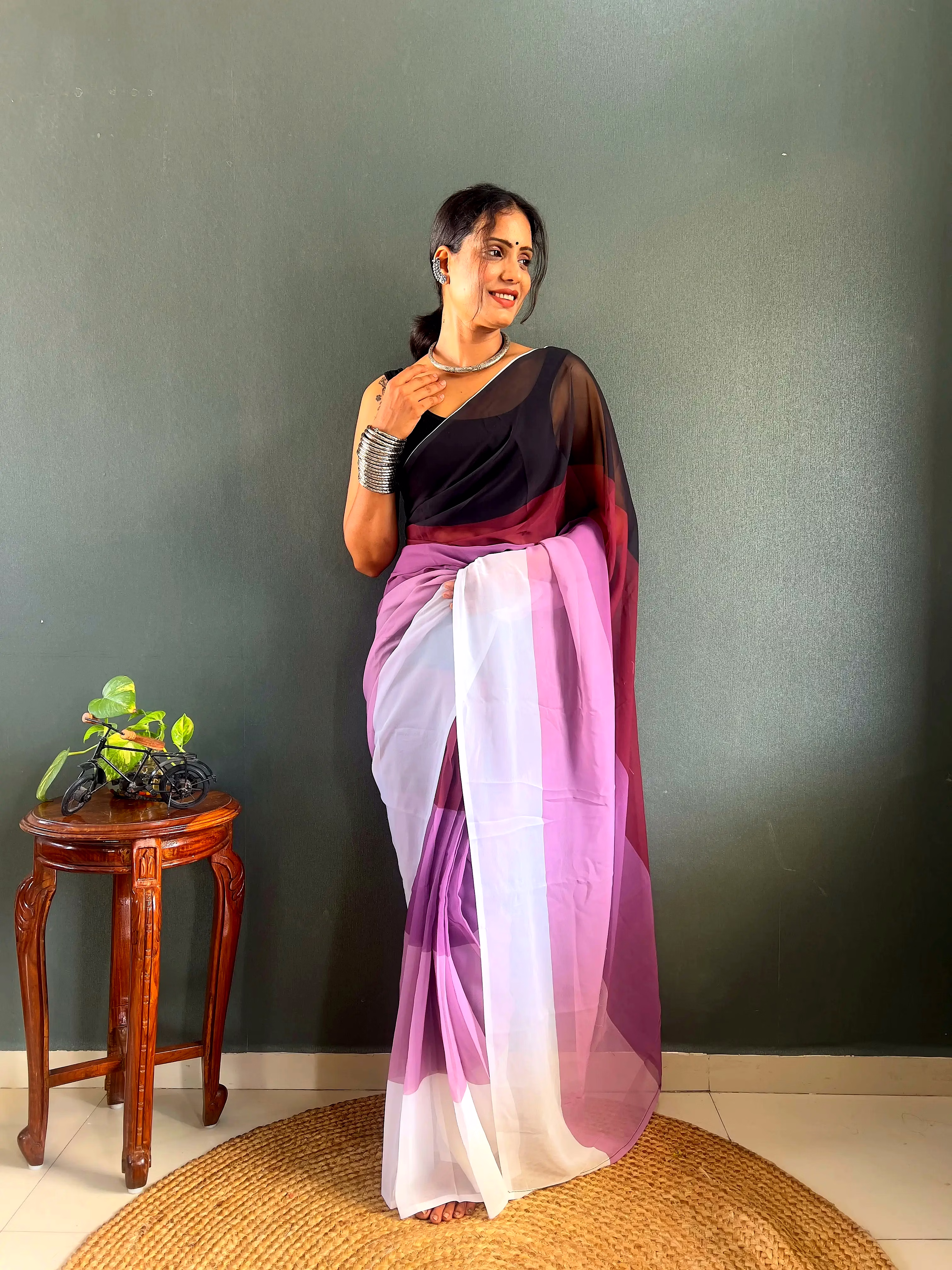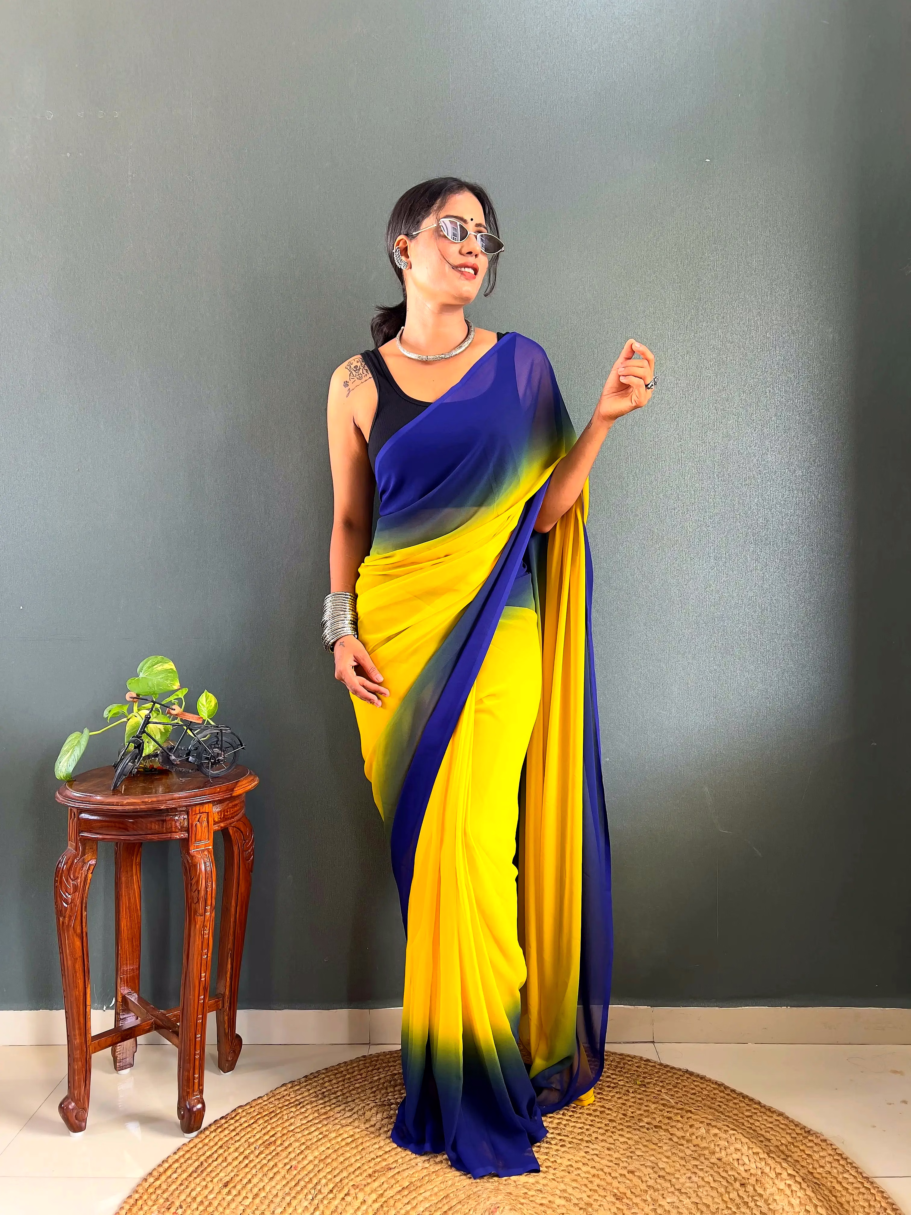 Elevate your style effortlessly with our Dual Tone Georgette Ready to Wear Saree. Embrace convenience and elegance in one stunning piece.