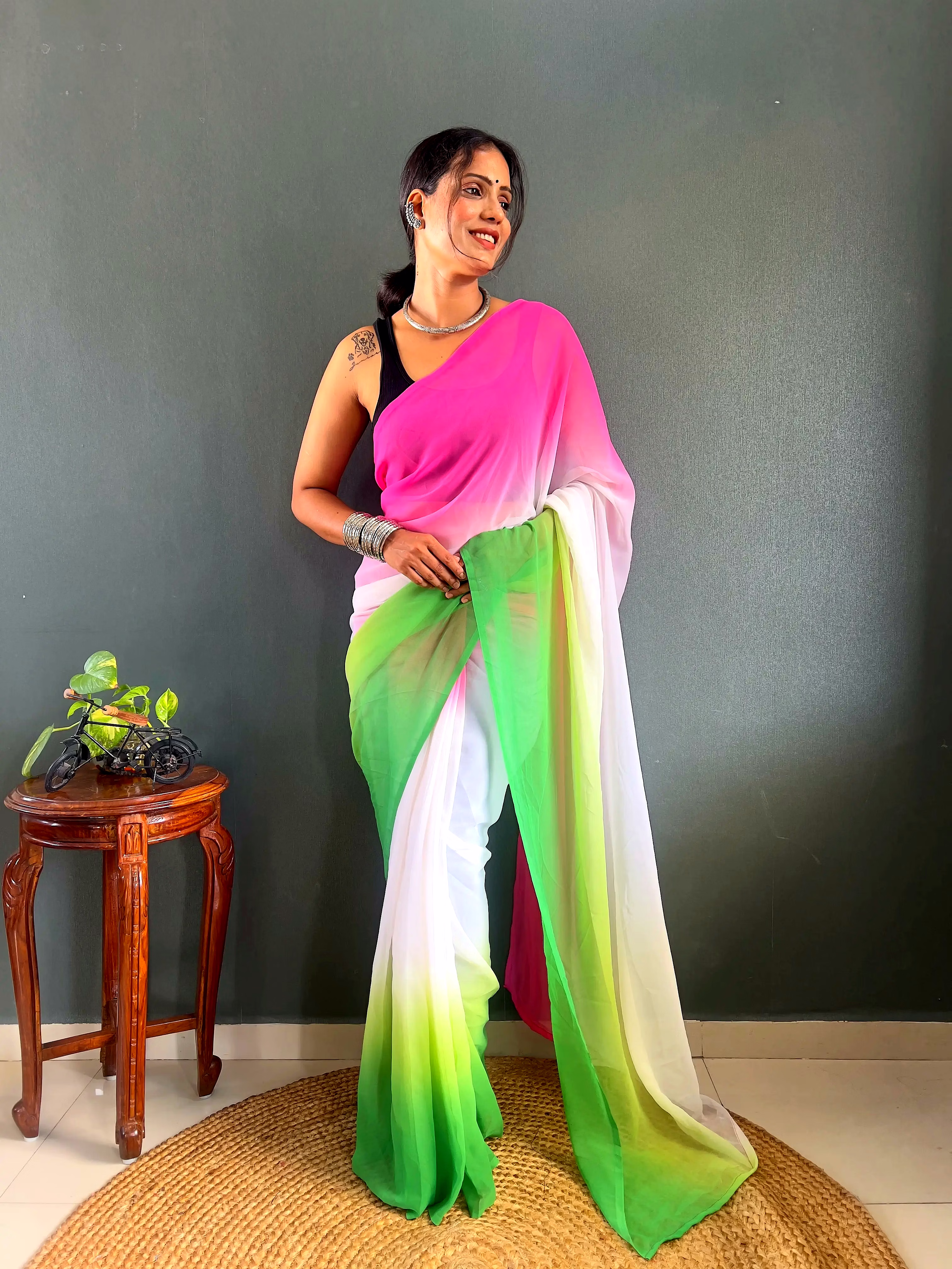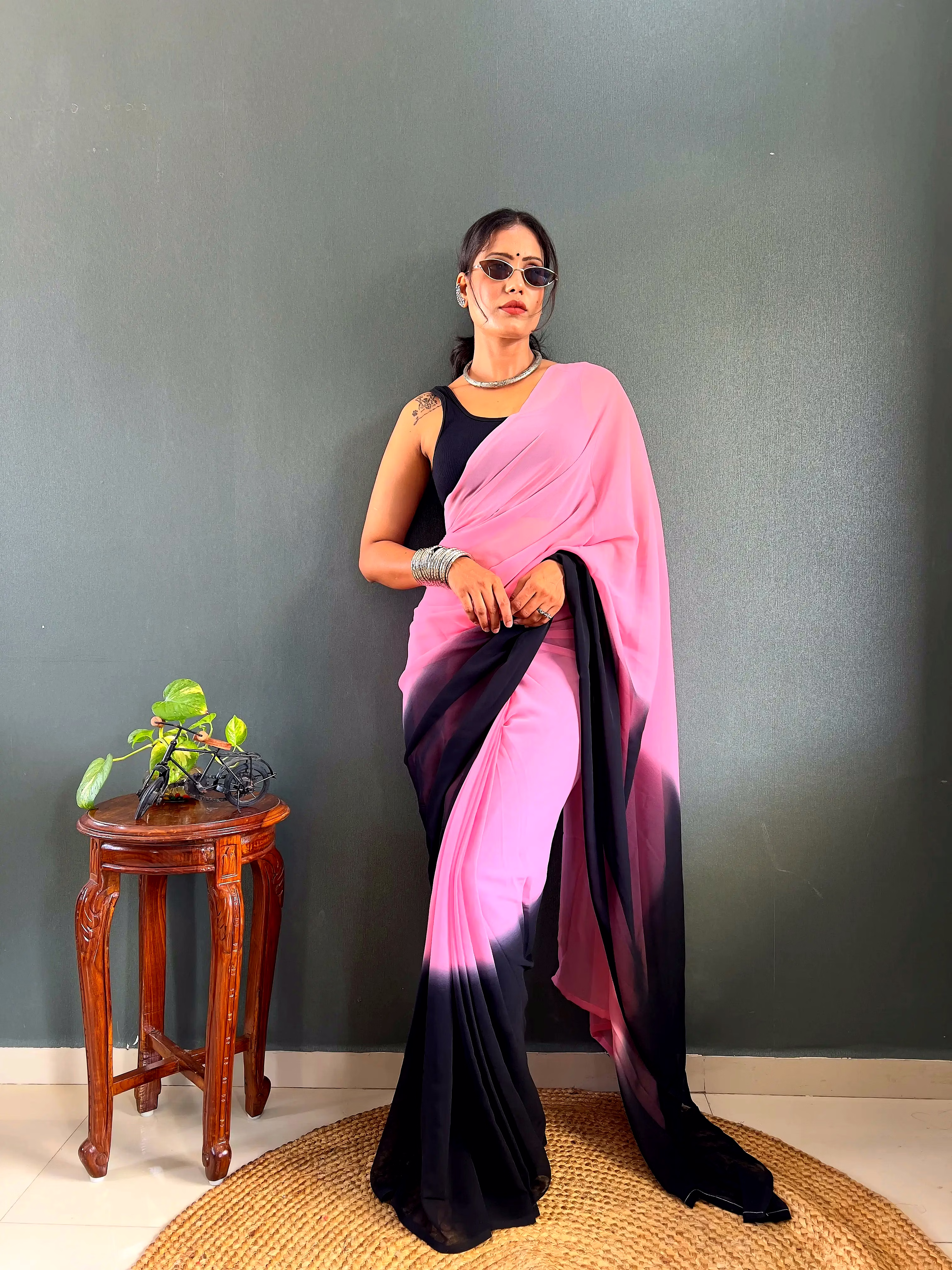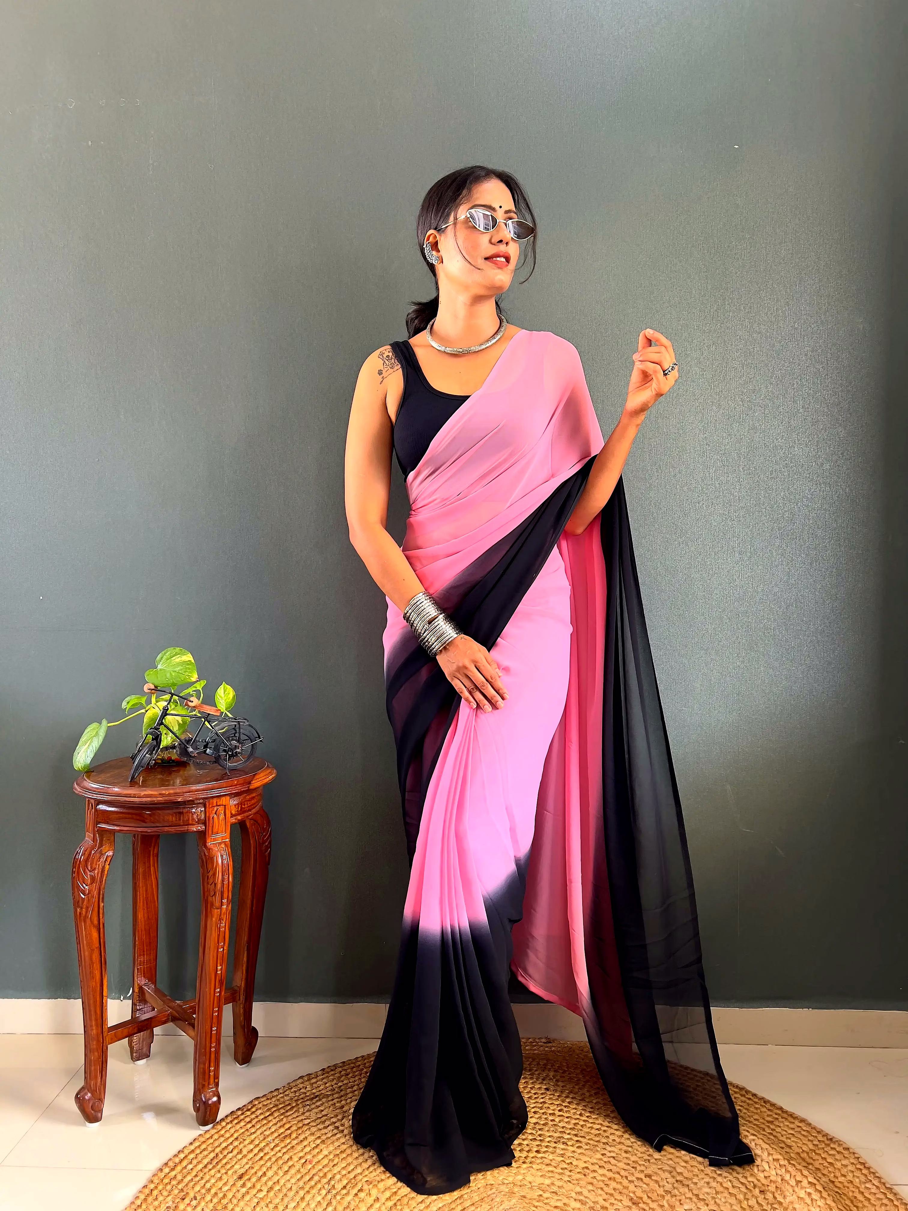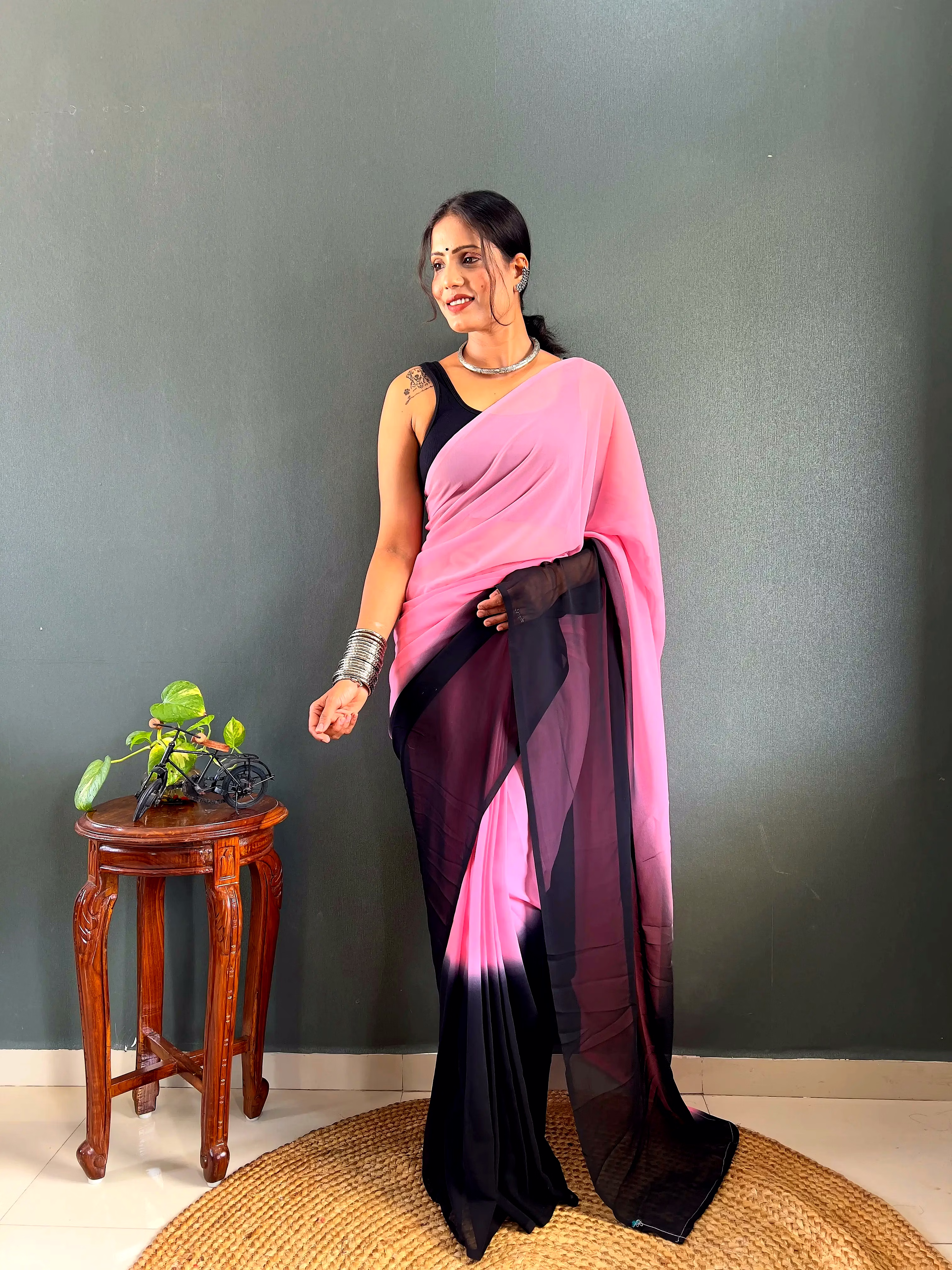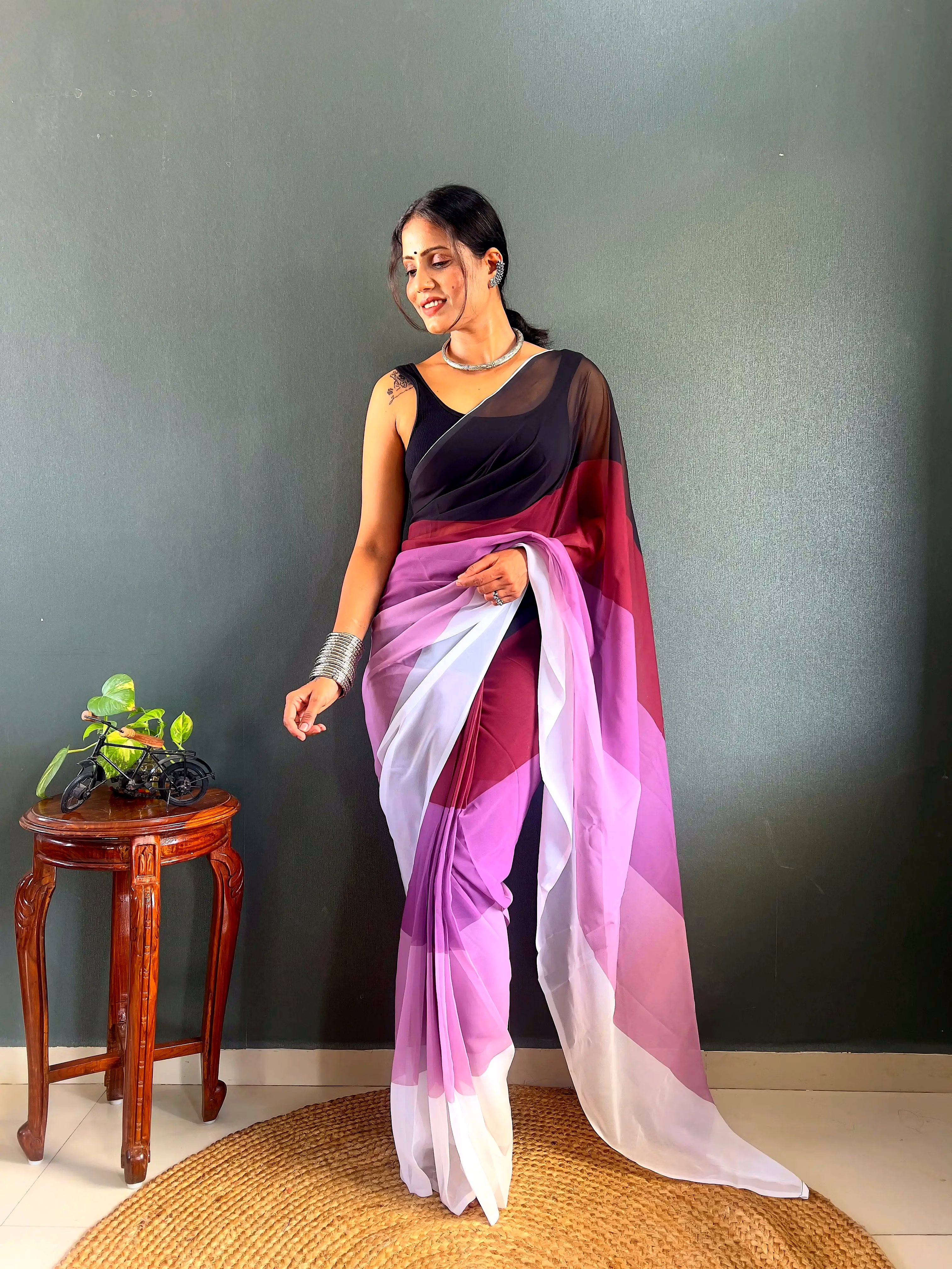 Elevate your style effortlessly with our Dual Tone Georgette Ready to Wear Saree. Embrace convenience and elegance in one stunning piece.