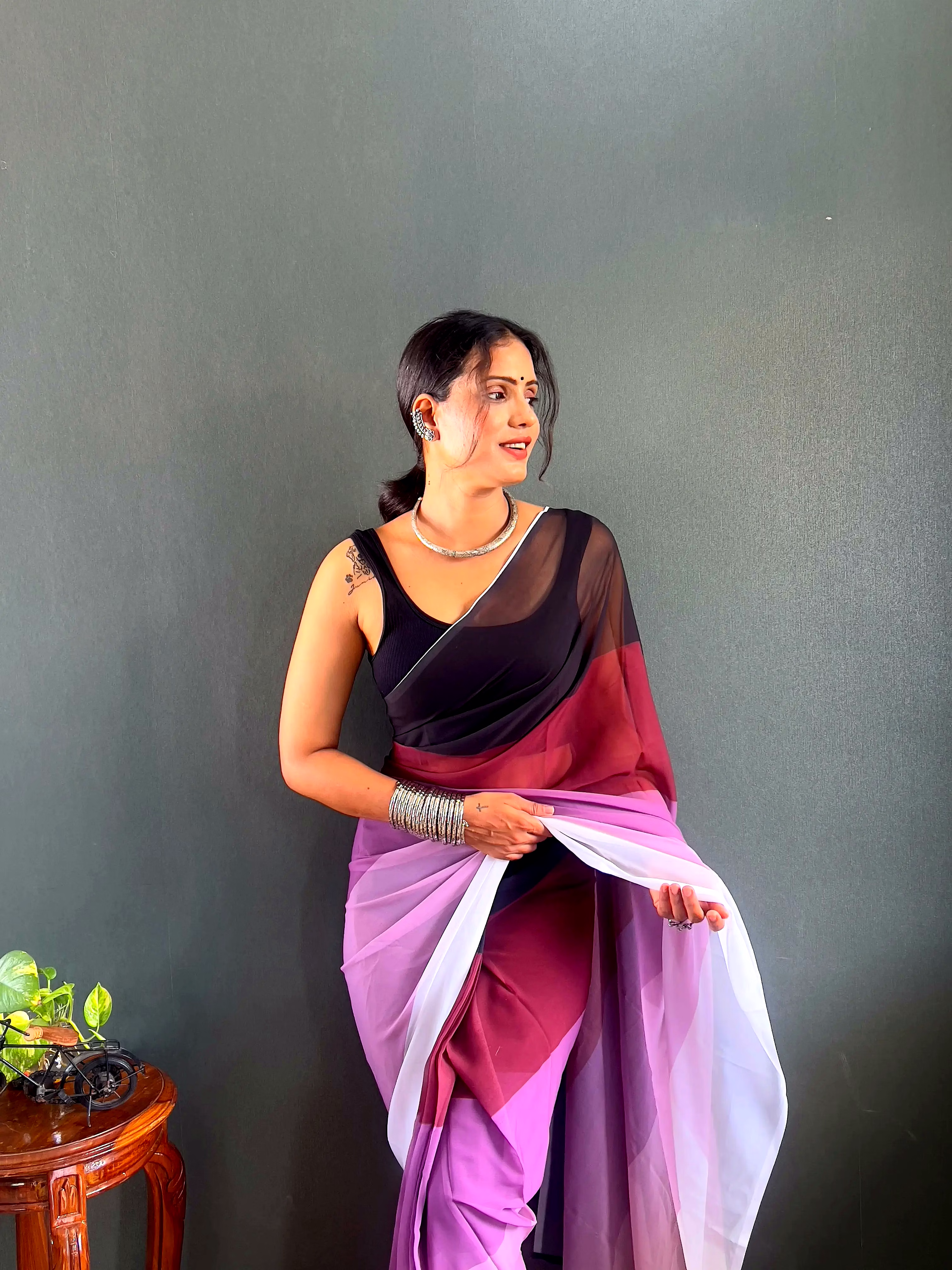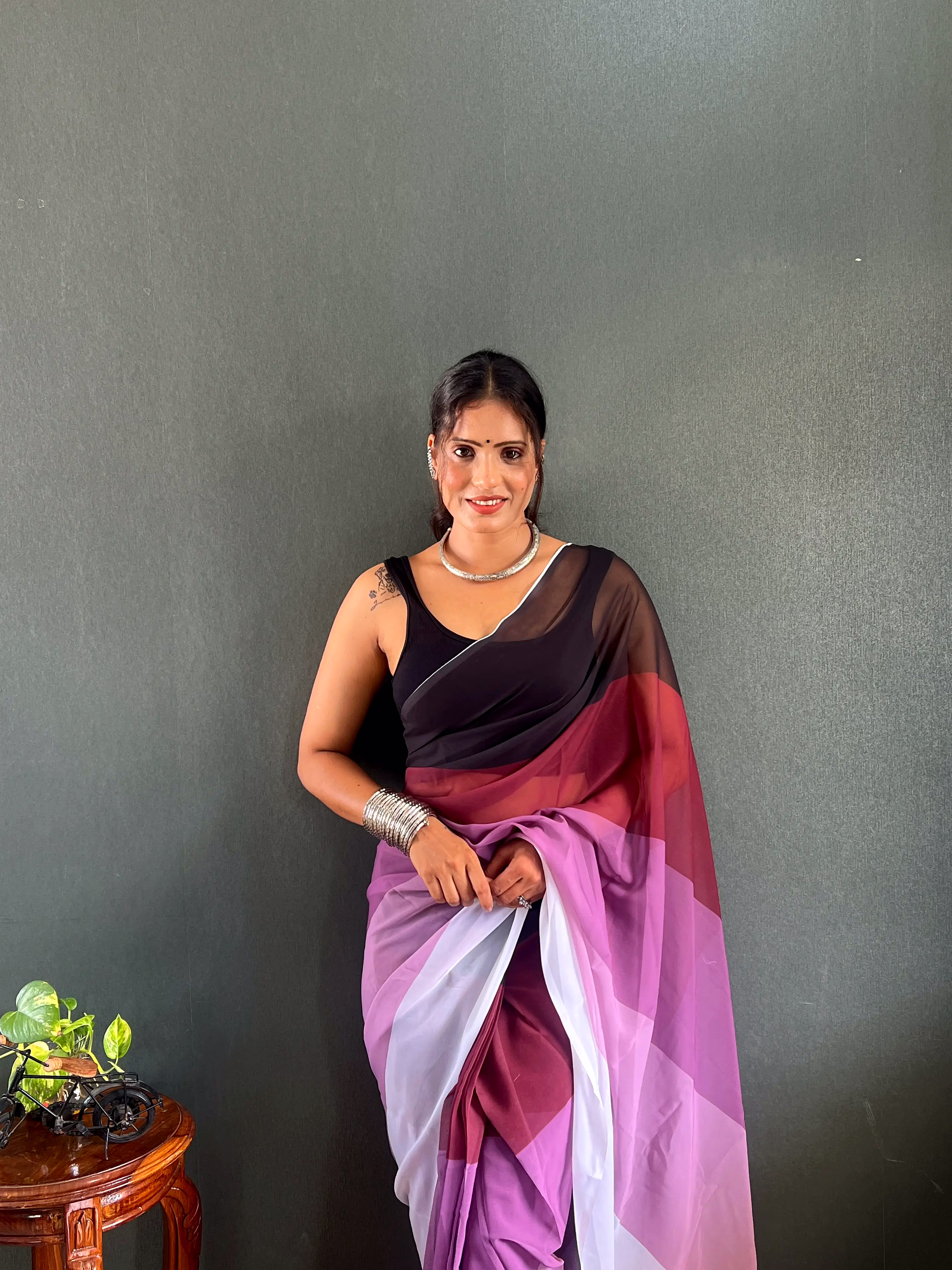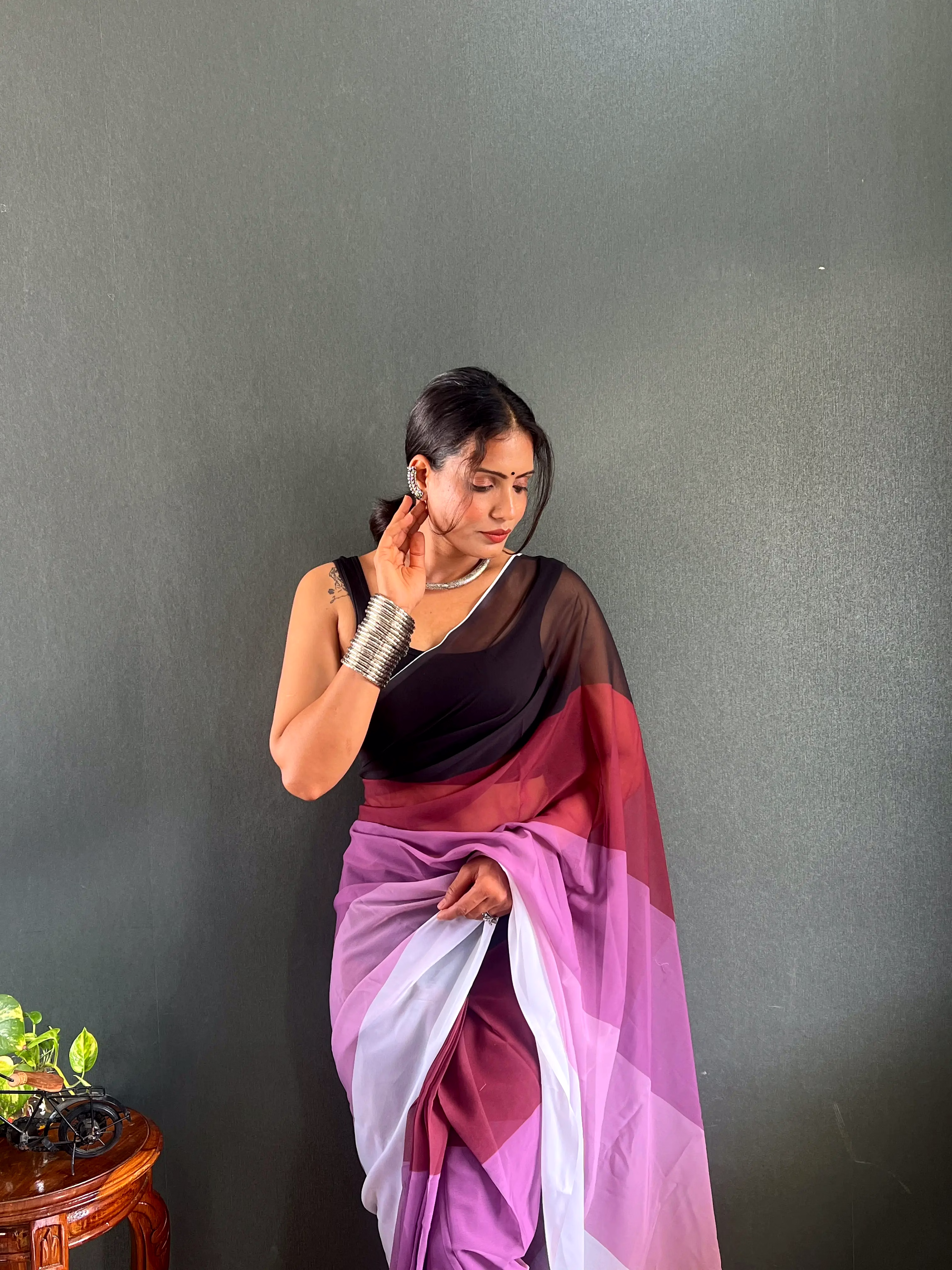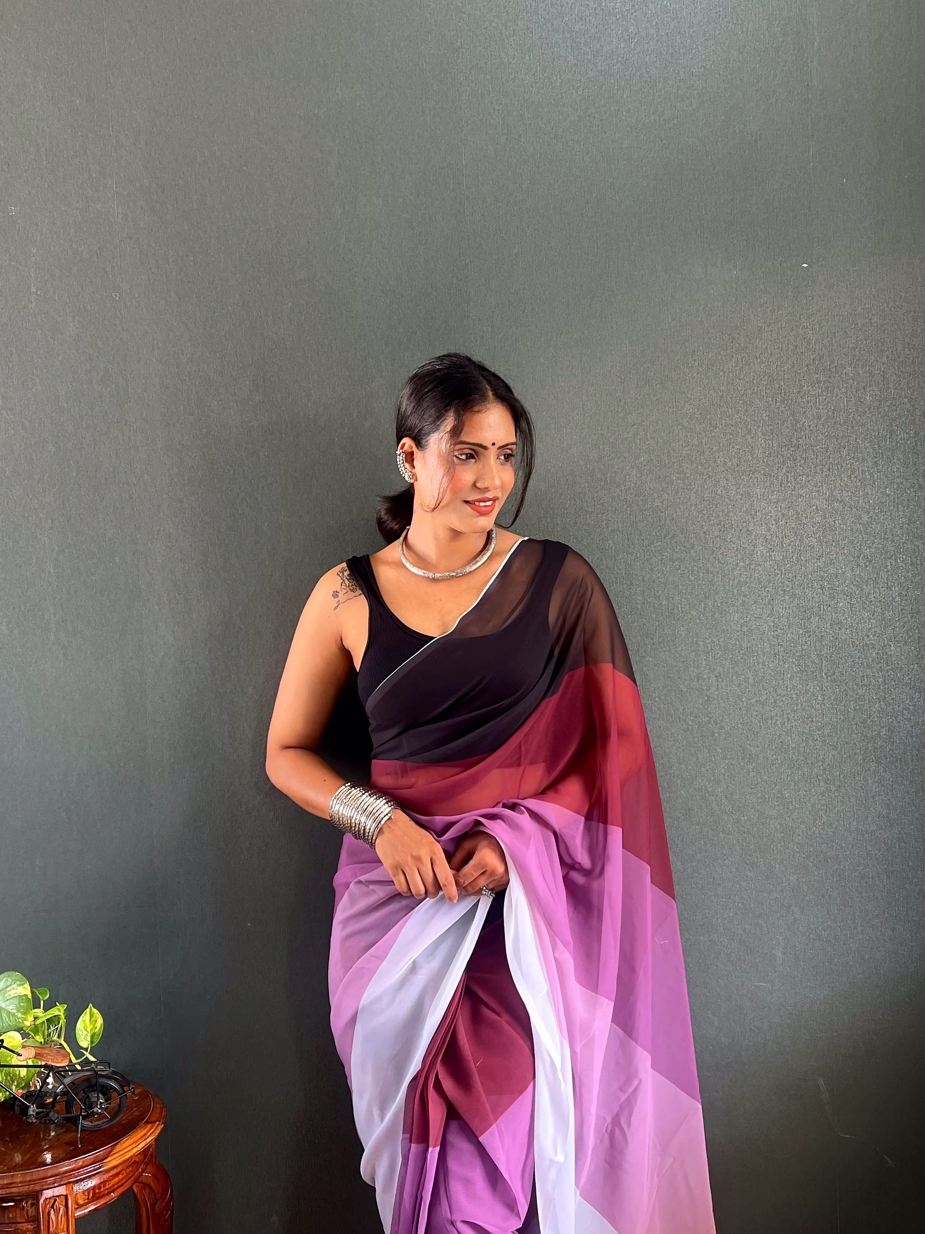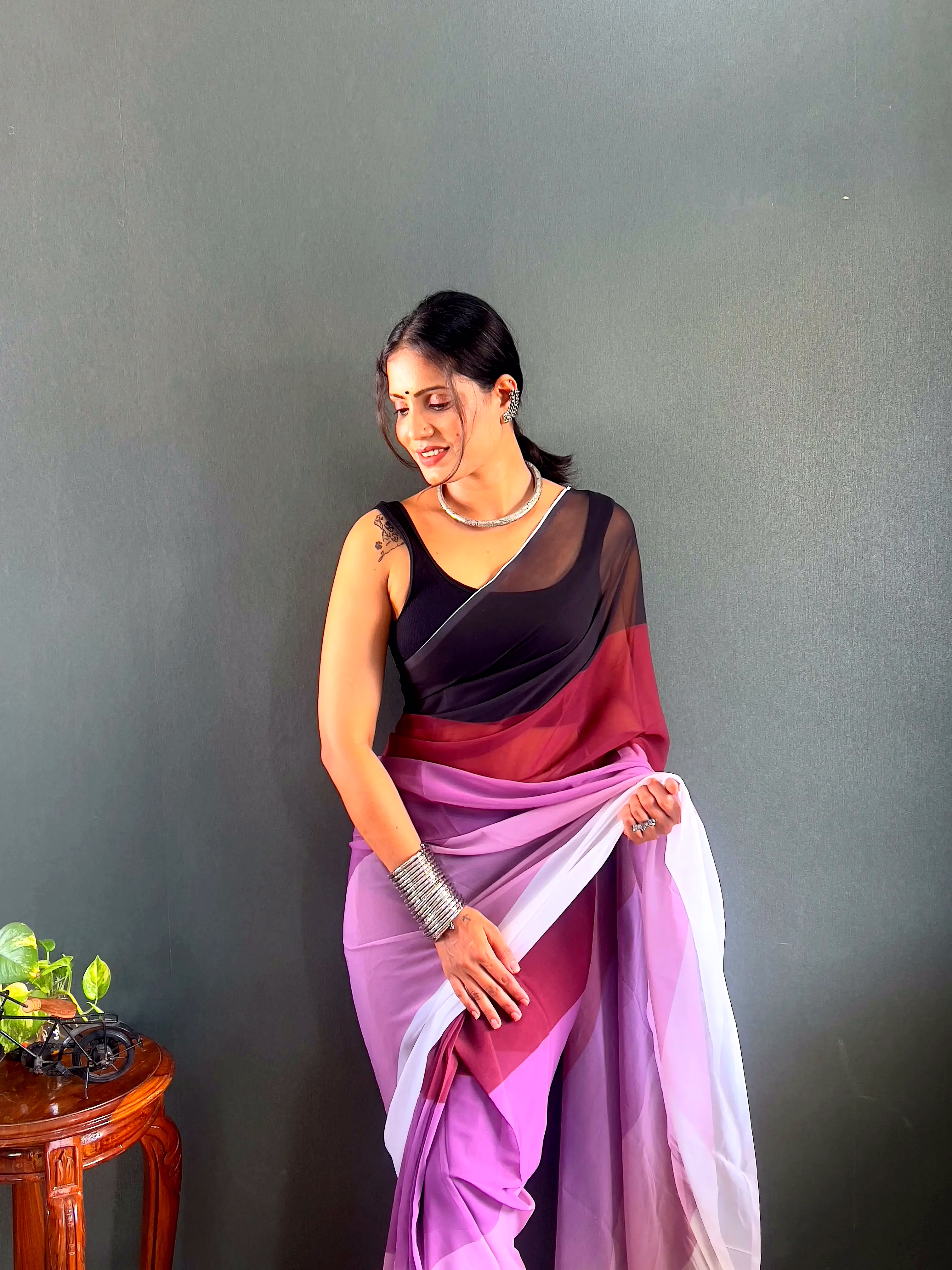 Elevate your style effortlessly with our Dual Tone Georgette Ready to Wear Saree. Embrace convenience and elegance in one stunning piece.