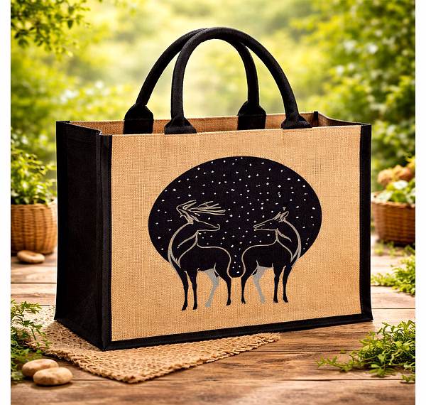 Enhance your shopping experience with our Eco-Friendly Printed Jute Shopping Bag. This durable and reusable tote with deer graphic offers style and sustainability in one.