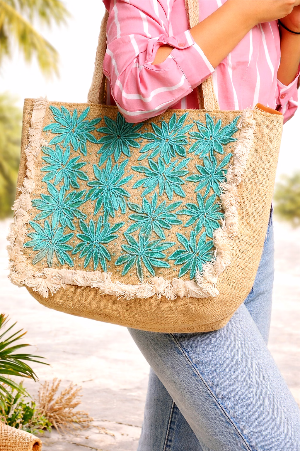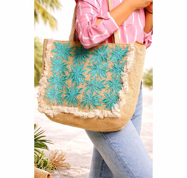 Embrace sustainability without compromising style. This jute tote bag is not only biodegradable and reusable but also a trendy fashion accessory. Perfect for the modern woman who values both fashion and the planet. Elevate your look with this unique turquoise embroidered tote that blends ethical craftsmanship with high fashion.