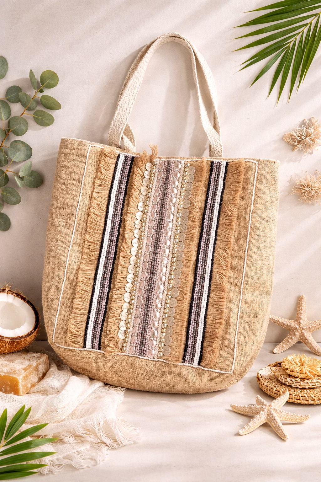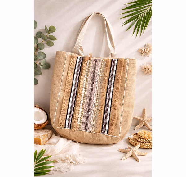 Elevate your fashion statement with the EcoChic Jute Tote Bag. Crafted from 100% natural jute, this bag not only complements your style but also contributes towards environmental sustainability. The intricate bead detailing and beaded stripes add a touch of artisan craftsmanship, making it a must-have accessory for eco-conscious individuals.