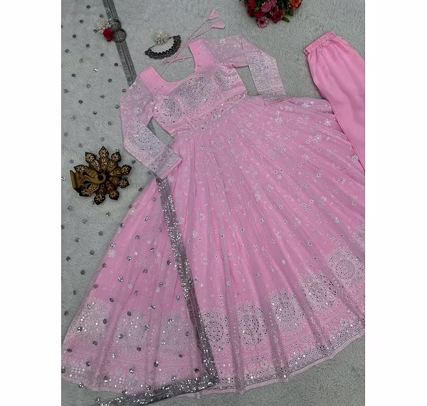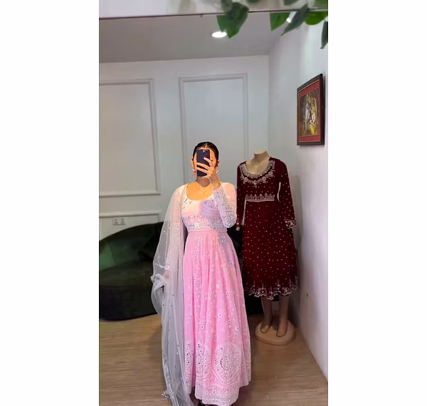 This elegant faux georgette designer suit set is a true testament to the beauty of traditional Indian fashion. Crafted with utmost precision and care, it showcases a perfect blend of intricate sequins and thread work, resulting in a stunning ensemble that is sure to turn heads. The faux georgette fabric adds a touch of luxury to this designer suit set. Known for its lightweight and flowy nature, it drapes beautifully on the body, creating a flattering silhouette. The fabric also lends an ethereal quality to the outfit, making it suitable for various occasions, ranging from formal gatherings to festive celebrations. The sequins and thread work on this suit set are nothing short of breathtaking. They are meticulously handcrafted by skilled artisans, who have honed their craft over generations. The sequins add a hint of glamour and sparkle, while the intricate thread work showcases the rich traditions and cultural heritage of India. The attention to detail in this designer suit set is evident in every aspect. The neckline is adorned with delicate embroidery, enhancing the overall elegance of the outfit. The sleeves feature intricate patterns, adding a touch of uniqueness and sophistication. The hemline is also beautifully embellished, creating a mesmerizing visual appeal. This suit set comes with a matching dupatta, which is also embellished with sequins and thread work. It adds a layer of grace and completes the look. The combination of the suit and dupatta creates a harmonious ensemble that exudes charm and grace. Overall, this faux georgette designer suit set with sequins and thread work is a true masterpiece. Its exquisite craftsmanship, luxurious fabric, and intricate detailing make it a must-have for any fashion enthusiast. Whether you wear it to a wedding, a party, or a festive gathering, this suit set is guaranteed to make you feel like a true diva.