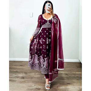 This Elegant Faux Georgette Suit is a stunning blend of traditional craftsmanship and contemporary fashion, offering a timeless piece for your wardrobe. Crafted from high-quality faux georgette fabric, this suit exudes sophistication and grace, perfect for any formal or semi-formal occasion. The material's lightweight nature ensures comfort, allowing you to move with ease while maintaining an aura of elegance. The suit is adorned with intricate cotton thread embroidery, a testament to the skillful artistry that goes into its creation. Delicate floral patterns and ornate designs are meticulously stitched onto the fabric, giving the suit a rich and luxurious texture. The embroidery, done in complementary hues, stands out beautifully against the subtle backdrop of the faux georgette, creating a visually arresting ensemble. Adding to the suit's allure are the exquisite mirror work embellishments that catch the light and add a touch of sparkle. These small mirrors are carefully integrated into the embroidery, creating a harmonious balance between subtlety and glamour. The mirror work not only enhances the overall aesthetic but also adds a dynamic element to the suit, making it perfect for both daytime events and evening soirées. Available in multiple sizes, this Elegant Faux Georgette Suit caters to a wide range of body types, ensuring a flattering fit for everyone. The suit's design is thoughtfully constructed to provide comfort without compromising on style, with tailored cuts and adjustable features that ensure ease of wear. Whether you are attending a wedding, a festive celebration, or a formal gathering, this suit promises to make you the center of attention. Pair it with traditional jewelry and accessories to complete the look, or mix and match with contemporary pieces for a modern twist. The versatility and timeless appeal of this Elegant Faux Georgette Suit make it a valuable addition to any fashion-conscious individual's collection. Embrace the blend of tradition and modernity with this exquisite ensemble, and step out with confidence and grace.
