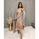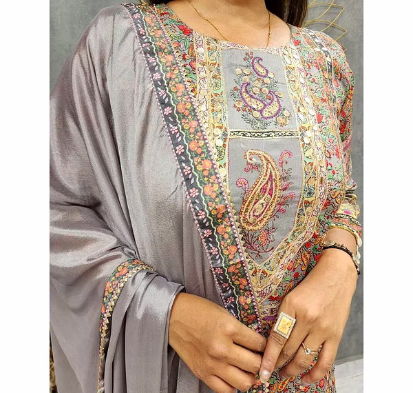 Elegant Maslin Top with Printed & Coin Work, Santoon Pants & Georgette Dupatta Set