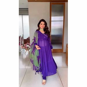 The Elegant Tibby Silk Designer Suit is a true masterpiece that will captivate anyone's attention. This stunning suit is meticulously crafted with the finest Tibby silk fabric, renowned for its exceptional quality and luxurious texture. The rich, vibrant colors of the digital print add a touch of elegance and grace to the overall design. The suit features intricate sequin detailing that adds a glamorous and eye-catching element. The sequins are carefully hand-embroidered onto the fabric, creating a mesmerizing effect that shimmers and sparkles with every movement. This exquisite embellishment truly elevates the suit to a whole new level of sophistication. In addition to the sequins, the suit also showcases delicate thread work, showcasing the skillful craftsmanship of the artisans who bring this creation to life. The intricate motifs and patterns created with the threads enhance the overall beauty of the suit, adding depth and dimension to the design. The accompanying crepe pants perfectly complement the suit, providing a stylish and comfortable bottom wear option. The lightweight and flowy fabric of the pants allows for ease of movement, while maintaining a flattering silhouette. The pants are designed to enhance the overall look of the suit, offering a seamless and cohesive ensemble. This Elegant Tibby Silk Designer Suit is perfect for those special occasions where you want to make a lasting impression. Whether it's a wedding, a festive celebration, or any formal event, this suit is guaranteed to turn heads and make you feel like a true fashion icon. Indulge in the beauty and opulence of this exquisite suit, and experience the luxurious feel of the Tibby silk against your skin. With its flawless craftsmanship, intricate detailing, and timeless design, the Elegant Tibby Silk Designer Suit is a true work of art that will leave a lasting impression wherever you go.