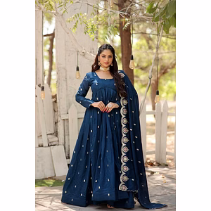 Step into the world of timeless elegance with this exquisite Vichitra gown, meticulously crafted to exude a sense of grandeur and sophistication. The gown radiates a regal charm, thanks to the intricate cording sequence embroidery that adorns its surface. Each stitch of the embroidery is a testament to the skilled craftsmanship that goes into creating such a masterpiece. The shimmering sequences catch the light at every angle, making you the center of attention at any event. The gown's fabric, Vichitra silk, is known for its luxurious texture and flowy drape. It feels incredibly soft against the skin, offering both comfort and style. The gown features a flattering silhouette that accentuates your curves while allowing for ease of movement. The neckline and sleeves are thoughtfully designed to add a touch of modernity to the traditional aesthetics. Complementing the gown is a matching palazzo, which adds a contemporary twist to the ensemble. The palazzo is designed with the same meticulous attention to detail, ensuring that it perfectly harmonizes with the gown. Its wide-legged design not only offers ample comfort but also adds an element of fluidity to your overall look. No ensemble is complete without a dupatta, and this one is no exception. The accompanying dupatta is a piece of art in itself, adorned with delicate motiwork that adds a layer of opulence. The pearls are meticulously hand-stitched, creating patterns that enhance the overall beauty of the dupatta. Draping it over your shoulders, you will feel like royalty, wrapped in luxury and elegance. This Elegant Vichitra Gown with Cording Sequence Embroidery, Palazzo, and Motiwork Dupatta is perfect for any special occasion, be it a wedding, festive celebration, or a high-profile event. It is a harmonious blend of traditional craftsmanship and modern design, making it a versatile addition to your wardrobe. When you wear this ensemble, you are not just wearing a gown; you are making a statement of timeless elegance and refined taste.