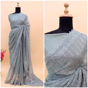 Introducing the exquisite JIMMY CHOO Saree, a true masterpiece crafted for the discerning woman who appreciates elegance and luxury. Made from the finest quality fabric, this saree is designed to mesmerize with its full heavy embroidery work, showcasing intricate patterns of thread dori and sequins. The attention to detail is truly exceptional. The saree measures 5.5 meters, allowing for graceful draping and a flattering silhouette. The cut work border, adorned with polo piping and latakan, adds a touch of sophistication and enhances the overall appeal. It is a true statement piece that effortlessly exudes glamour and style. Accompanying the saree is a stunning MONO BANGLORY blouse, featuring full heavy embroidery work on both front and back. The intricate detailing further enhances the beauty of this ensemble. The blouse comes in a length of 0.80 meters, providing ample fabric for customization according to your preferences. Designed to make heads turn at any occasion, the JIMMY CHOO Saree is the epitome of elegance. It effortlessly combines traditional craftsmanship with contemporary design, creating a timeless and captivating look. The premium quality fabric ensures utmost comfort, allowing you to feel confident and at ease throughout the day or night. Whether it's a wedding, a festive celebration, or any special occasion, this saree is sure to make a lasting impression. It is a reflection of your impeccable taste and individuality. Embrace the allure of the JIMMY CHOO Saree and indulge in the luxury it offers. Experience the true essence of elegance and make a statement that is uniquely yours.