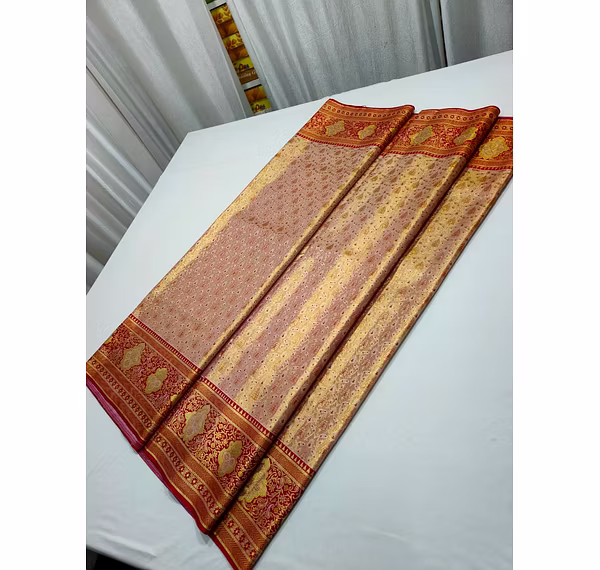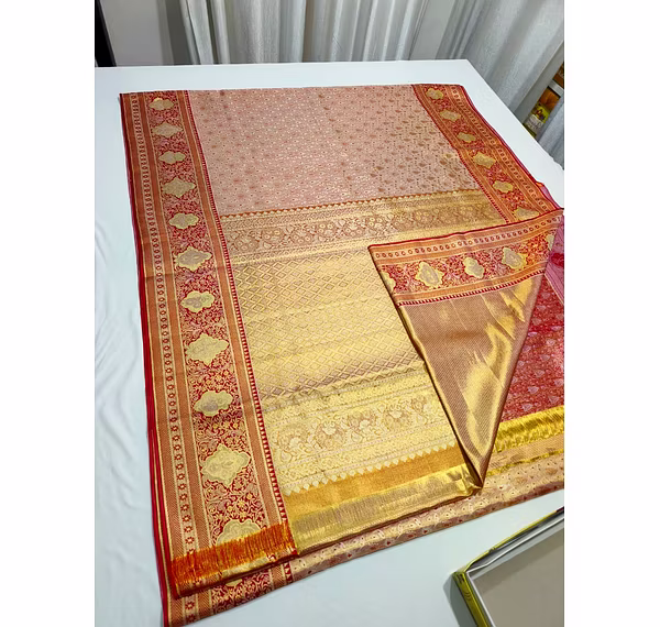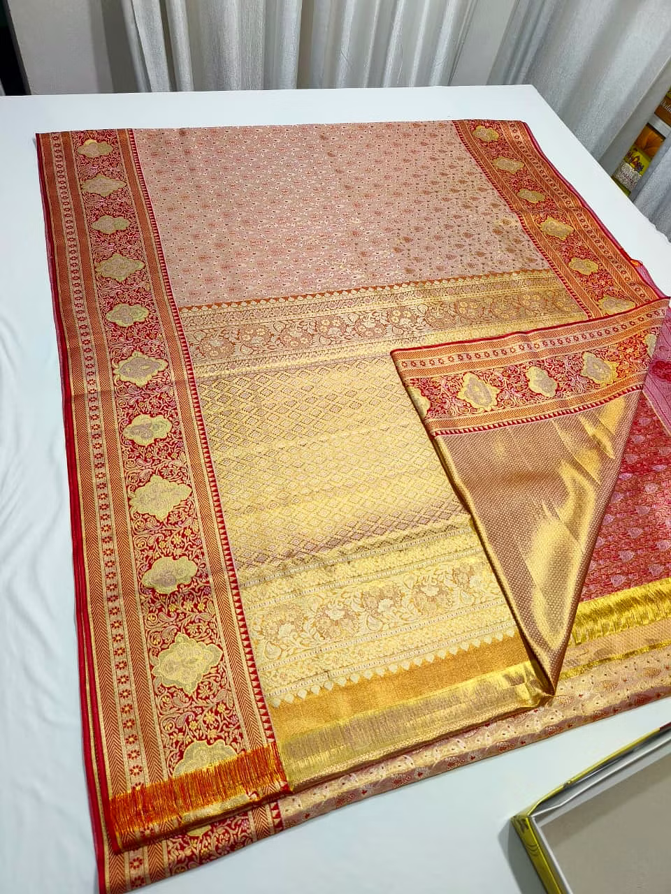 Elevate your ethnic wardrobe with the exquisite Meenakari Broked Saree. Handwoven using pure Pattu silk in Dharmavaram, this Kanjeevaram silk saree features intricate Meenakari work, a true testament to Indian craftsmanship.