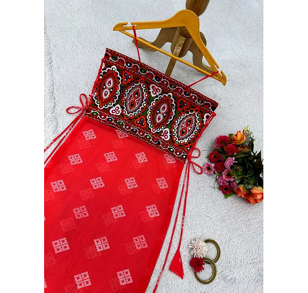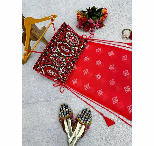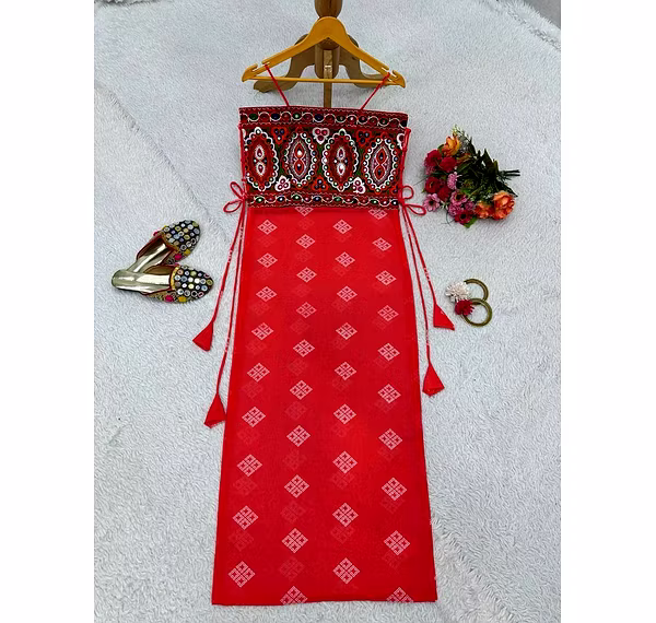 This enchanting fairy-like mirrorwork georgette dress with dori stitching is a true masterpiece of craftsmanship. The dress is made of high-quality georgette fabric, which is known for its flowy, lightweight texture that drapes beautifully around the body. The dress features an intricate dori stitching pattern that creates a unique and eye-catching design on the dress. The highlight of this dress is undoubtedly the exquisite mirrorwork. The dress is adorned with tiny, delicate mirrors that shimmer and shine in the light, giving the dress a magical and ethereal quality. The mirrorwork is meticulously handcrafted by skilled artisans, who take great care in ensuring that each mirror is perfectly aligned and secured in place. The dress has a graceful and feminine silhouette, with a fitted bodice that flares out into a flowy skirt. The bodice is intricately embellished with mirrorwork and dori stitching, creating a stunning visual effect. The dress also features a plunging neckline and open back, adding a touch of sensuality to the overall look. This dress is perfect for special occasions such as weddings, receptions, or formal events. It is sure to turn heads and make you feel like a true fairy princess. It can be paired with delicate jewelry and strappy heels for a complete and stunning look. In conclusion, this fairy-like mirrorwork georgette dress with dori stitching is a true work of art. Its intricate detailing, delicate mirrorwork, and flowing silhouette make it a standout piece that is sure to make any woman feel like a true fairy princess.