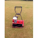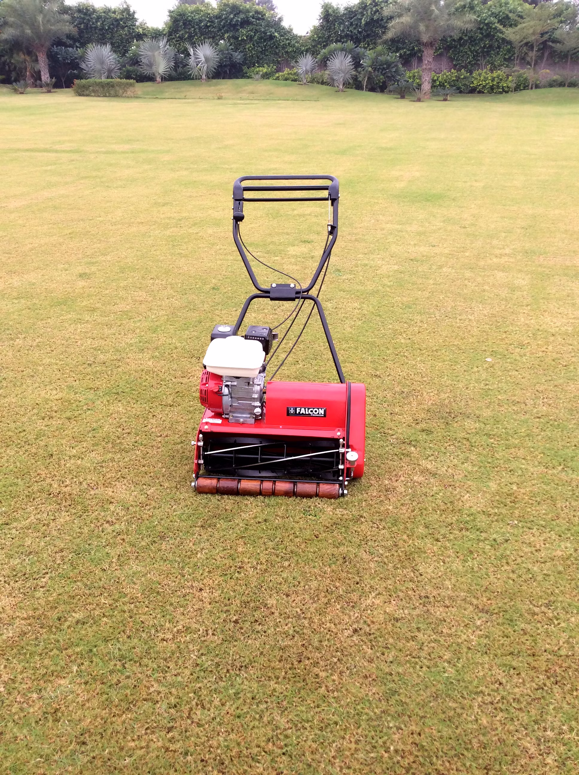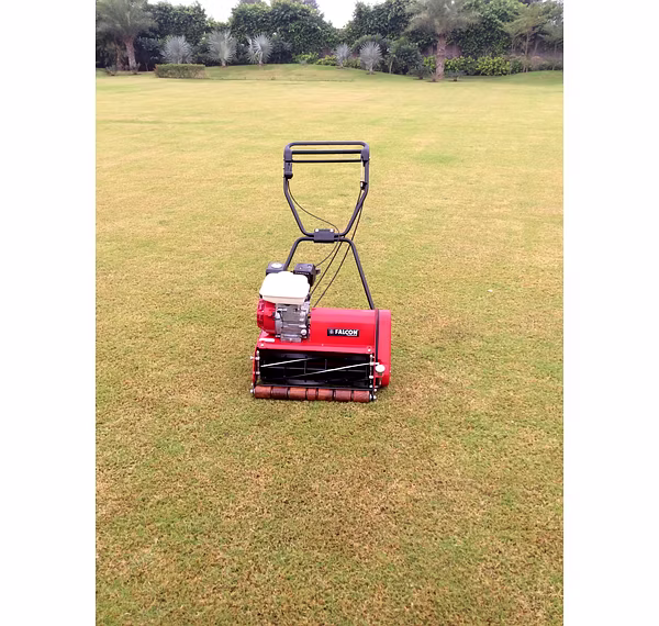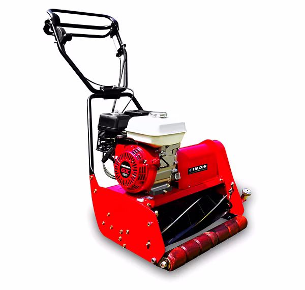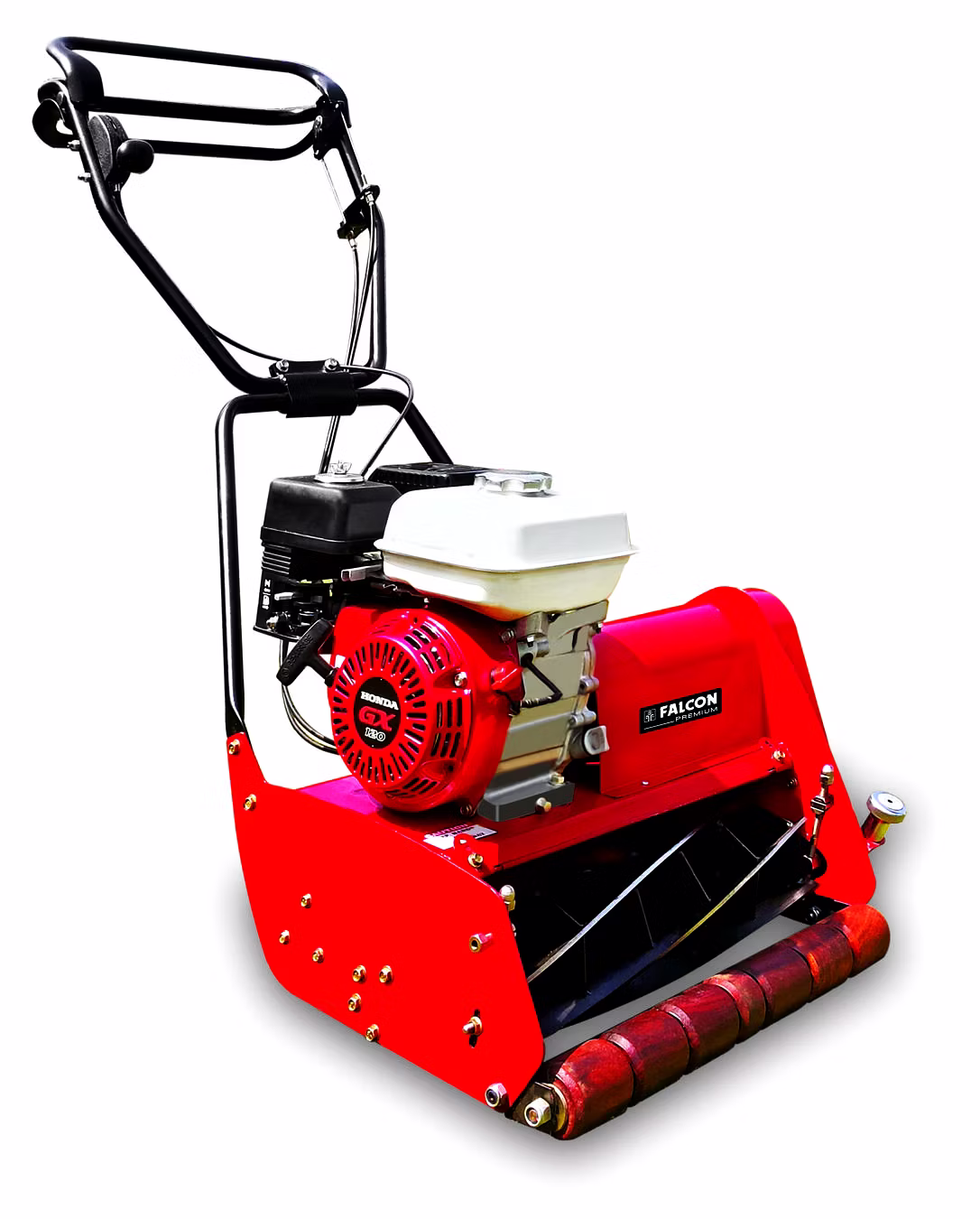 This Falcon Cylindrical Hand Lawn Mower features a horizontal cylinder with multiple blades that rotate. As the cylinder spins, the blades slice the grass against a fixed blade (bedknife) at the bottom. It is designed for medium to large-sized lawns.