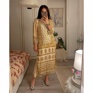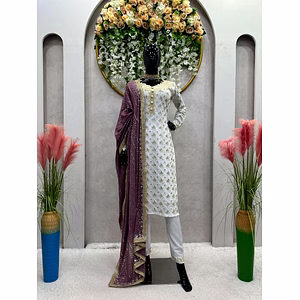 This faux georgette sequined outfit is a stunning piece of apparel that is perfect for any special occasion. The intricate detailing on this outfit is sure to catch the eye and leave a lasting impression. The fabric used in the outfit is faux georgette, which is a light and flowing material that is known for its durability and comfortability. The sequins are intricately hand-sewn onto the fabric, adding an extra level of elegance and sophistication to the outfit. The outfit comes with a matching dupatta that is also made of faux georgette and features the same intricate sequin work as the outfit. The dupatta is a versatile accessory that can be draped in a variety of different styles, making it a great addition to any outfit. The outfit is available in a range of different colors, from traditional shades like red and gold to more modern colors like teal and silver. This ensures that there is an outfit available for every taste and occasion. The cut and style of the outfit are designed to flatter every body type, with a flattering silhouette that accentuates curves and hides any problem areas. The outfit is available in a range of sizes, ensuring that every woman can find the perfect fit. Overall, this faux georgette sequined outfit is a stunning and versatile piece of apparel that is perfect for any special occasion. The intricate detailing, comfortable fabric, and flattering cut make it a must-have for any woman's wardrobe.