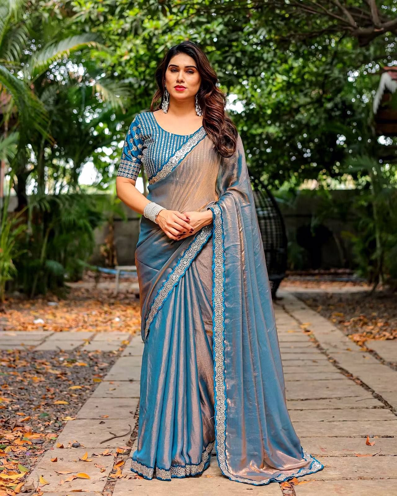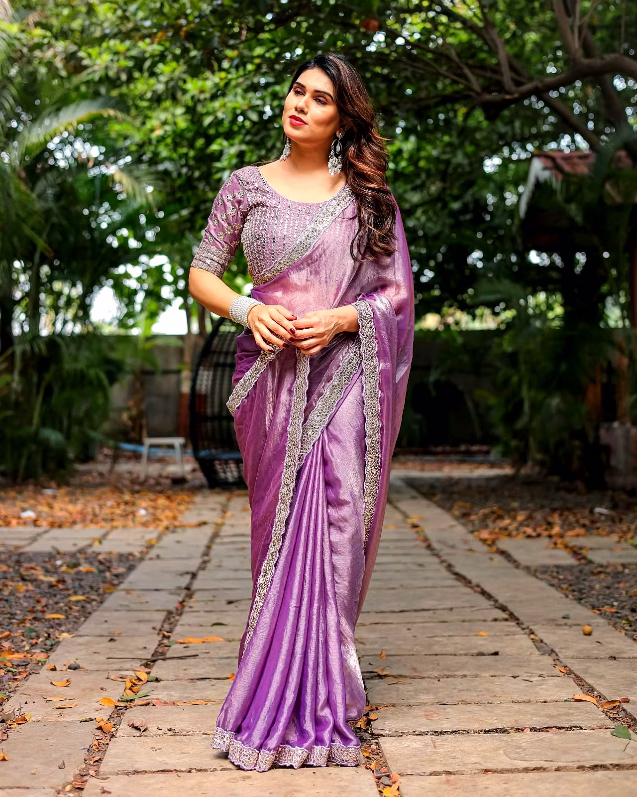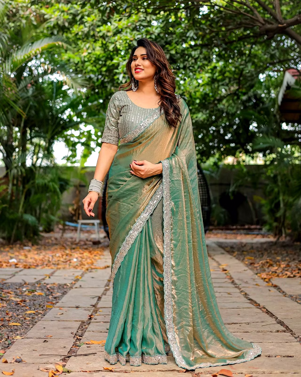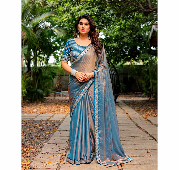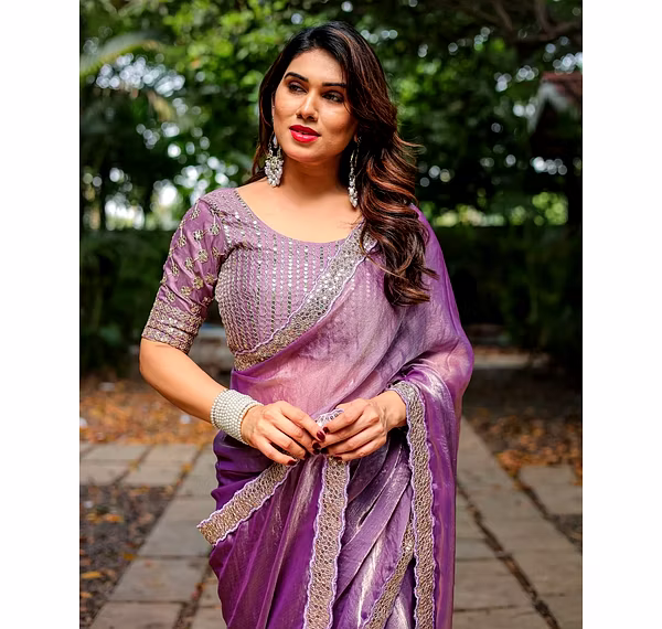 The defining feature of this luxurious creation is the magnificent Sequence Lace Border. This is not a simple trim, but a meticulously applied strip of intricate detailing, featuring delicate sequins woven directly into a sophisticated lace pattern. This unique combination creates a stunning visual depth, allowing the border to capture and reflect light with graceful precision. The substantial weight of the border perfectly contrasts the lightness of the main Modern Saree fabric, giving the drape structure and ensuring a perfectly balanced look. This unique border design is your key to instant glamour, guaranteeing that every frame and photograph highlights your refined taste.