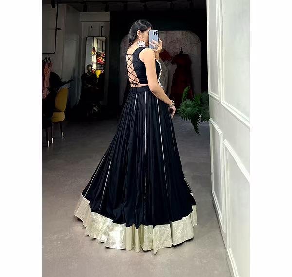 Lehenga (Stitched)Lehenga Fabric : RayonLehenga Work : Plain And Lace Border With Gotta Patti Touch UpLehenga Waist : Support Up To 42Lehenga Closer : Drawstring With ZipStitching : Stitched With Canvas And Full InnerLength : 41Flair : 6 MeterInner : Micro CottonBlouse (Stitched)Blouse Fabric : Rayon (Fully Stitched)Blouse Work : Plain And Gamthi Work With Cowrie (Kodi) Lace Touch UpBlouse Size : 38” There is Extra Margin Customer Can Adjust Up to 42Blouse Length : 15Package Contain : Lehenga, BlouseWeight : 1.500 kg Designed for international appeal, this top delivers both elegance and export-ready quality.