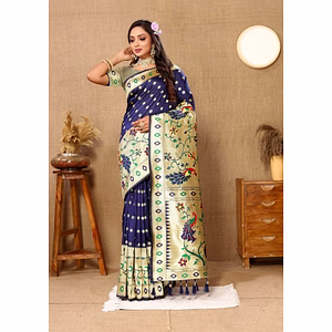 Introducing our Pure Soft Russian Silk Saree, a true embodiment of elegance and craftsmanship. This exquisite saree is meticulously handwoven with the finest Zari and Meenakari weaving, creating a stunning display of artistry and luxury. The highlight of this saree is its Pallu, which features intricate Meenakari and Zari weaving, adding a touch of opulence to the overall design. The full saree is adorned with delicate Zari and Meenakari woven patterns, showcasing the mastery of our skilled artisans. With a Zari and Meenakari woven border and running Butti weaving throughout, this saree exudes a timeless charm that will captivate all who lay eyes on it. The intricate craftsmanship and attention to detail make this saree a true work of art, perfect for any special occasion or celebration. Crafted from the finest, soft Russian silk, this saree not only looks exquisite but also feels incredibly luxurious against the skin. The lightweight and breathable fabric ensure maximum comfort, allowing you to move with grace and ease. The Pure Soft Russian Silk Saree is a unique creation that effortlessly blends traditional artistry with modern sensibilities. Its timeless design and impeccable quality make it a valuable addition to any wardrobe. Capture attention and make a lasting impression with this extraordinary saree. Elevate your style and embrace the beauty of Indian craftsmanship with our Pure Soft Russian Silk Saree, a true masterpiece that celebrates tradition and art in every thread.