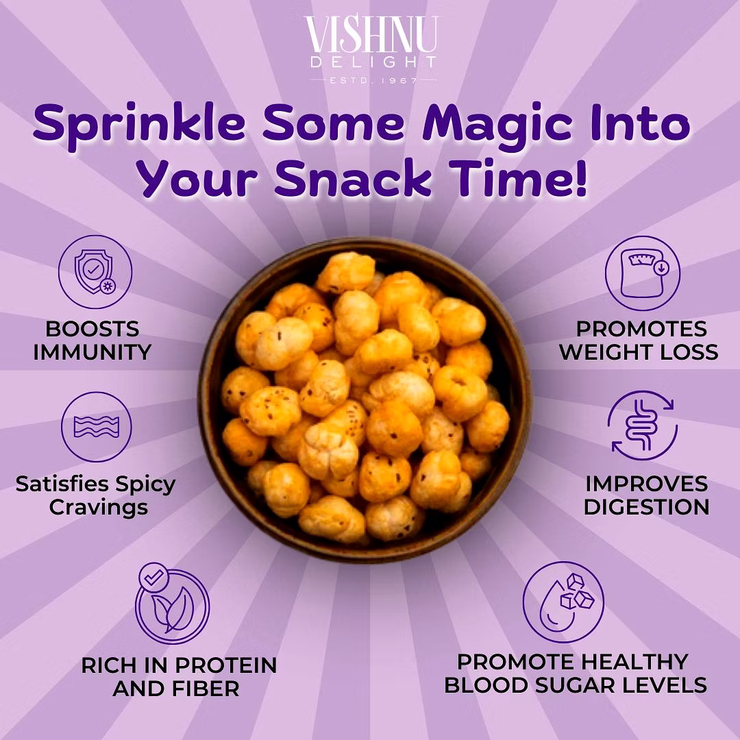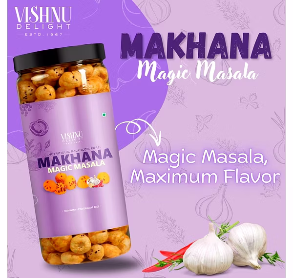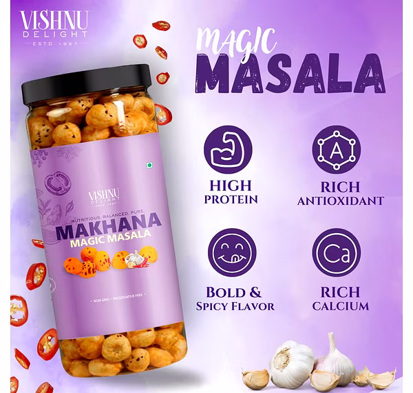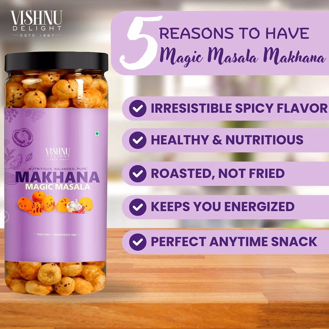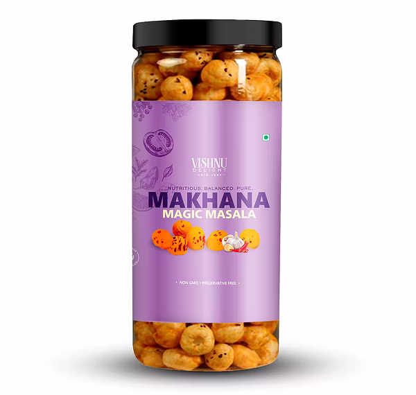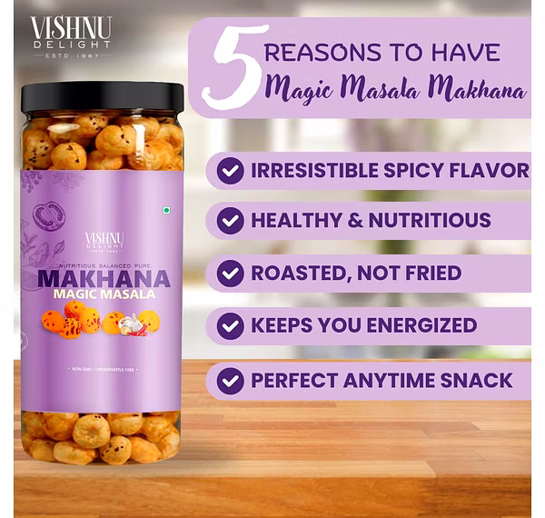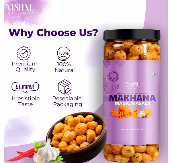 Flavored Makhana – Magic Masala 90gm Jar by Vishnu Delight is a dependable choice for global markets, offering consistency, quality assurance, and wide export potential.