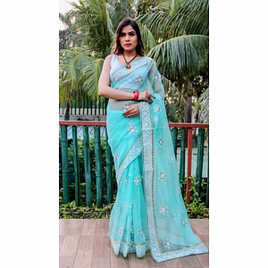 Introducing our Floral Chikankari Organza Saree with Satin Blouse – a stunning fusion of traditional craftsmanship and contemporary elegance. This exquisite ensemble is designed to make you feel like a queen, adorned in the finest fabrics and intricate embroidery. Crafted with utmost care, this saree features delicate floral motifs meticulously hand-embroidered using the age-old Chikankari technique. Each thread is skillfully woven, creating a mesmerizing symphony of intricate patterns that exude timeless beauty. The lightweight and airy organza fabric drapes effortlessly, giving you an ethereal charm that will turn heads wherever you go. Its soft texture and sheer elegance make it perfect for both formal occasions and casual gatherings, ensuring you always stand out from the crowd. Paired with a luxurious satin blouse, this saree adds a touch of opulence to your ensemble. The smooth, glossy fabric enhances the overall look, while the perfect blend of colors complements the intricate embroidery, creating a harmonious balance. With our Floral Chikankari Organza Saree, you not only embrace the rich heritage of Indian craftsmanship but also experience the comfort and versatility of modern fashion. Whether you're attending a wedding, a festive celebration, or a special event, this saree is sure to make a statement and leave a lasting impression. Elevate your style quotient with this enchanting saree that effortlessly combines tradition and contemporary aesthetics. Embrace the grace of the past while embracing the possibilities of the future. Step into the spotlight and let our Floral Chikankari Organza Saree with Satin Blouse transform you into a vision of elegance.