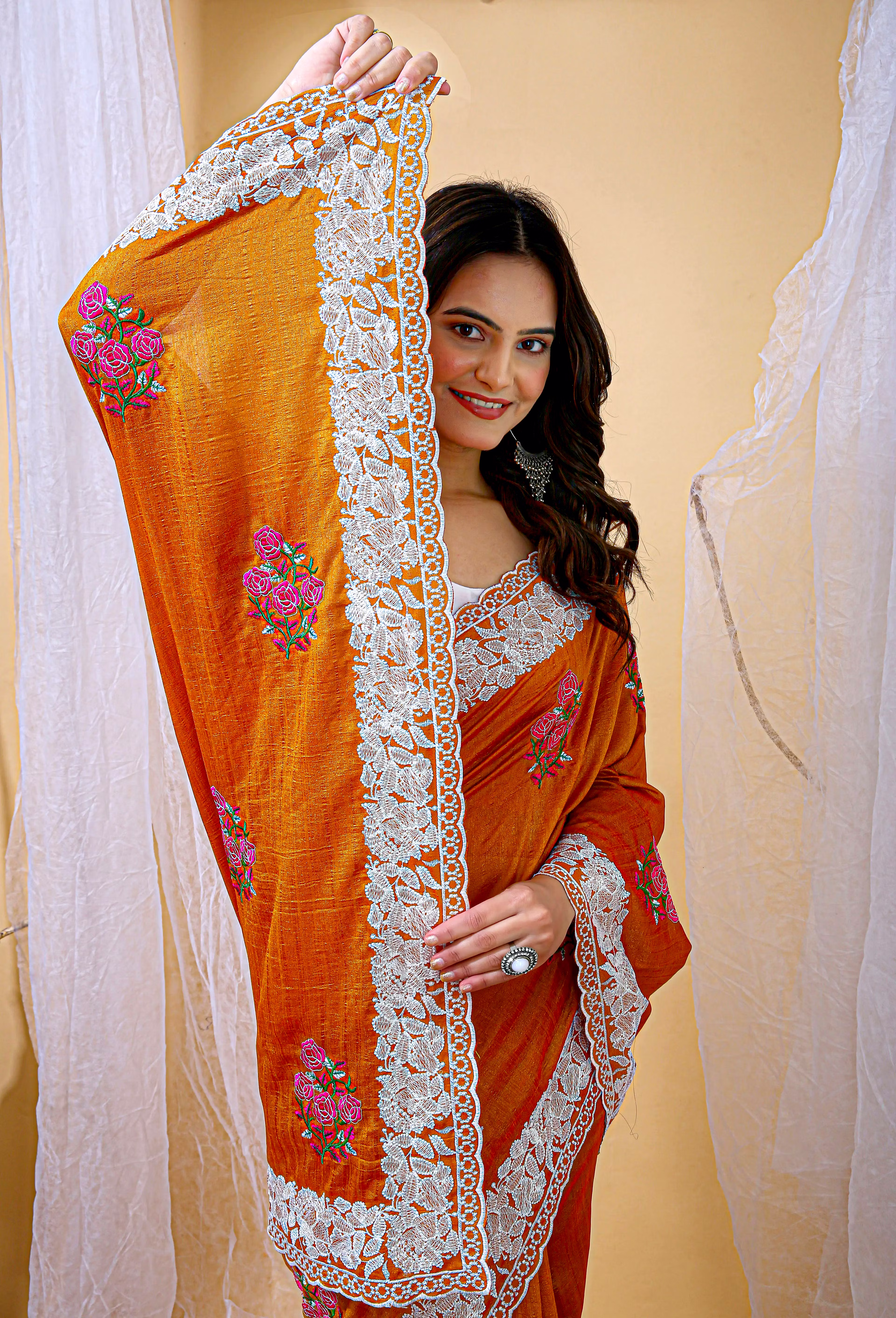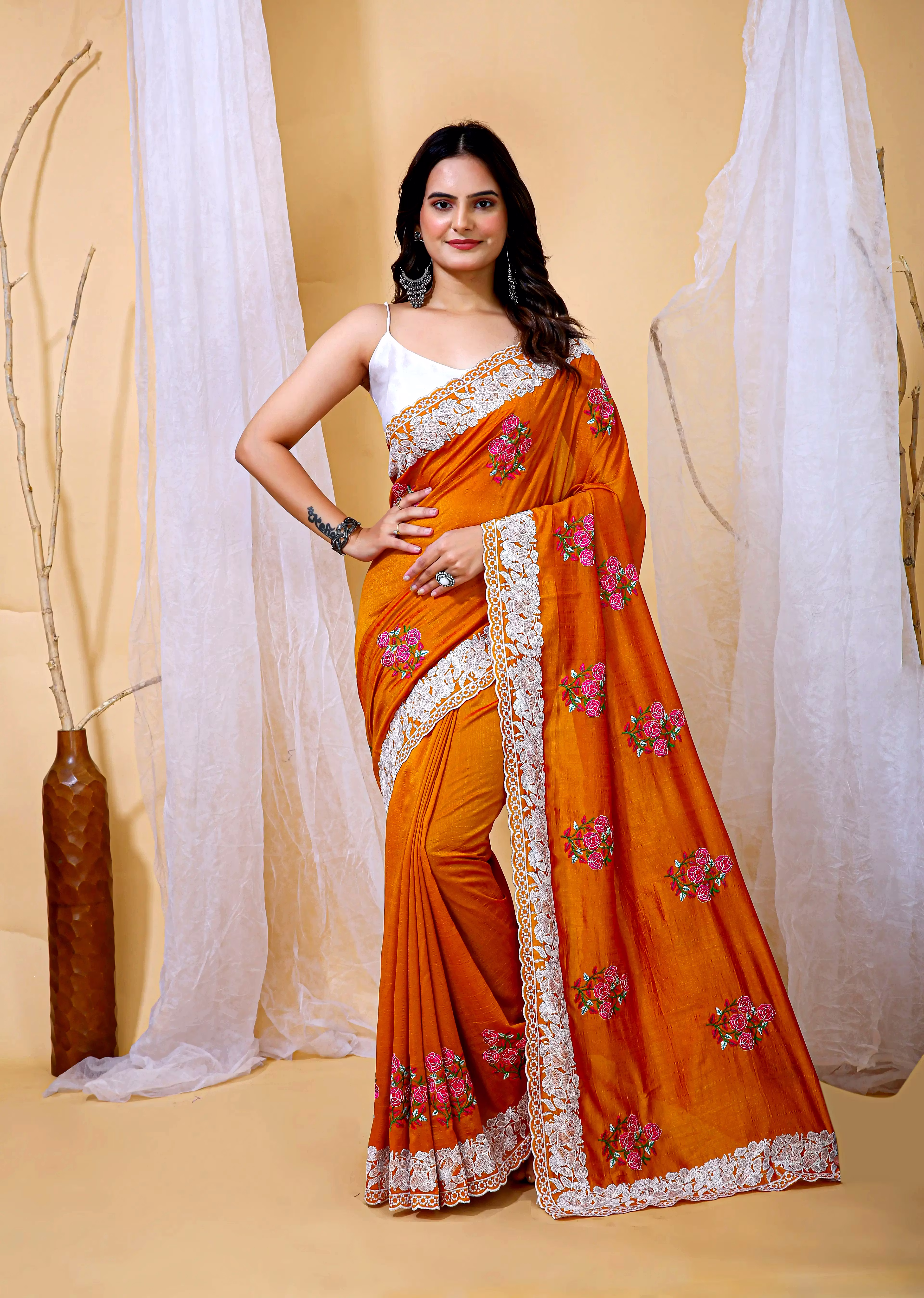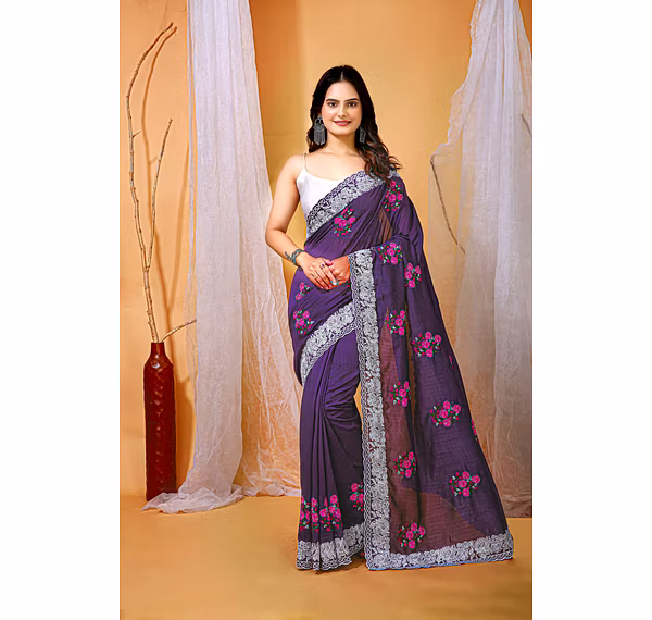 Embrace the unique elegance of our Floral Print Vichitra Silk Saree. Vichitra silk is a marvel of textile engineering, offering the cherished silky sheen of traditional silk without the heavy, often restrictive weight. This high-quality fabric drapes with an unparalleled rich drape, creating a fluid, flattering silhouette that stays perfectly pleated throughout the day. It’s the ultimate choice for those seeking a lightweight silk saree that promises both luxury and manageability. Feel the difference of a saree that is truly easy to wear, ensuring you look exquisitely polished and completely comfortable from the moment you step out.