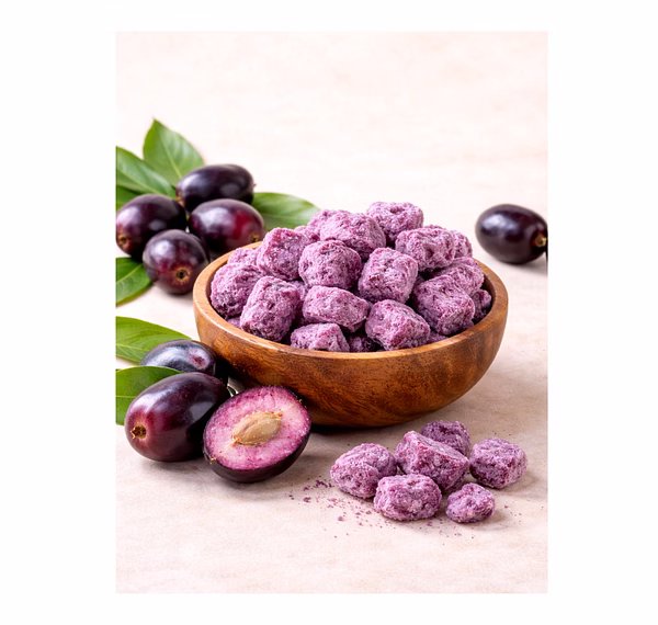 Freeze dried jamun cubes with crunchy texture and tangy taste. Lightweight and easy to store. Suitable for snacking and use in various food applications.
