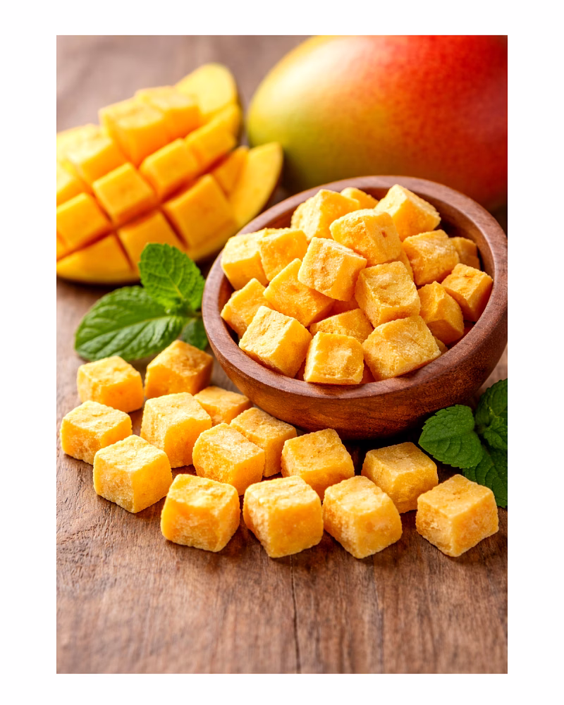 Carefully processed using advanced freeze-drying technology to retain natural flavor, color, and nutrients. These mango cubes have a long shelf life when stored in a cool and dry place, away from direct sunlight and moisture. Packed in airtight, food-grade packaging to ensure freshness and quality. Ideal for use in breakfast cereals, bakery products, smoothies, desserts, and ready-to-eat snacks. No added preservatives or artificial flavors. Suitable for both household consumption and commercial food processing applications.