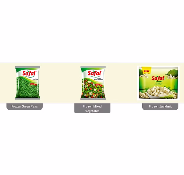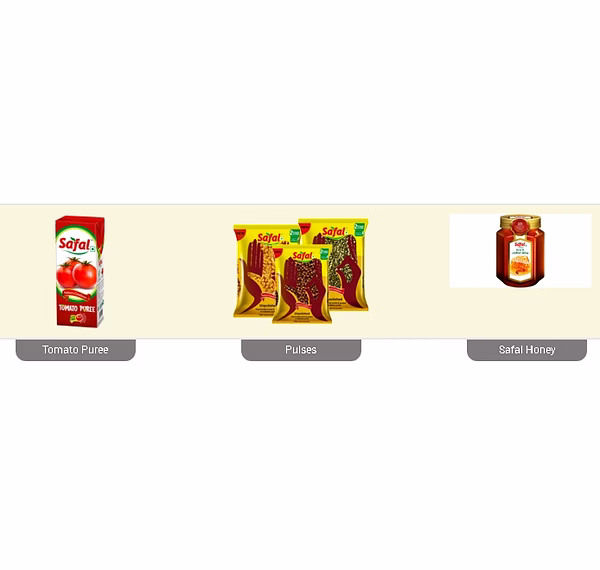 Safal se consacre à la vente au détail de fruits et légumes frais ainsi que de produits à valeur ajoutée tels que les légumineuses non polies, les légumes surgelés, les snacks surgelés, la purée de tomates, le miel.