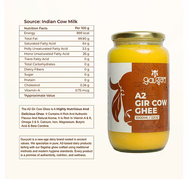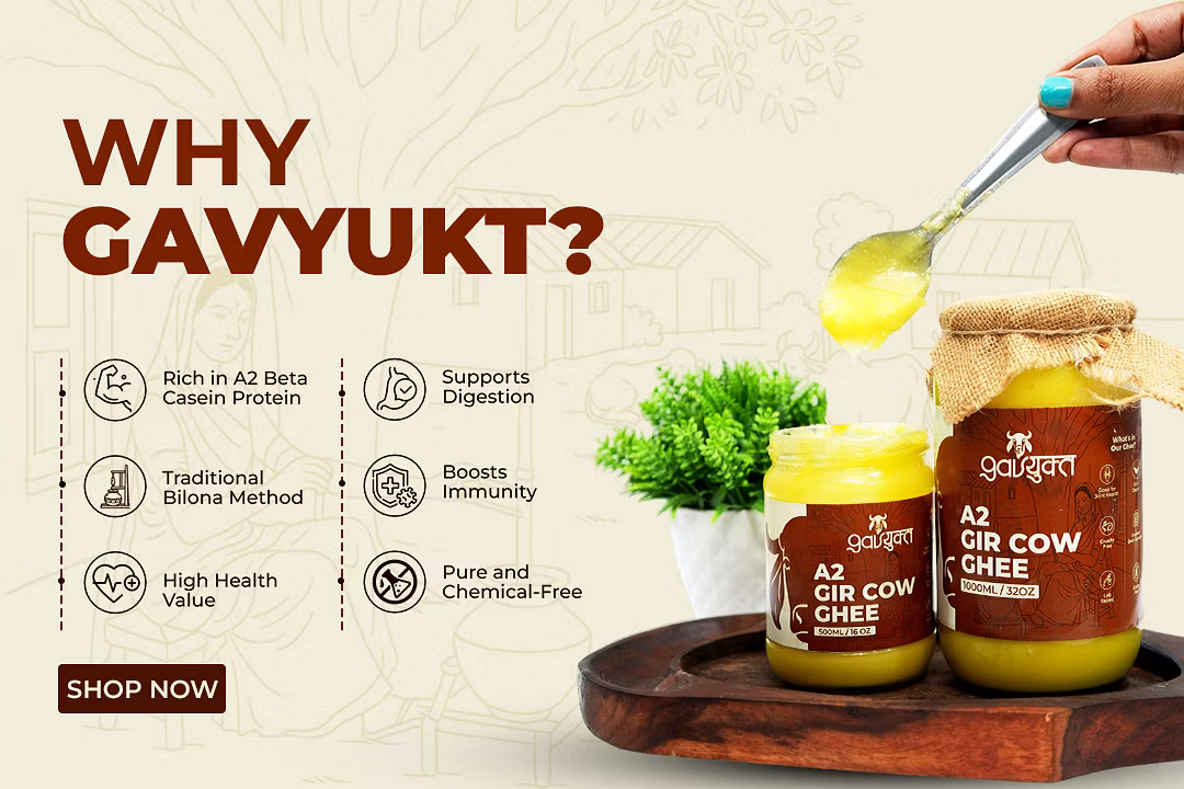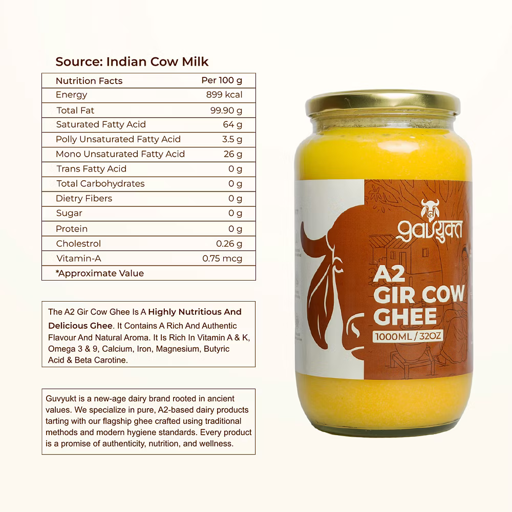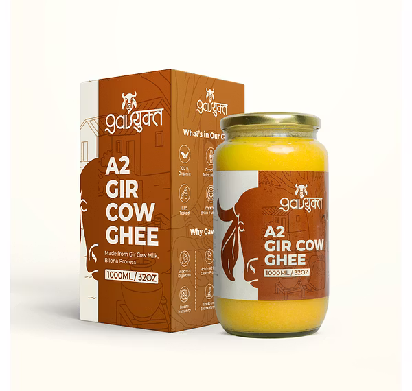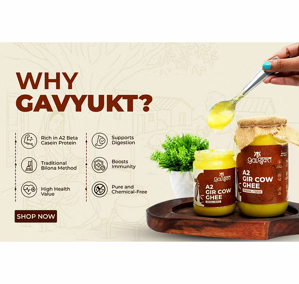 Gavyukt A2 Gir Cow Ghee is a premium-quality, traditional bilona ghee made from the milk of Indian Gir cows. Rich in essential nutrients, it supports digestion, immunity, and overall wellness. Produced with ancient Vedic methods and modern hygiene, this ghee preserves natural aroma and taste. Ideal for cooking, rituals, and daily health routines.