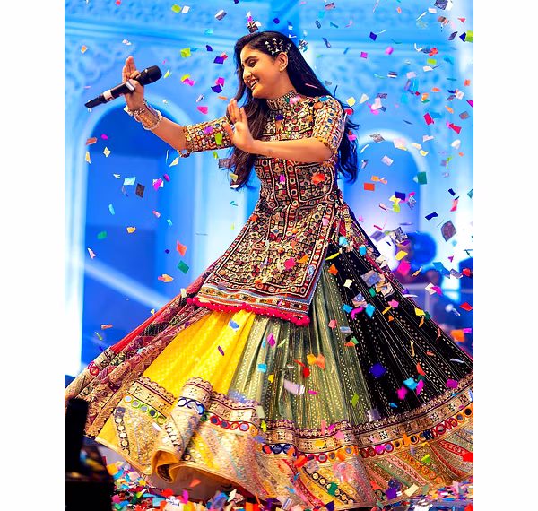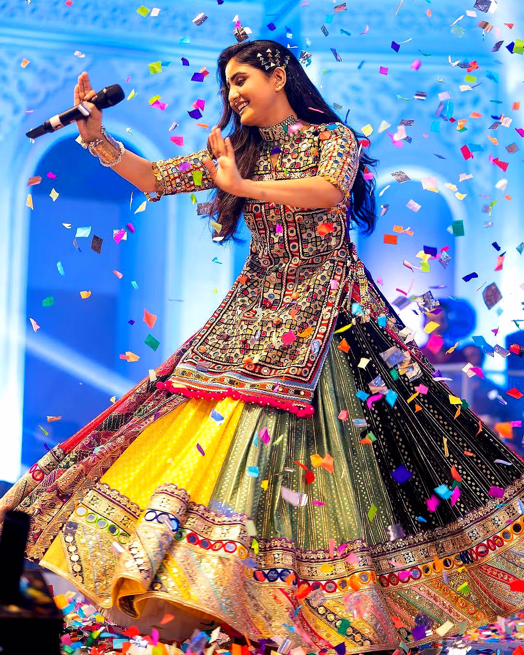 Indulge in the finest craftsmanship with this Navratri-special lehenga choli. Each piece is designed to perfection, combining traditional flair with contemporary style for a show-stopping look.