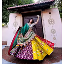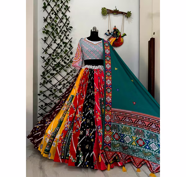 Embrace the festive spirit with the Geeta Rabari Mirror Work Chaniya Choli, meticulously crafted to make you stand out during Navratri celebrations. The vibrant colors and detailed mirror work add a touch of tradition and elegance to your ensemble, ensuring you look and feel your best.