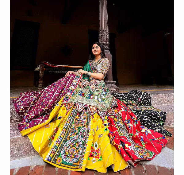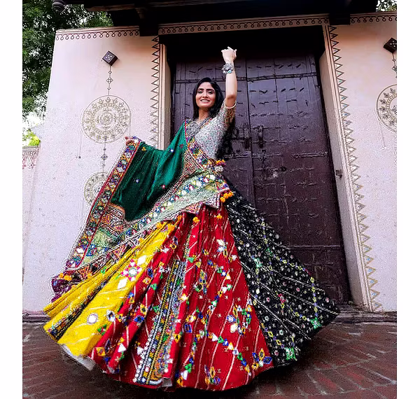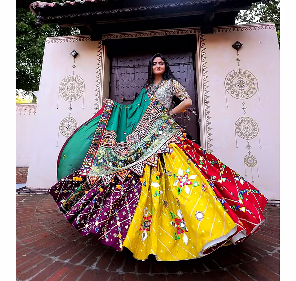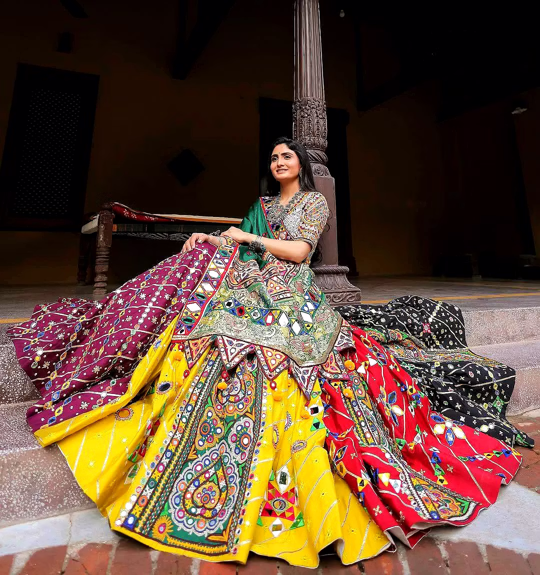 Get ready to dazzle in the Geeta Rabari Mirror Work Chaniya Choli, a beautiful traditional outfit perfect for Navratri celebrations. This stunning ensemble features intricate mirror work and vibrant colors.