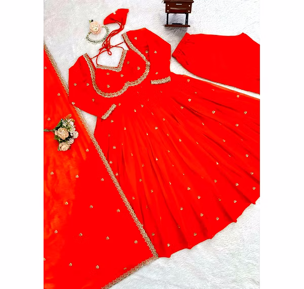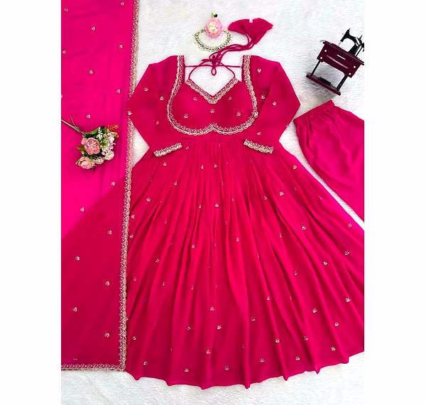The georgette Anarkali suit boasts radiant sequence detailing, catering to women seeking elegance, comfort, and festive shine all in one ensemble. Steal the spotlight with this glamour-rich outfit that is perfect for creating unforgettable memories at every event.
