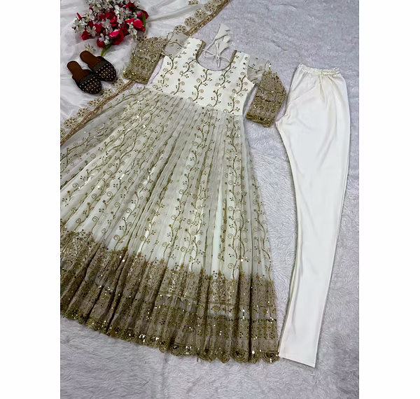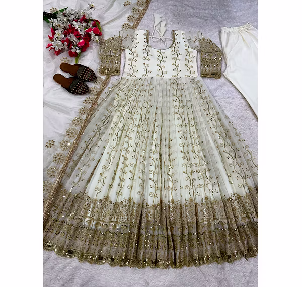 Step into a realm of festive opulence with our Georgette Anarkali Suit, meticulously adorned with all-over sequence embroidery. The intricate details exude glamour, making you the center of attention at any celebration.
