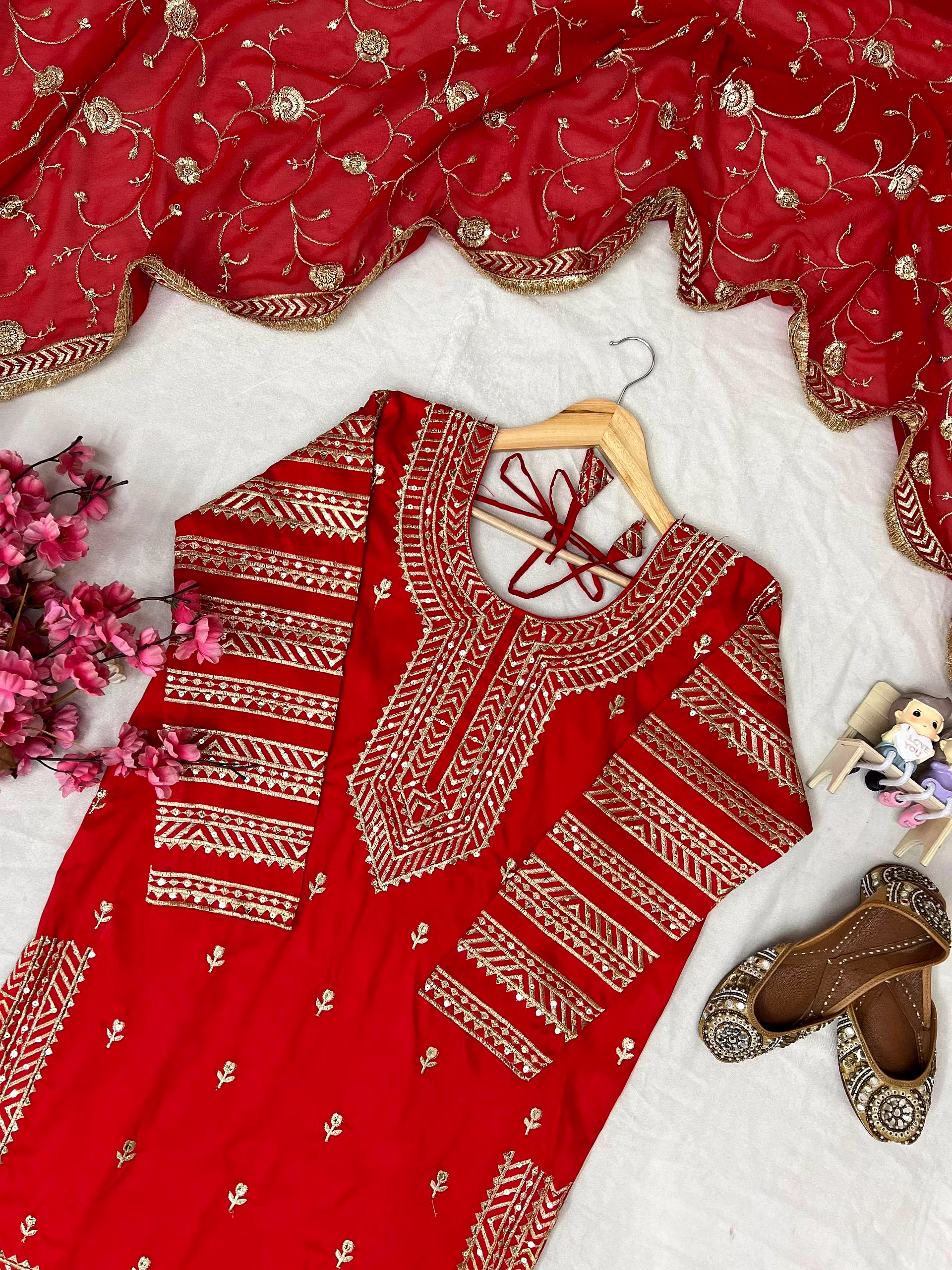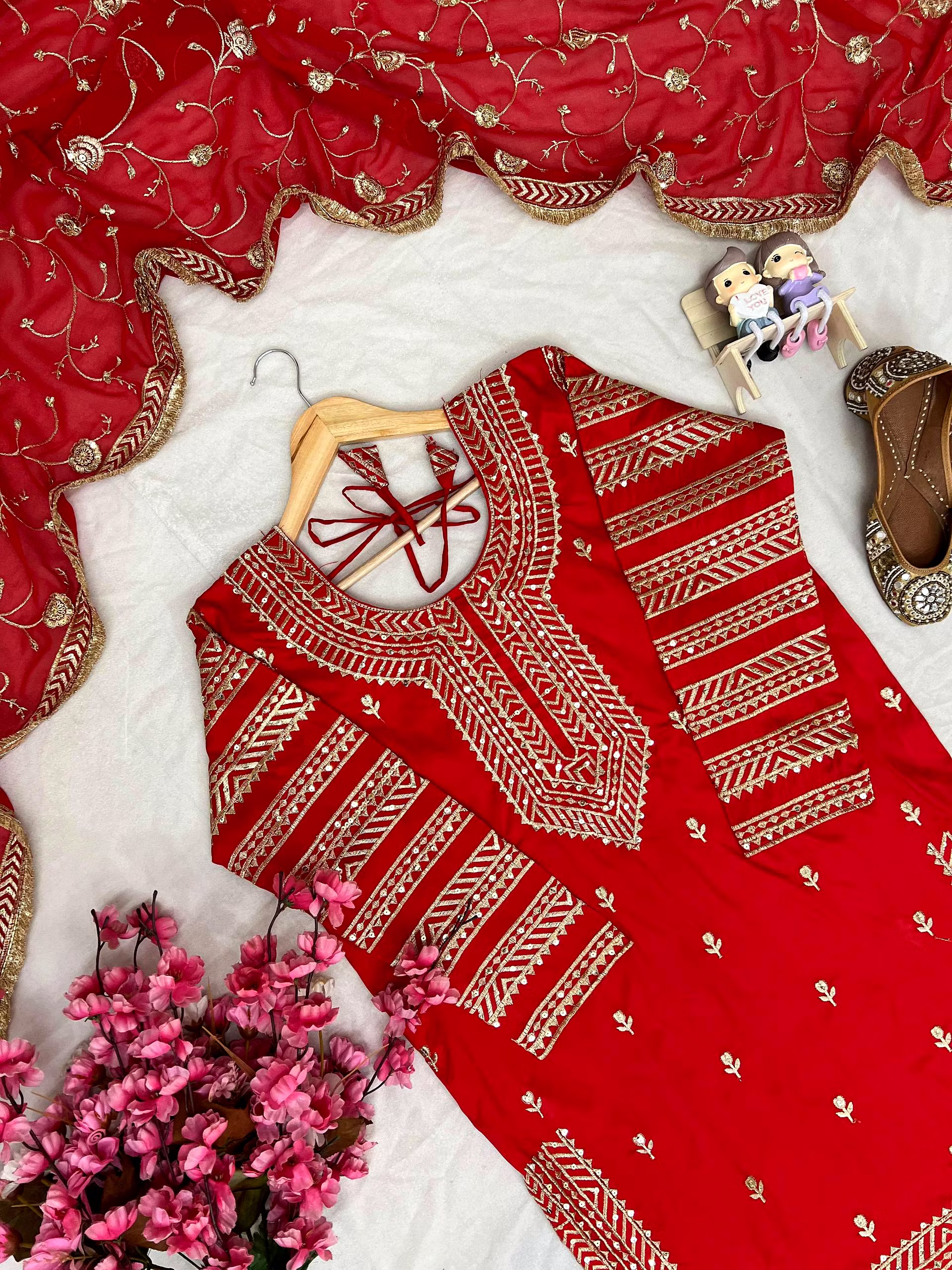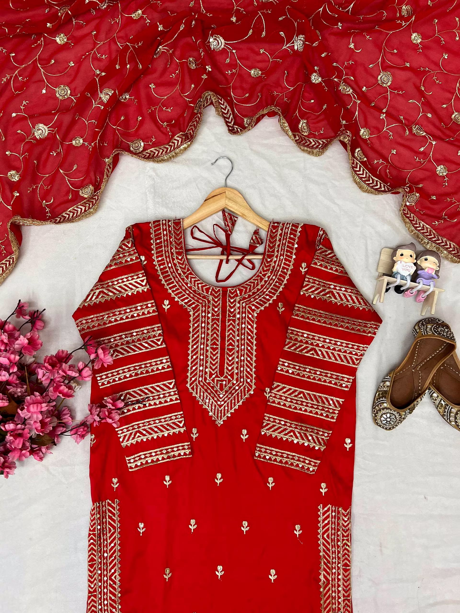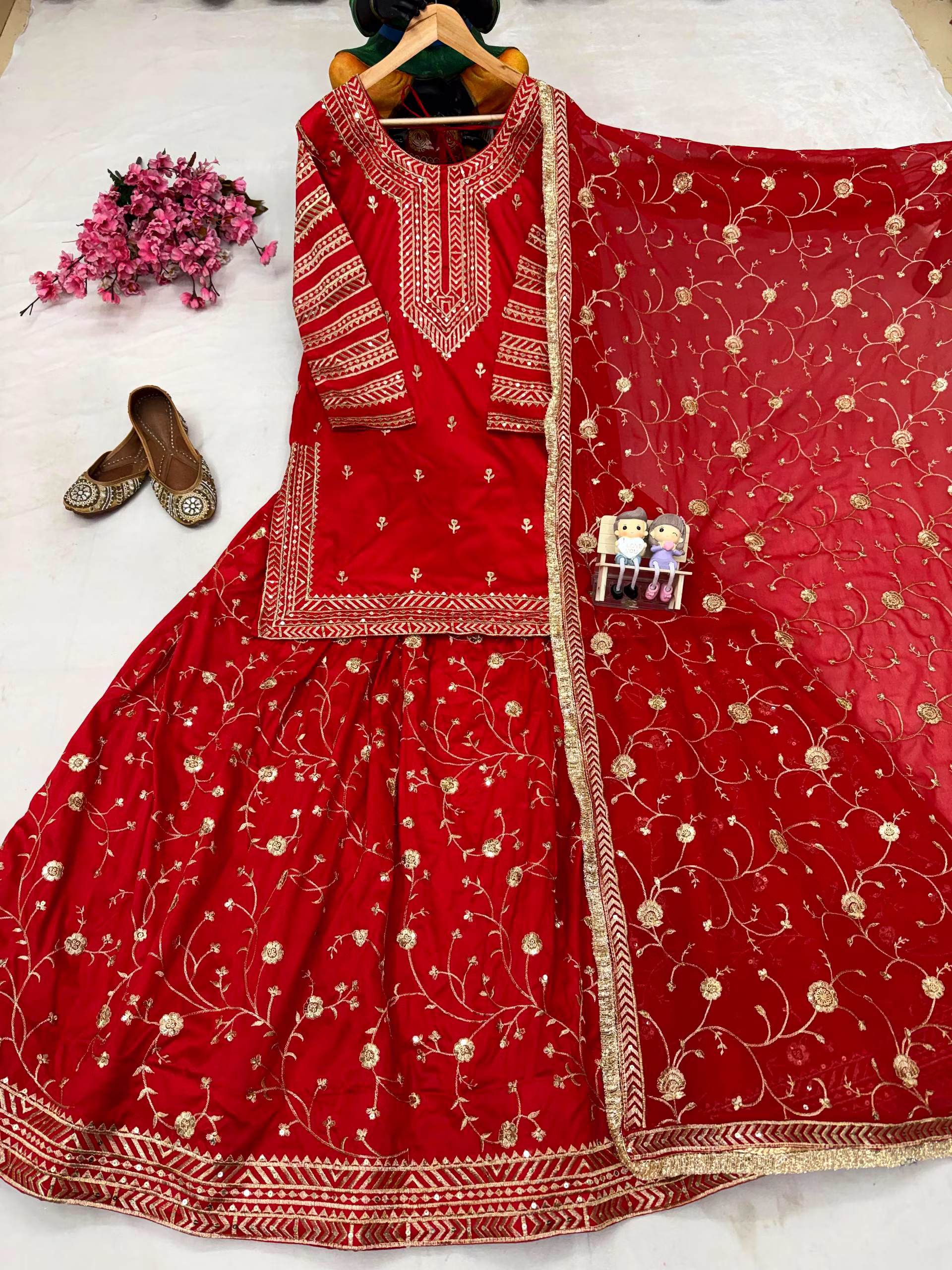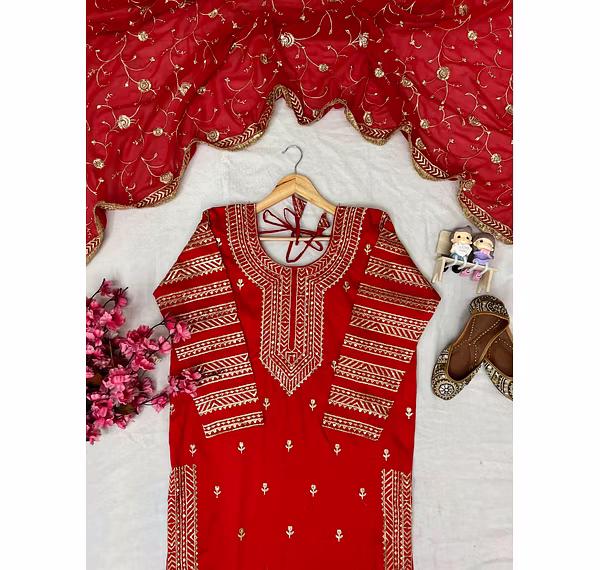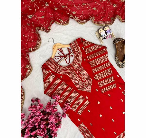 Make a statement at any event with this Georgette Red Kurti Lehenga crafted to perfection. The intricate embroidery and attention to detail will leave you feeling like a star.