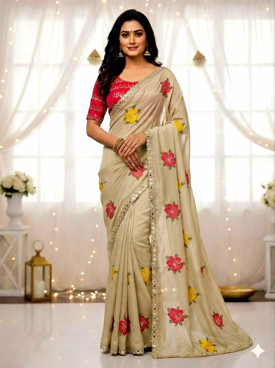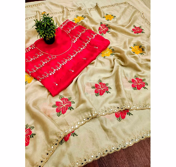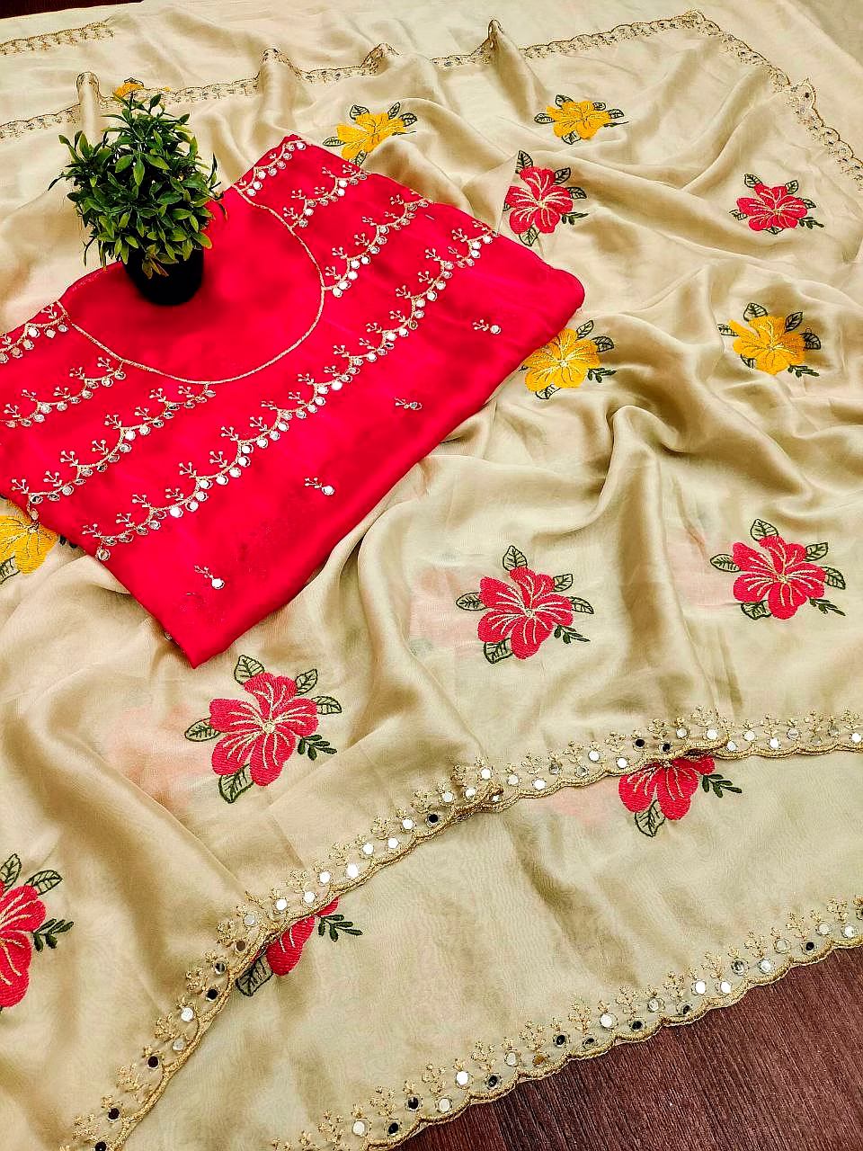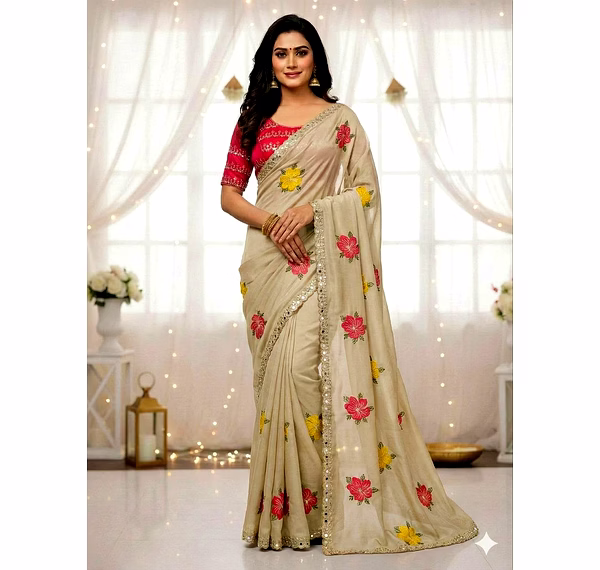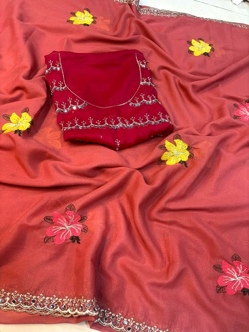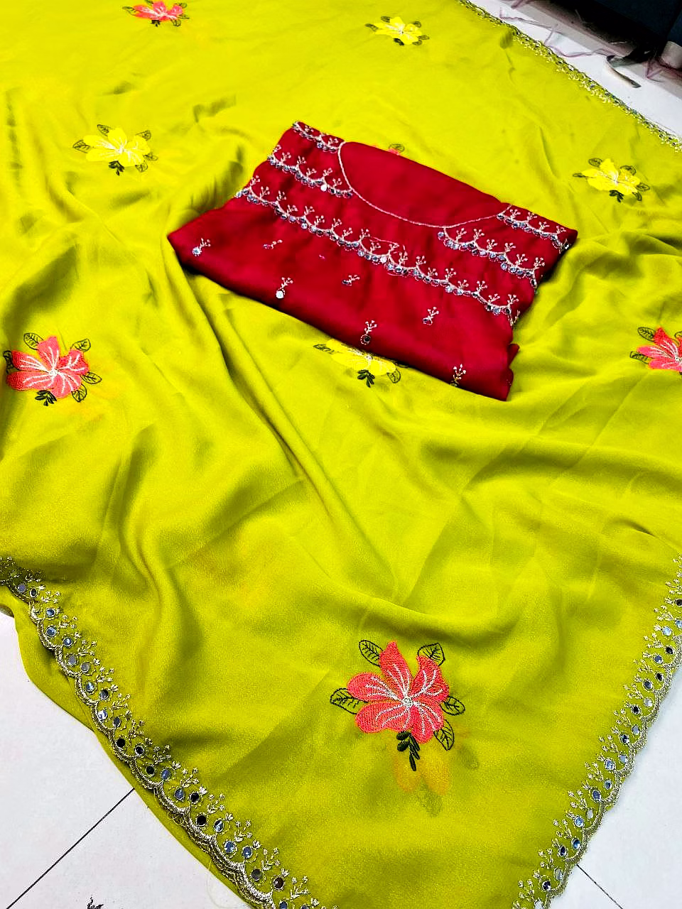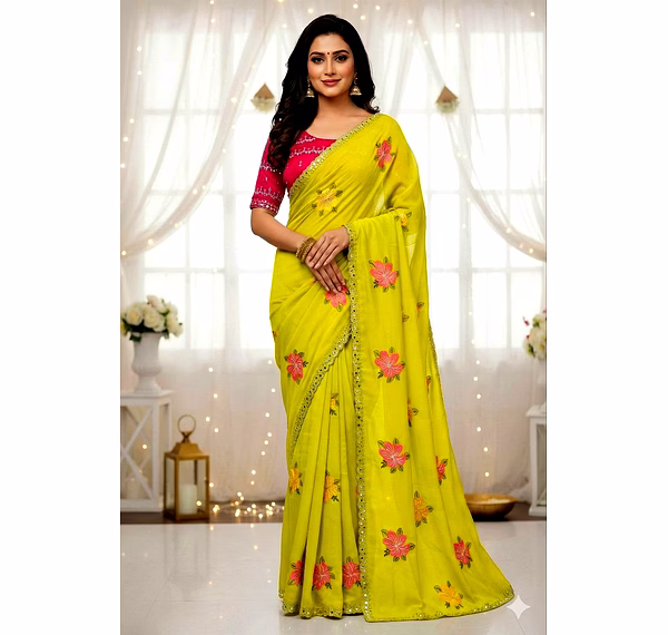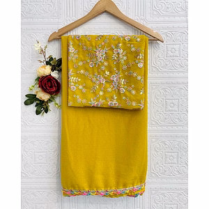 Step into the spotlight with our Georgette Saree with Mirror Work that exudes timeless elegance. The delicate embroidery and mirror work add a touch of sophistication, making it a perfect choice for special occasions.