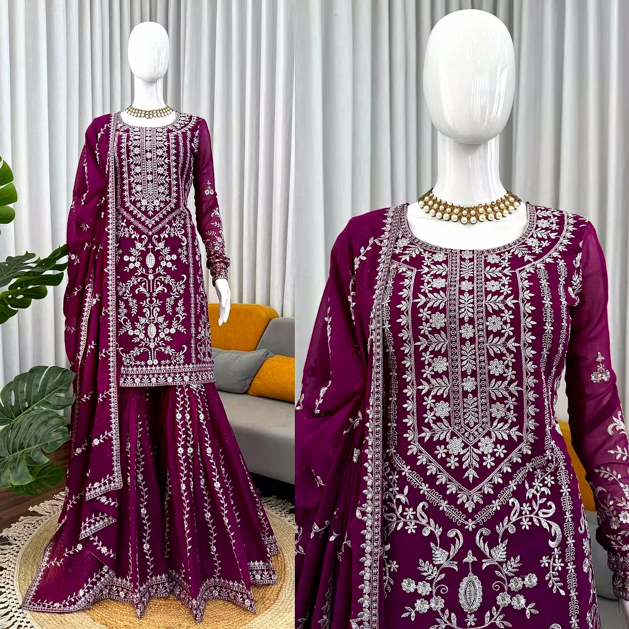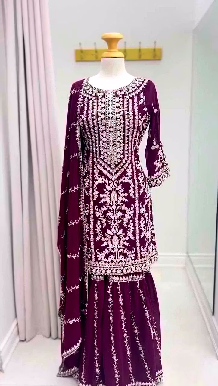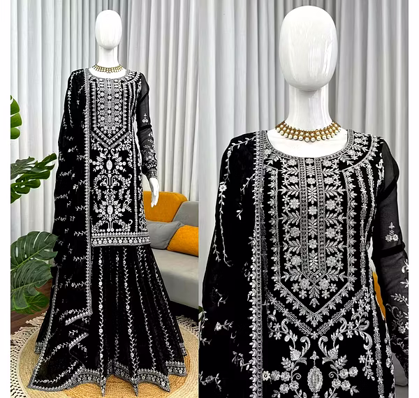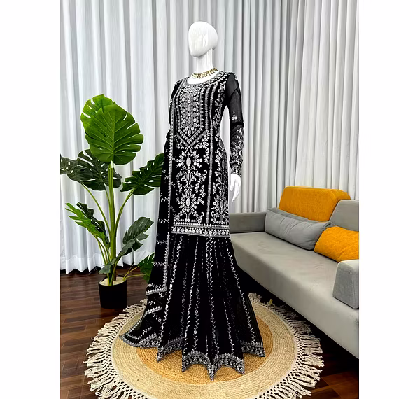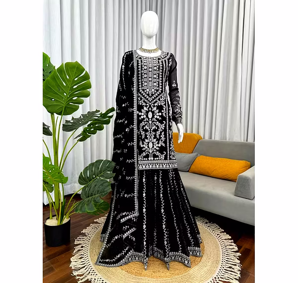 Elevate your style with our Georgette Sharara Suit featuring intricate sequence work. This ensemble exudes elegance and sophistication, perfect for special occasions.
