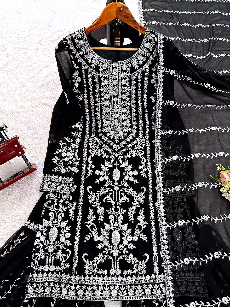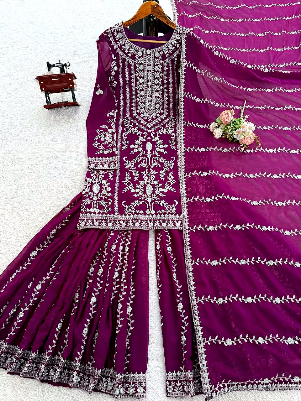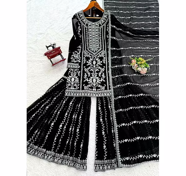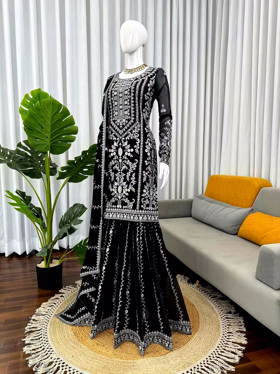 Elevate your style with our Georgette Sharara Suit featuring intricate sequence work. This ensemble exudes elegance and sophistication, perfect for special occasions.