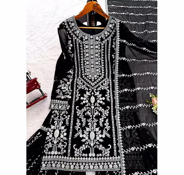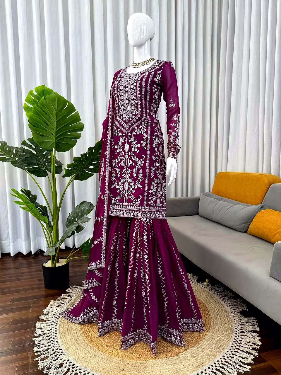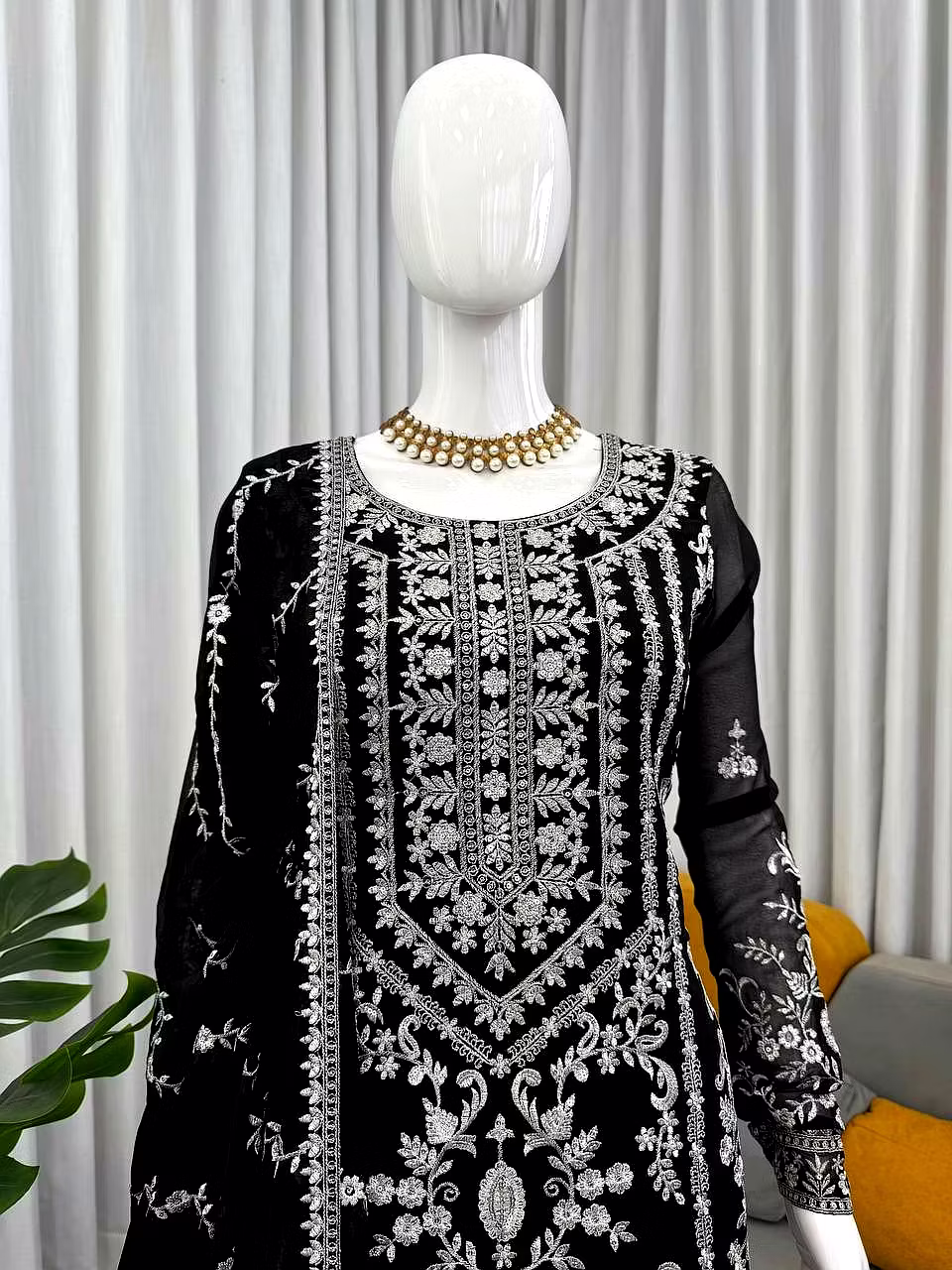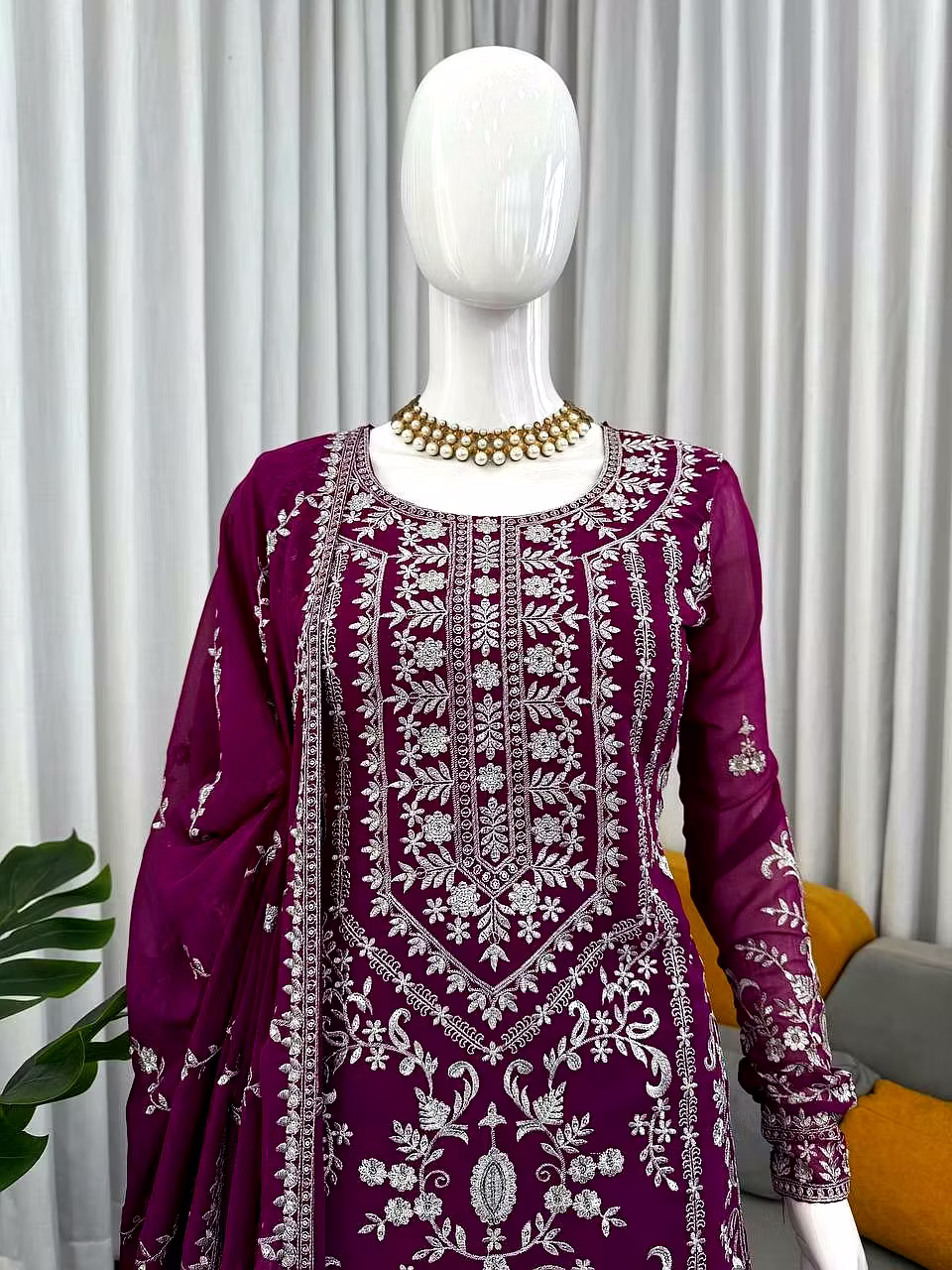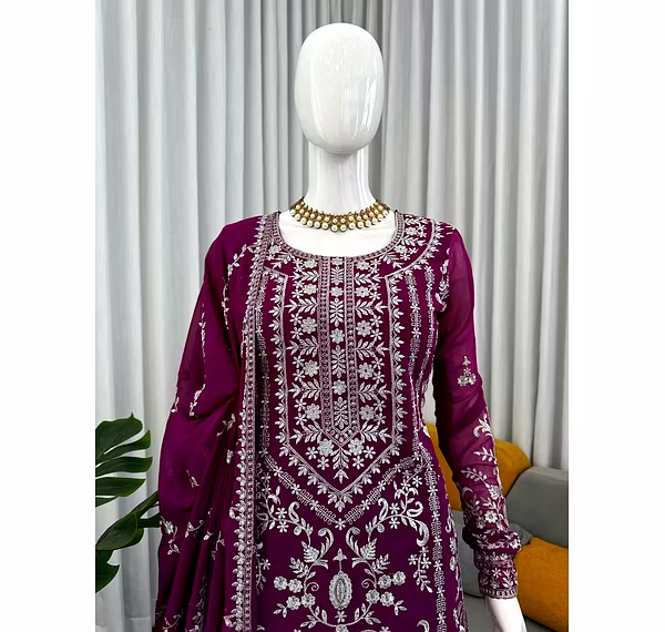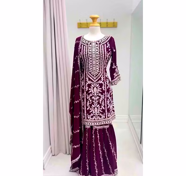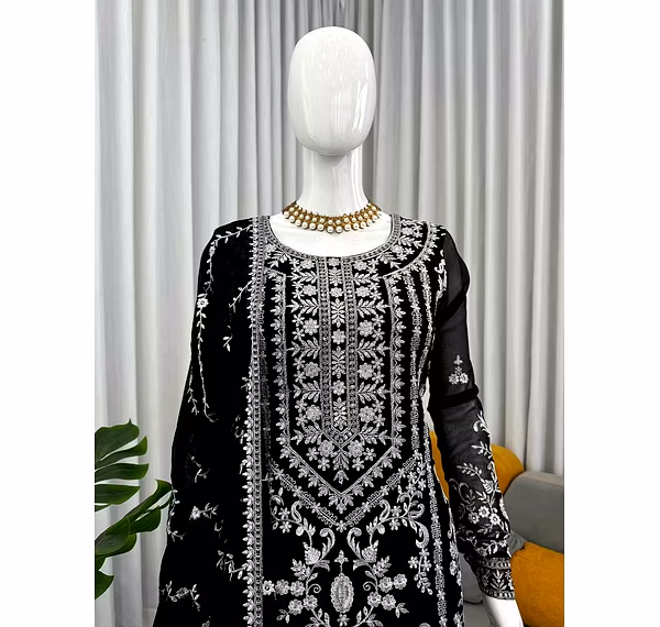 With its timeless appeal and versatile nature, this Georgette Sharara Suit seamlessly transitions from formal events to festive celebrations. The flowing silhouette and modern design elements offer a blend of traditional charm and contemporary style, making it a wardrobe essential.