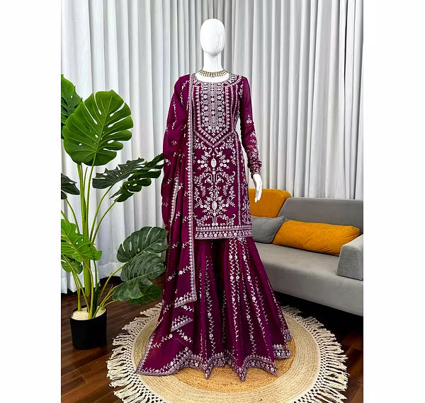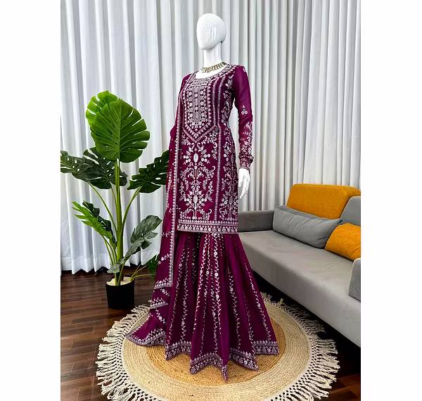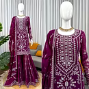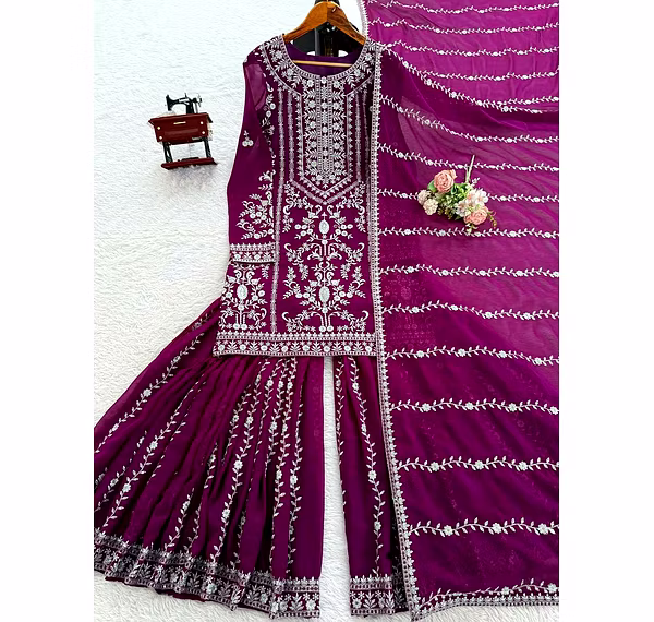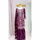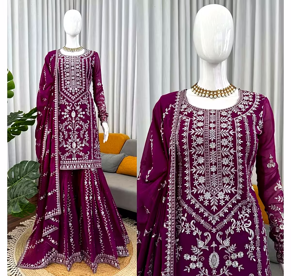 Indulge in the beauty of georgette fabric adorned with dazzling sequence work, creating a stunning look that captivates attention. The intricate design and fine craftsmanship make this Sharara suit a must-have for those who appreciate luxury.