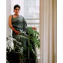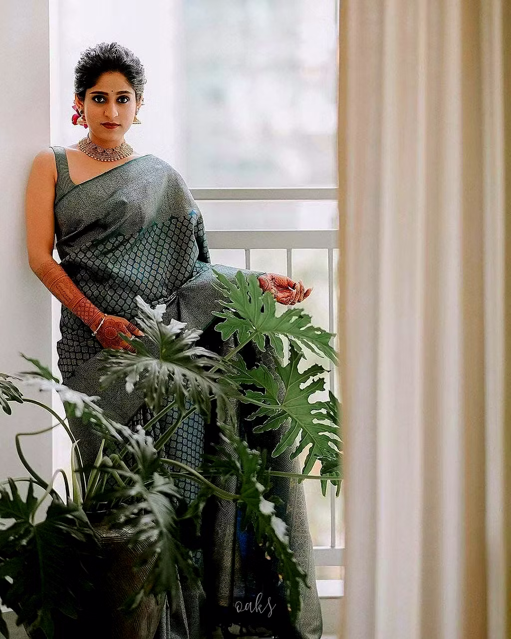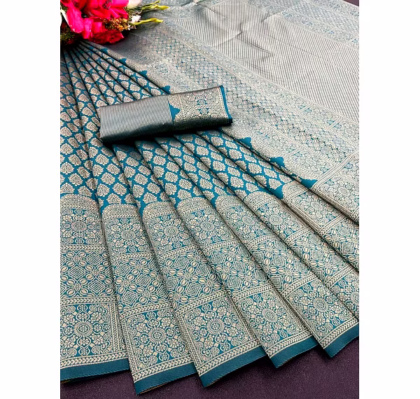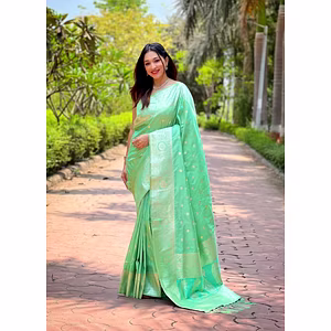 Indulge in the beauty of this Green Banarasi silk saree meticulously designed with intricate Silver Zari work, a symbol of timeless artistry and elegance.