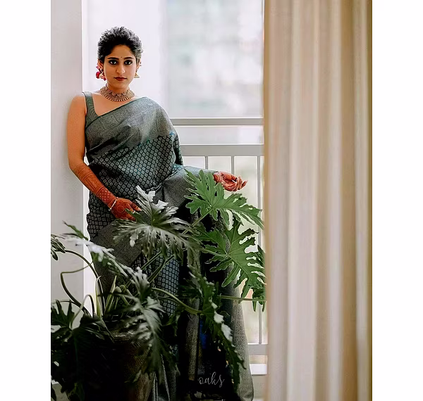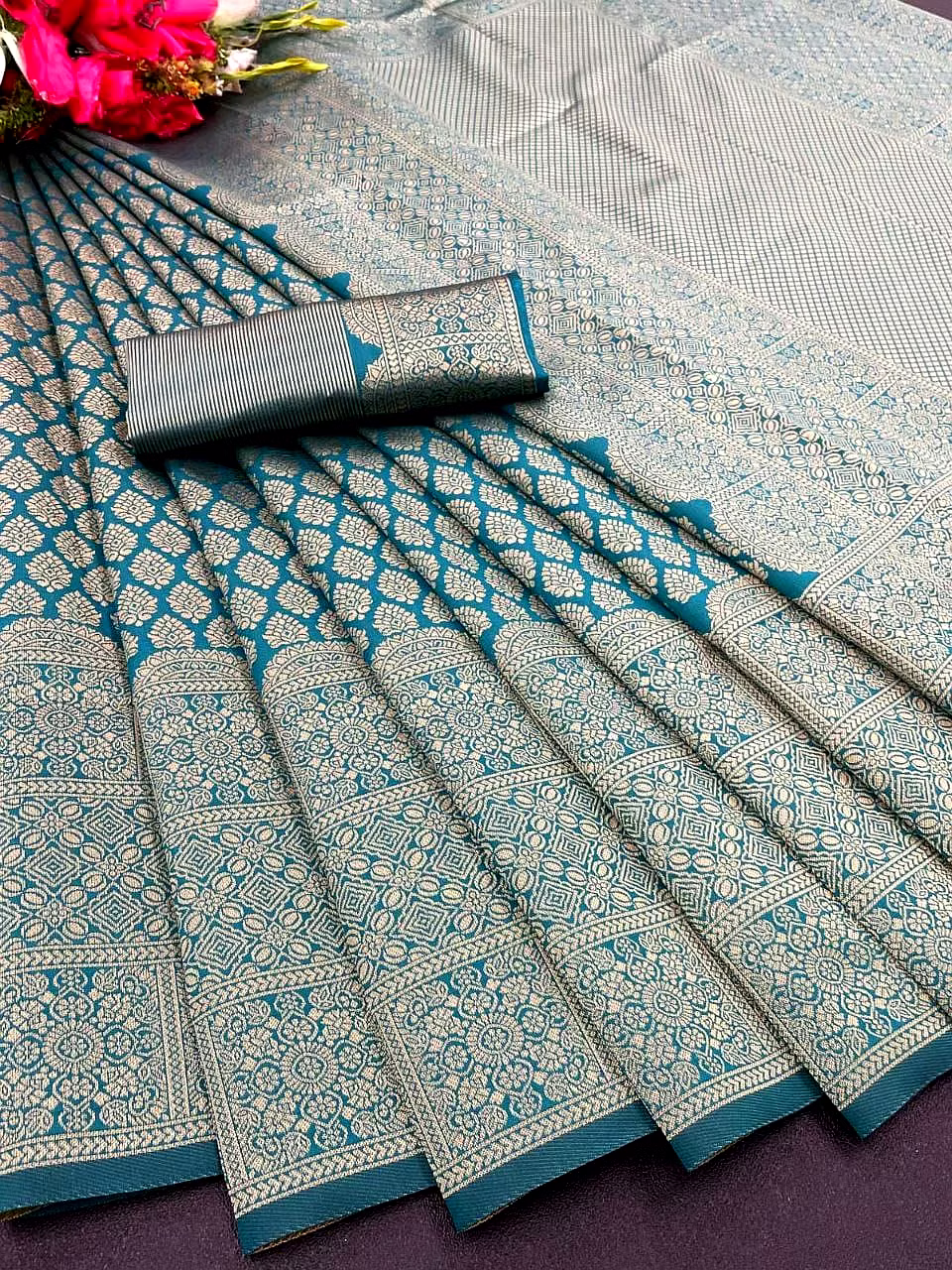 Elegance meets tradition with our Green Color Soft Banarasi Silk Saree featuring exquisite silver Zari work. Perfect for weddings or special occasions.