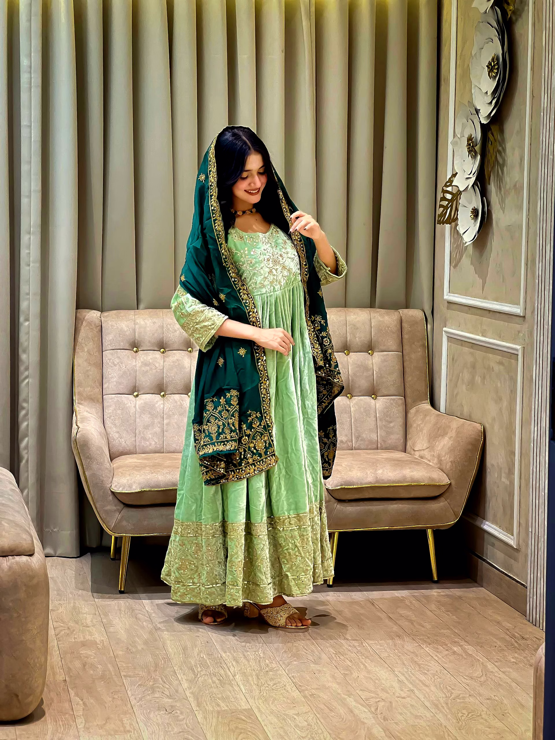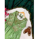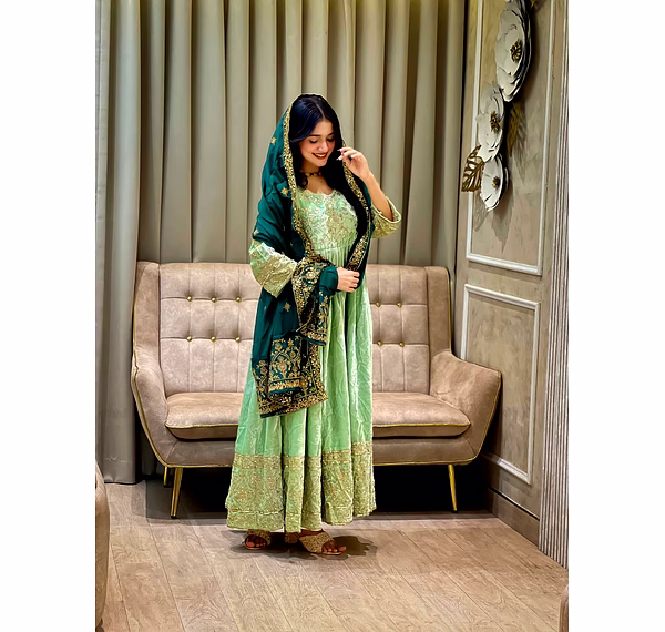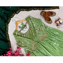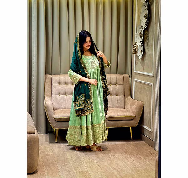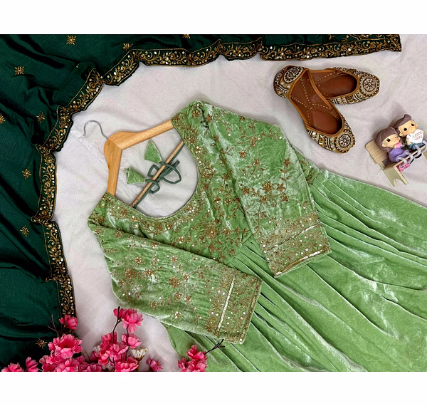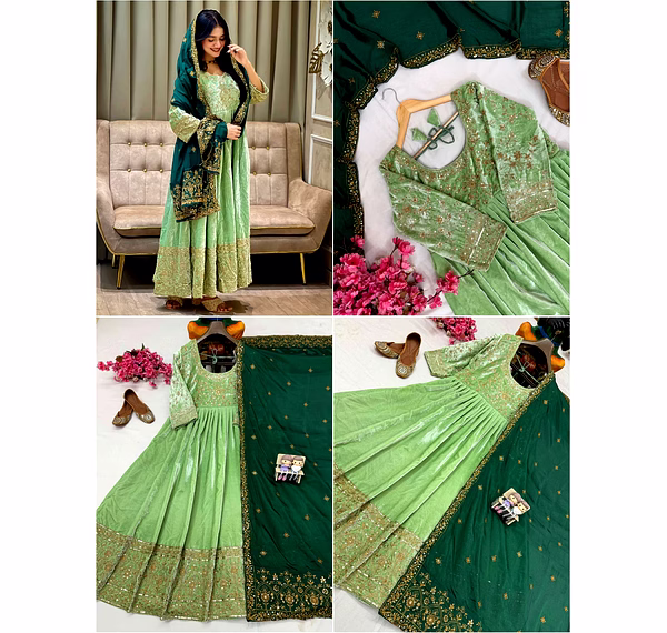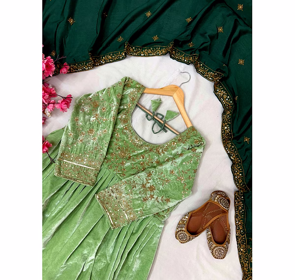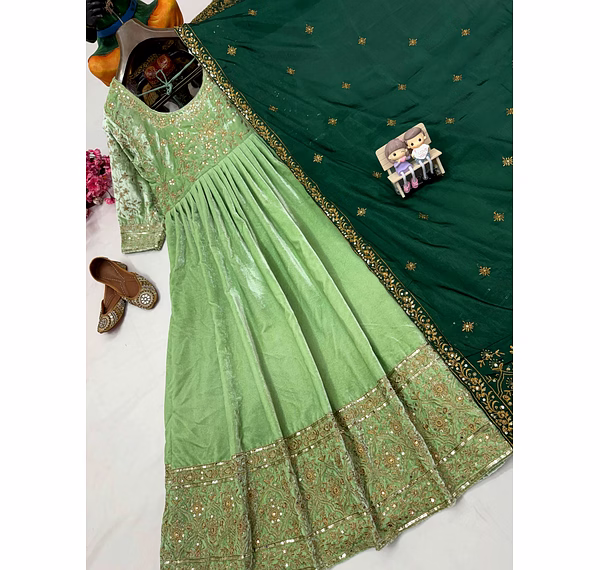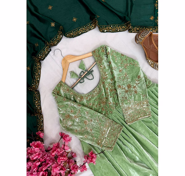 Make a bold style statement with this Green Velvet Gown with Sequence Work, designed to bring out elegance, confidence, and festive charm. Crafted from premium velvet fabric, this gown offers a rich texture, soft feel, and graceful drape that enhances your silhouette beautifully.