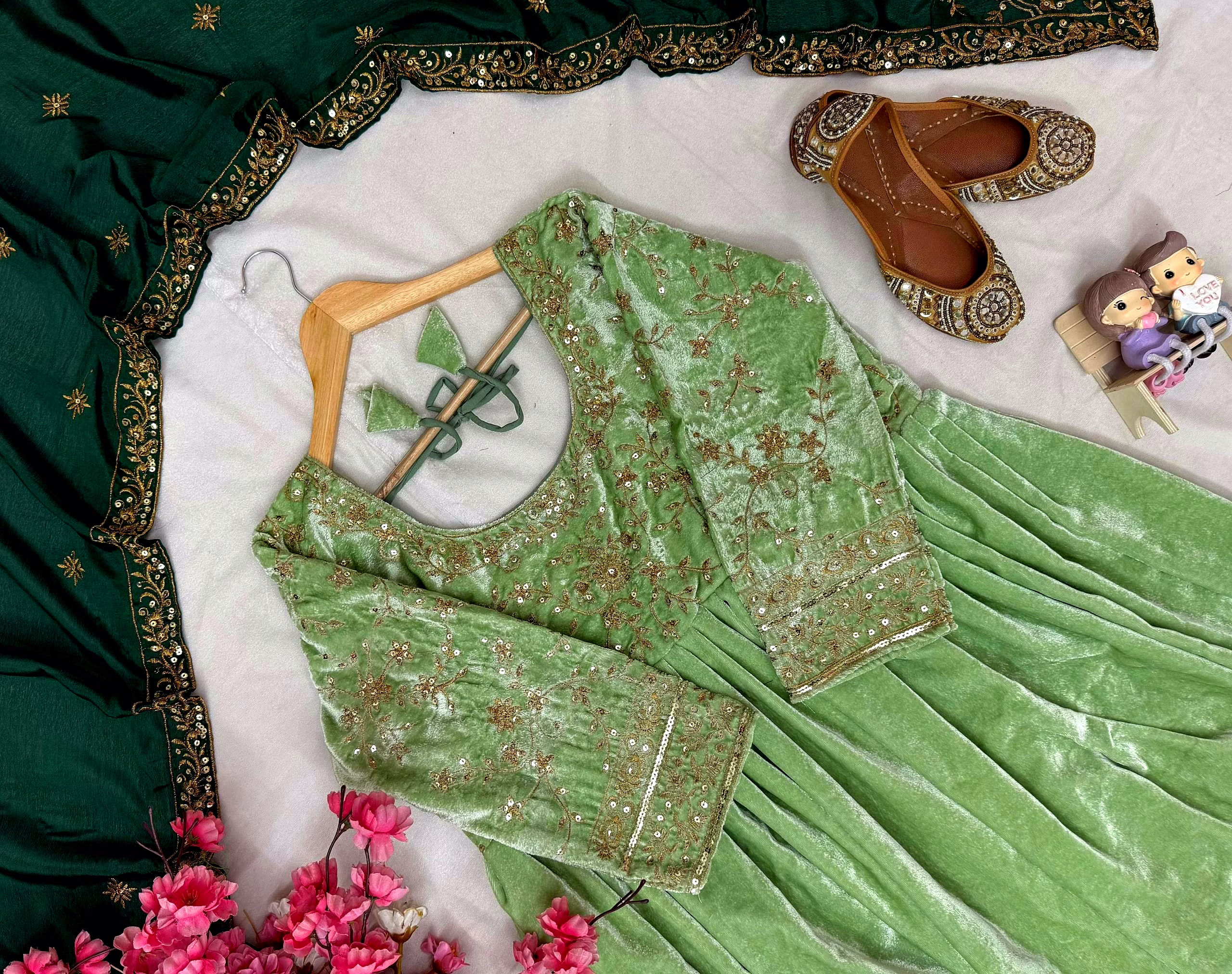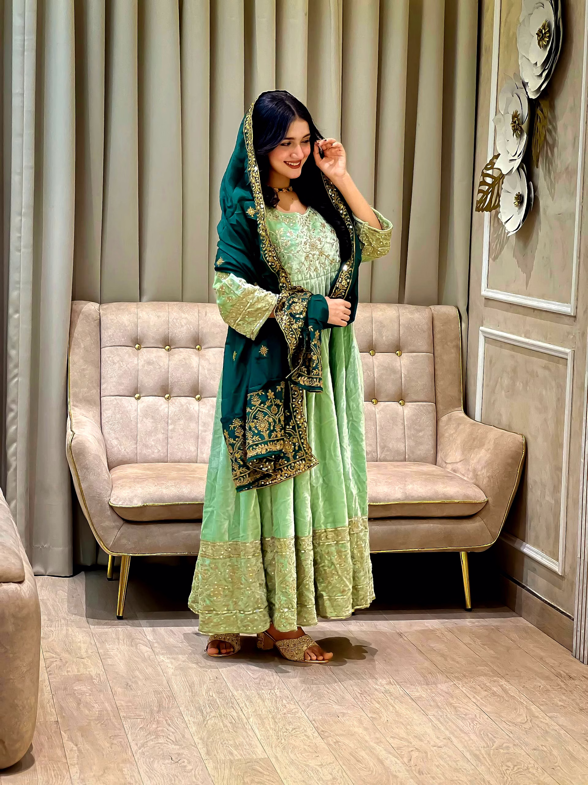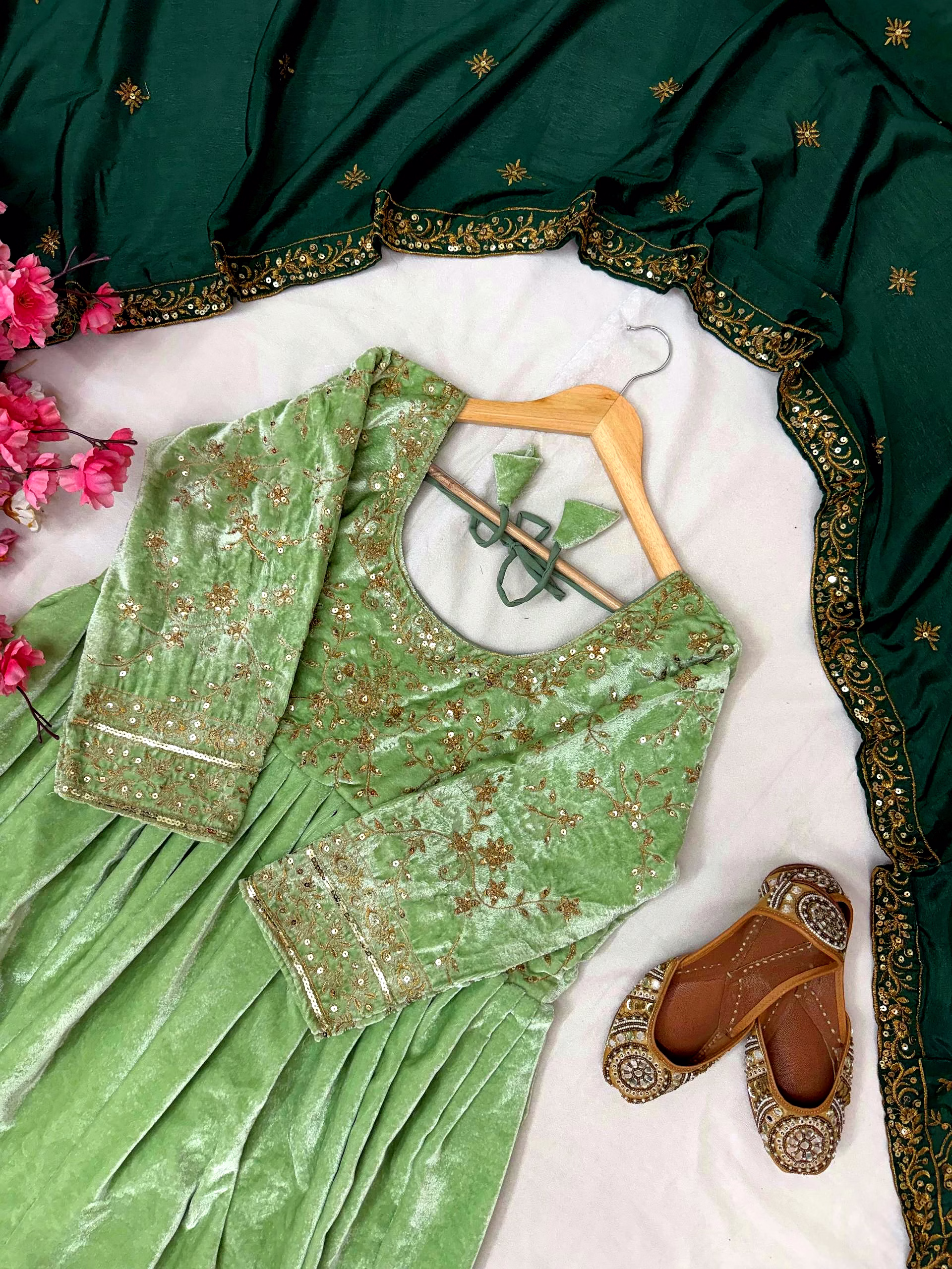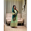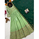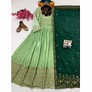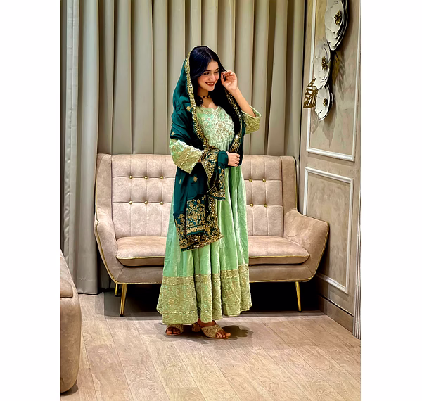 Make a bold style statement with this Green Velvet Gown with Sequence Work, designed to bring out elegance, confidence, and festive charm. Crafted from premium velvet fabric, this gown offers a rich texture, soft feel, and graceful drape that enhances your silhouette beautifully.
