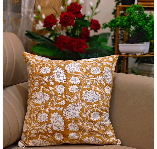 Handcrafted cushion cover made from 100% cotton, featuring traditional hand block printing by skilled artisans. The reversible design provides two usable sides, suitable for regular use in home décor and hospitality applications.