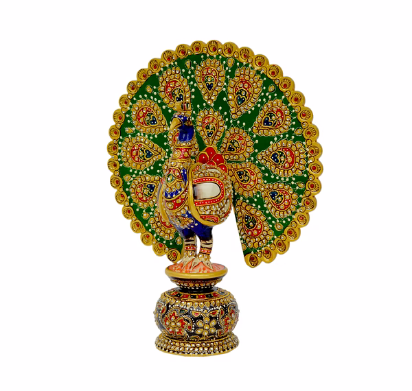 The vibrant hues of green, red, blue, and gold are brought to life through skilled hand-painting, while embedded stones add a touch of regal elegance.