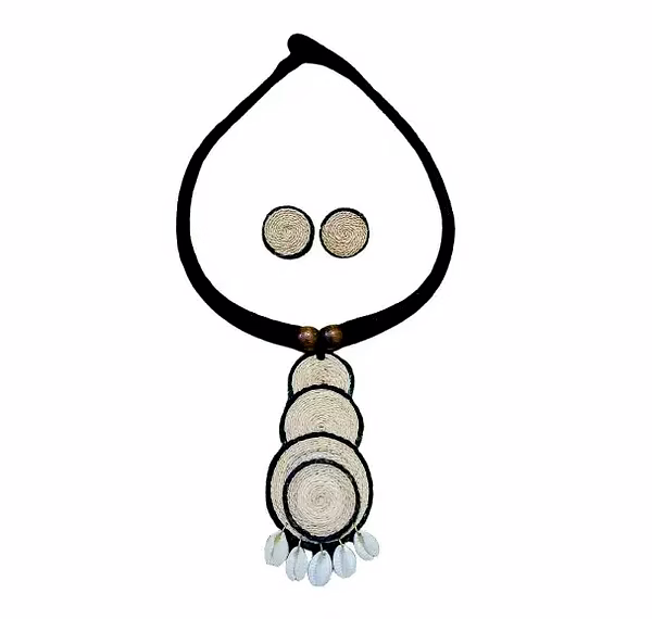 This elegant Handcrafted Banana Fibre Jewelry Set is a fine example of traditional craftsmanship from Uttar Pradesh, India. Designed with concentric circular motifs and adorned with natural cowrie shells, this set brings together earthy charm and artistic finesse.