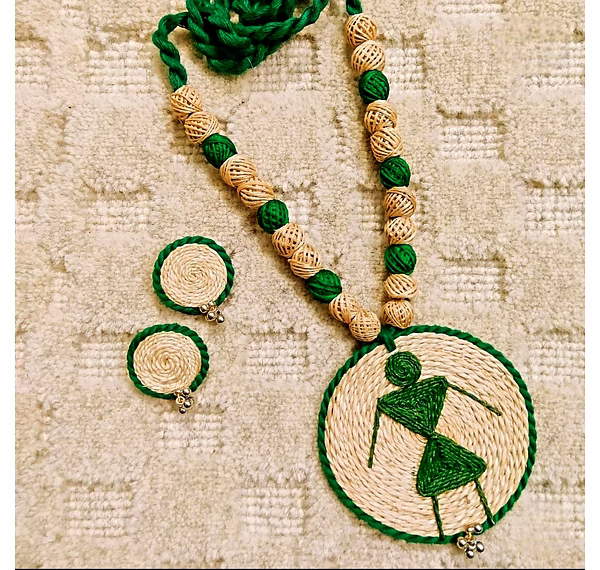 Celebrate Indian artistry with this Handcrafted Banana Fibre Jewelry Set, skillfully made by artisans in Uttar Pradesh, India. This eco-friendly jewelry set features a striking tribal motif pendant paired with matching earrings, all crafted from natural banana fibre and hand-dyed green thread.