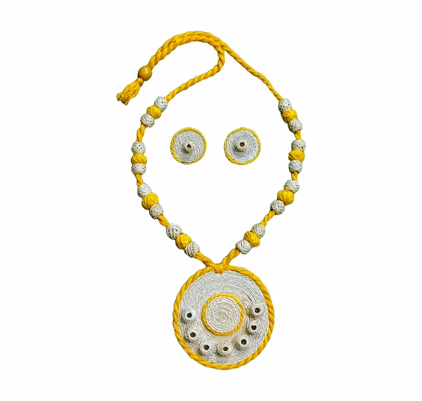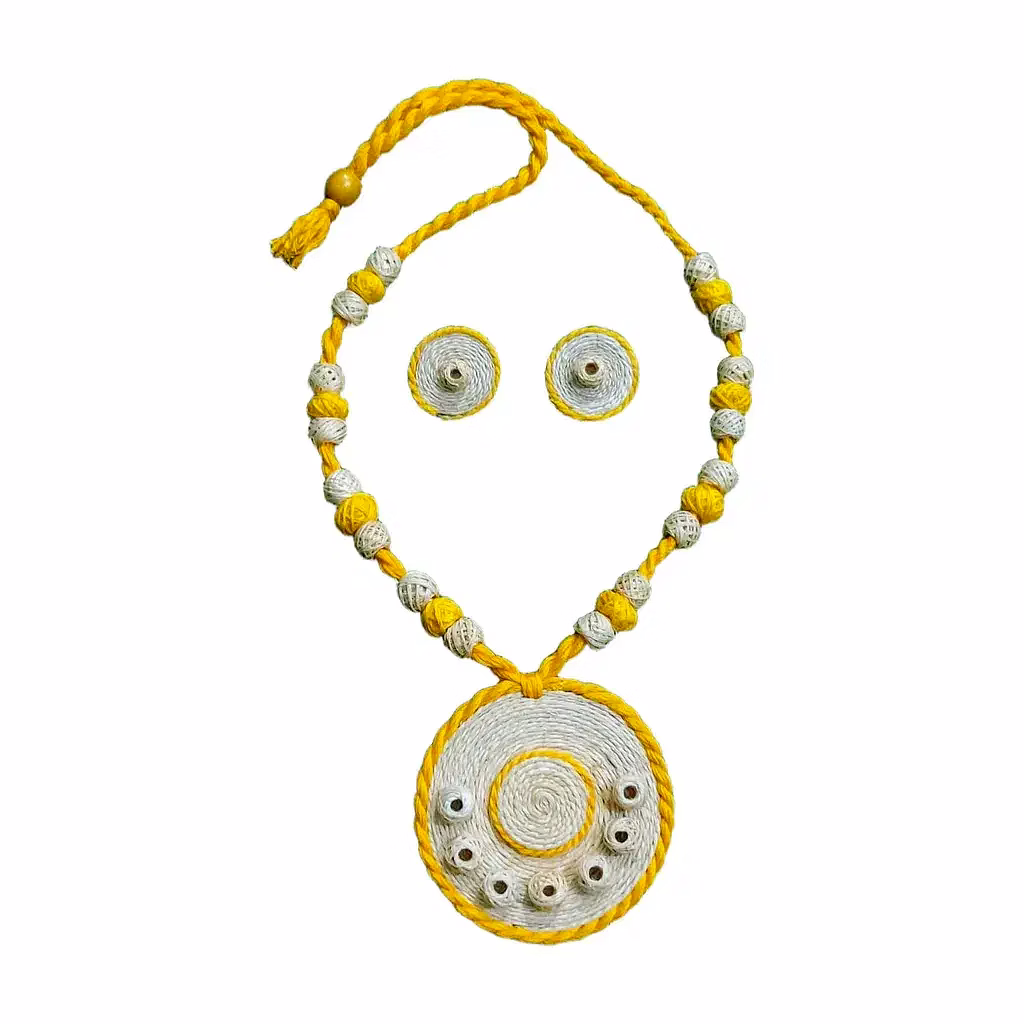 Celebrate sustainable fashion with this beautifully handcrafted banana fibre jewelry set, made by skilled artisans from Uttar Pradesh, India. This elegant set features a round pendant necklace with matching earrings, woven from natural banana fibre and highlighted with cheerful yellow threads that bring a bright, contemporary charm to traditional craftsmanship.
