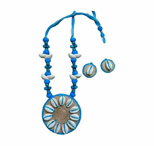 Add a touch of coastal charm to your look with this Handcrafted Banana Fibre Jewelry Set, beautifully made by skilled artisans from Uttar Pradesh, India. This exquisite piece features a round pendant and matching earrings, detailed with natural cowrie shells and vibrant blue beads that highlight the earthy texture of banana fibre.
