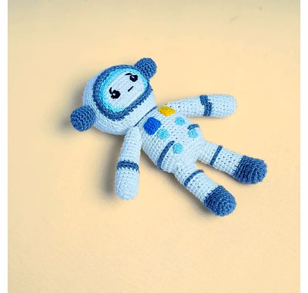 Blast off into imagination with this adorable crochet astronaut stuff toy, intricately made using the amigurumi technique. Each piece is handcrafted with care, giving it a unique character that’s perfect for both playtime and décor. Detailed with a charming helmet, expressive eyes, and stitched suit accents, this plush toy is a delightful companion for storytime, space-themed nurseries, or collector displays. Sized perfectly for tiny hands to grasp, hold, and carry making it an ideal travel buddy or bedtime friend.
